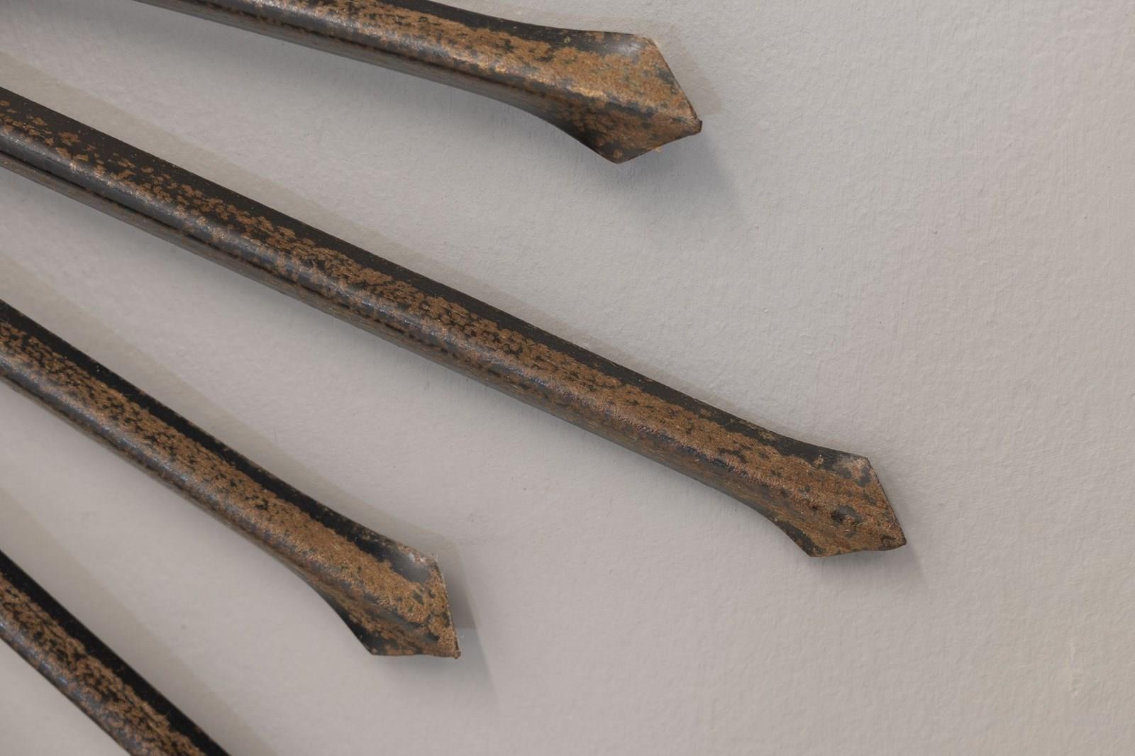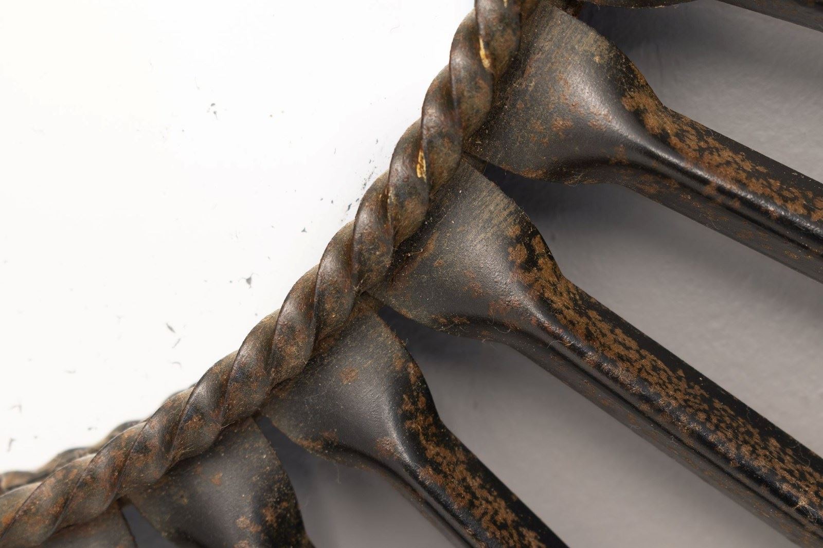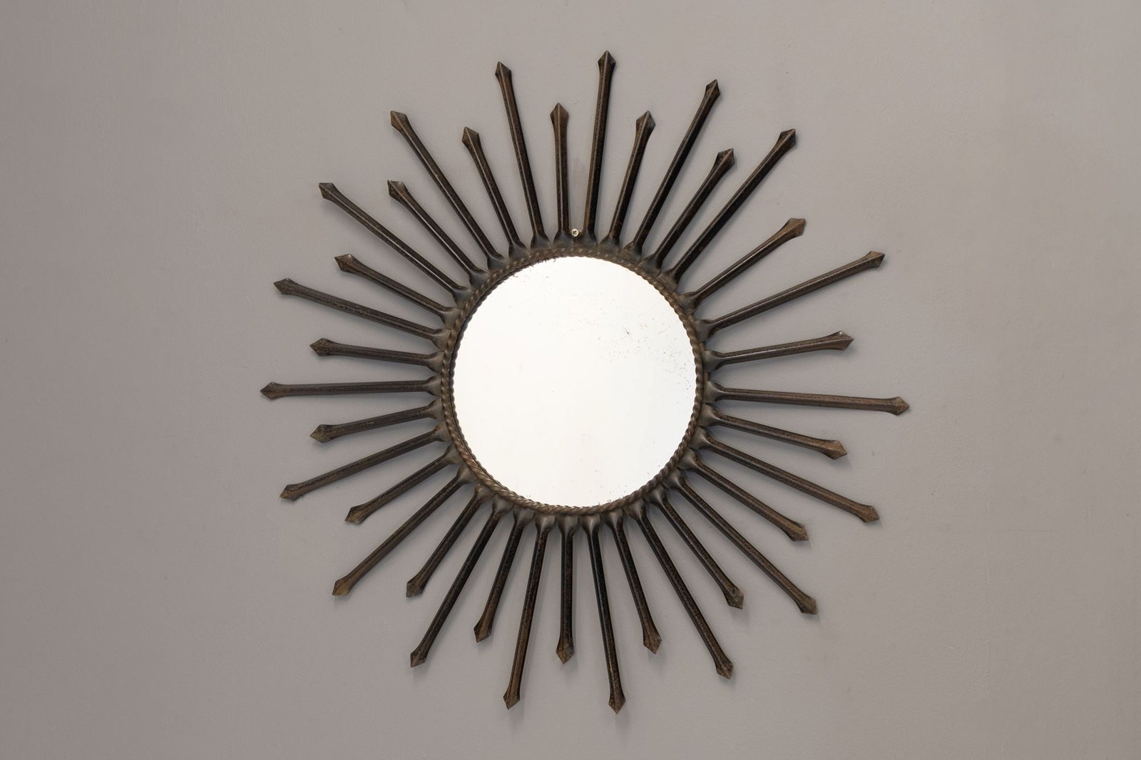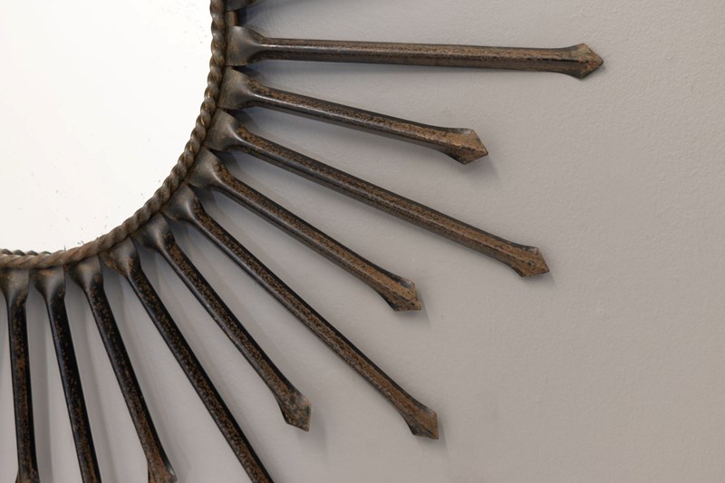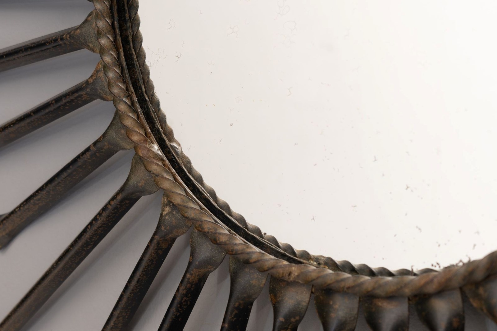 Steel sunburst mirror with original glass and black paint finish. Circa 1950