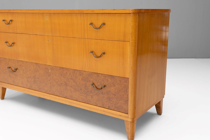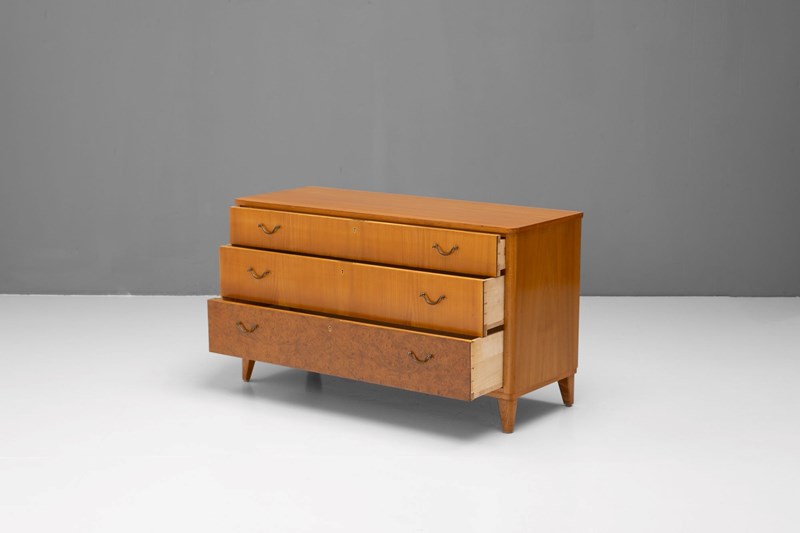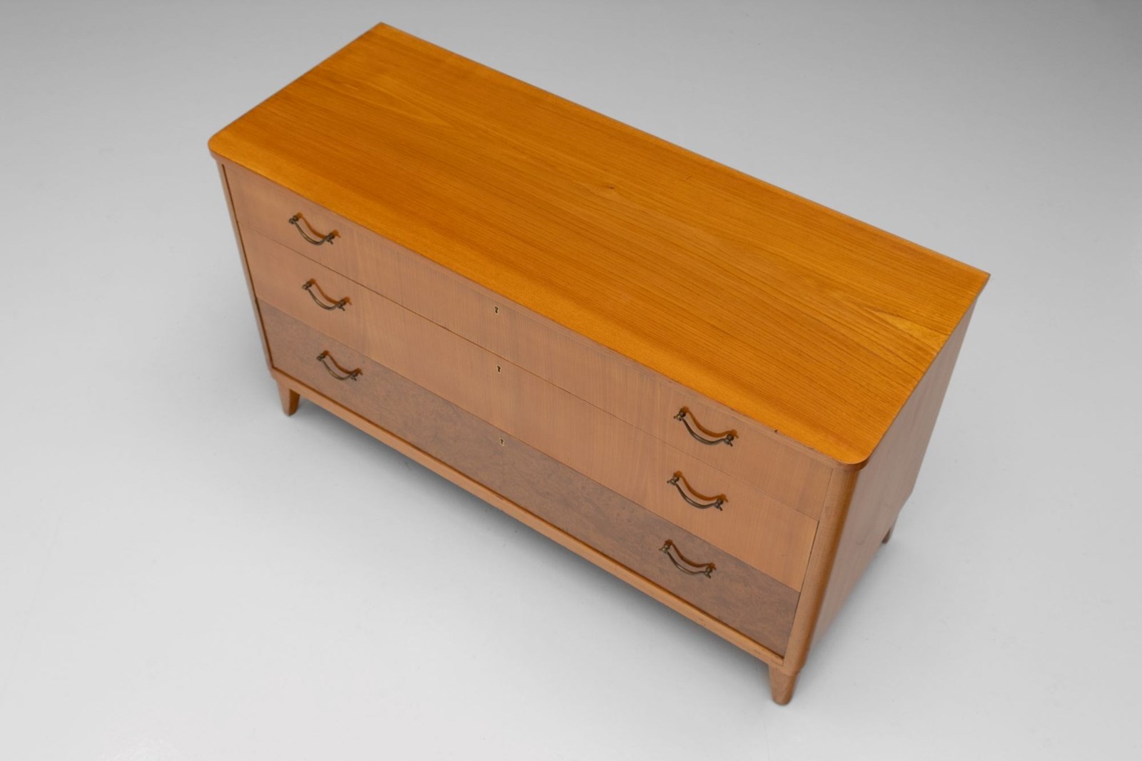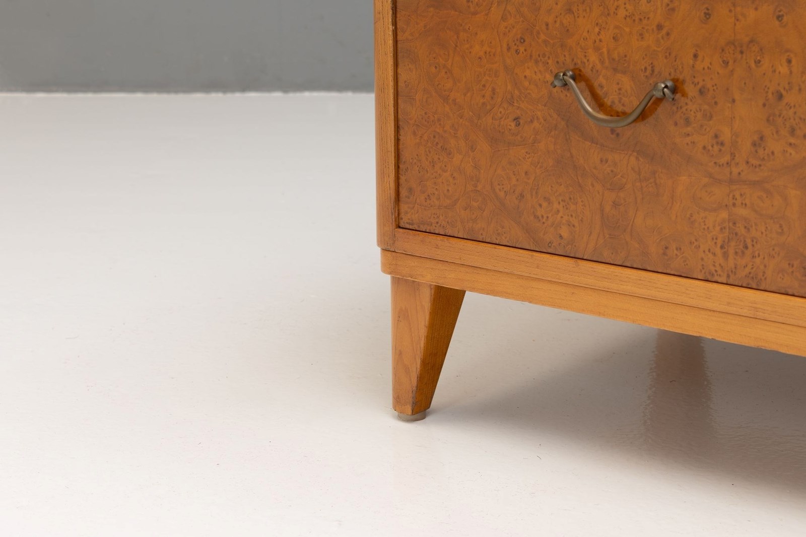 Mid-Century Swedish three drawer chest of drawers in Elm and burr Elm. Original handles. Re-finished. Sweden circa 1950.
