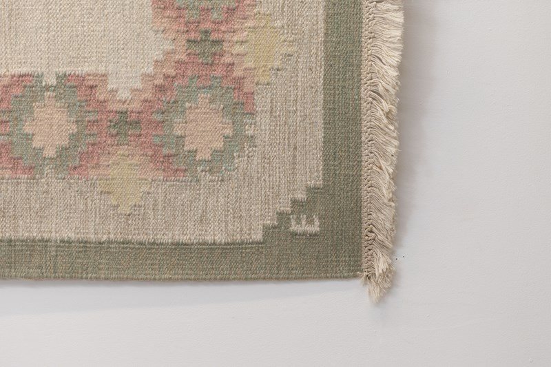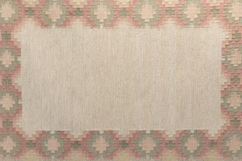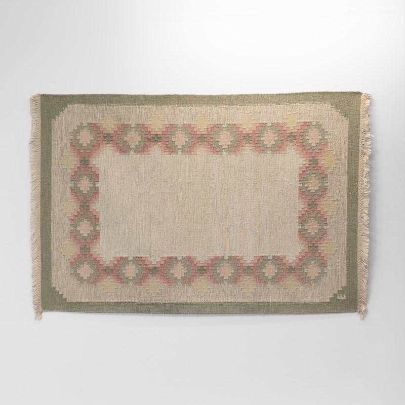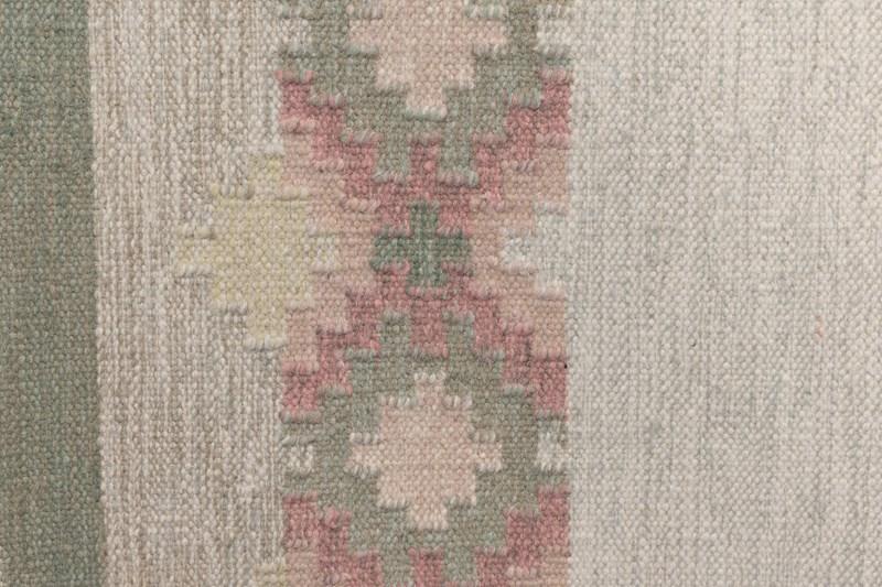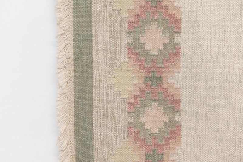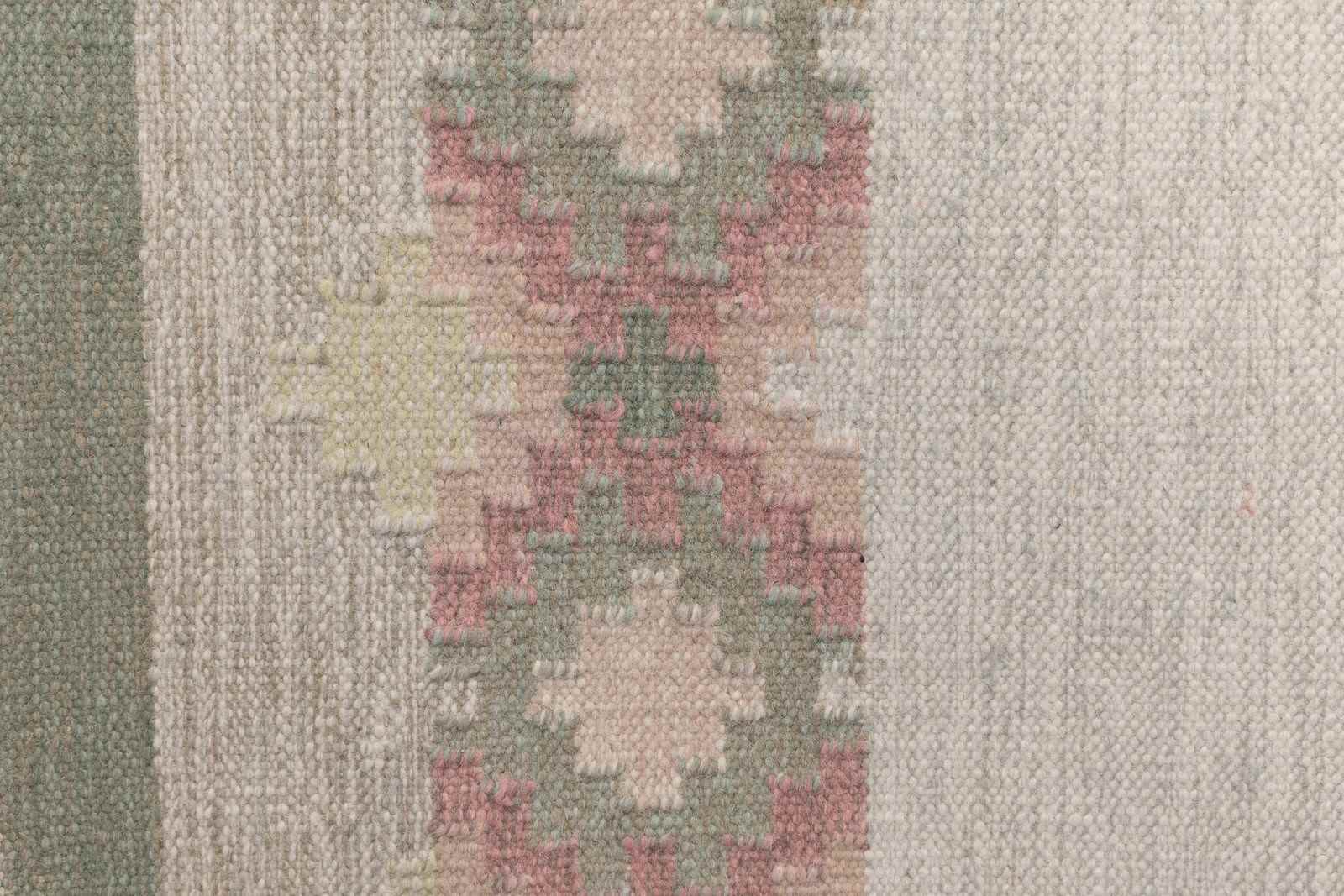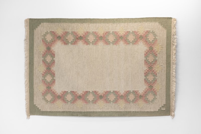 Mid-Century Swedish Kilim in tones of green and cream with a touch of pink. Geometric design. Signed E. Sweden circa 1960. All our carpets undergo a professional cleaning process. However, due to their age and previous life, some may exhibit minor signs of wear consistent with their history. Please examine the provided photos carefully or contact us for further information.