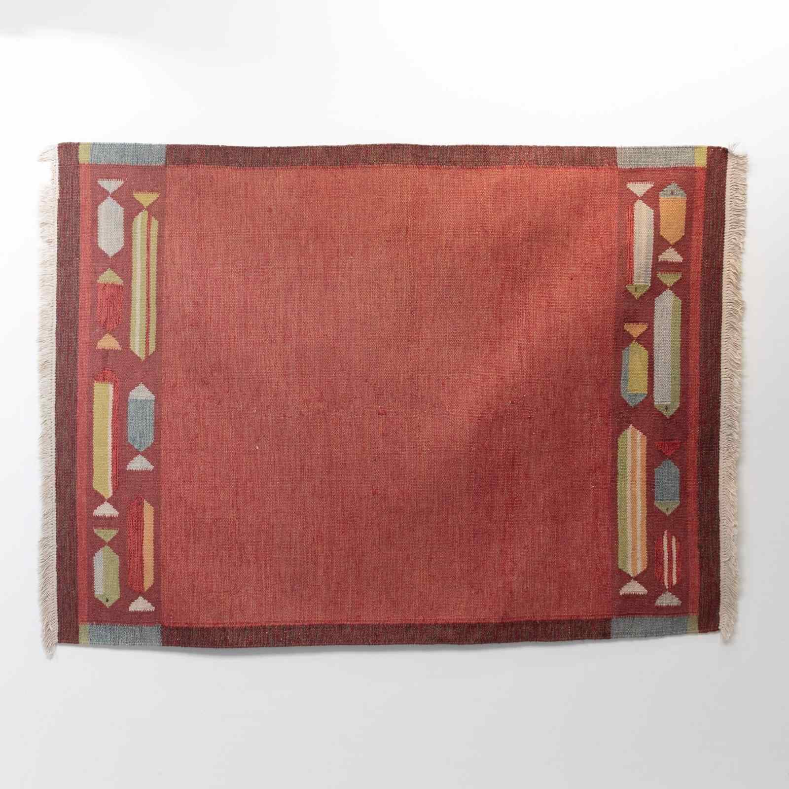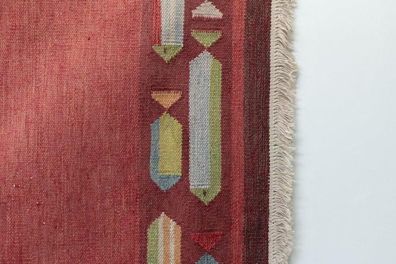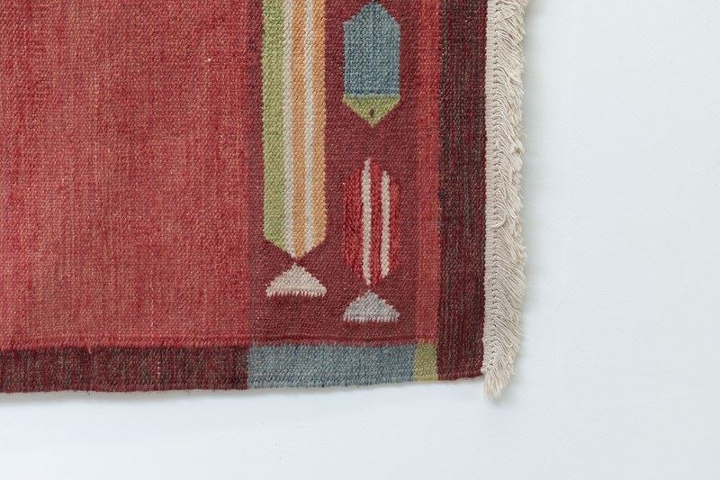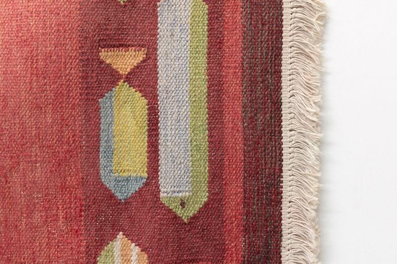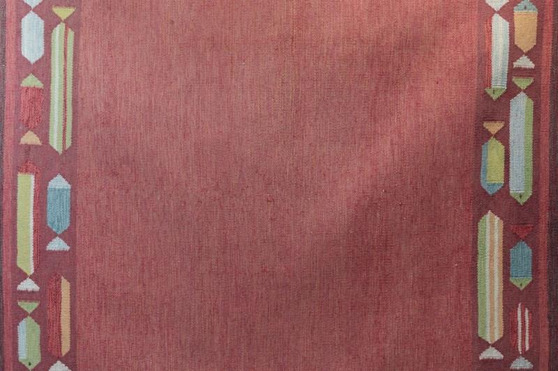 Swedish kilim in a deep red tone with unusual fish decoration.