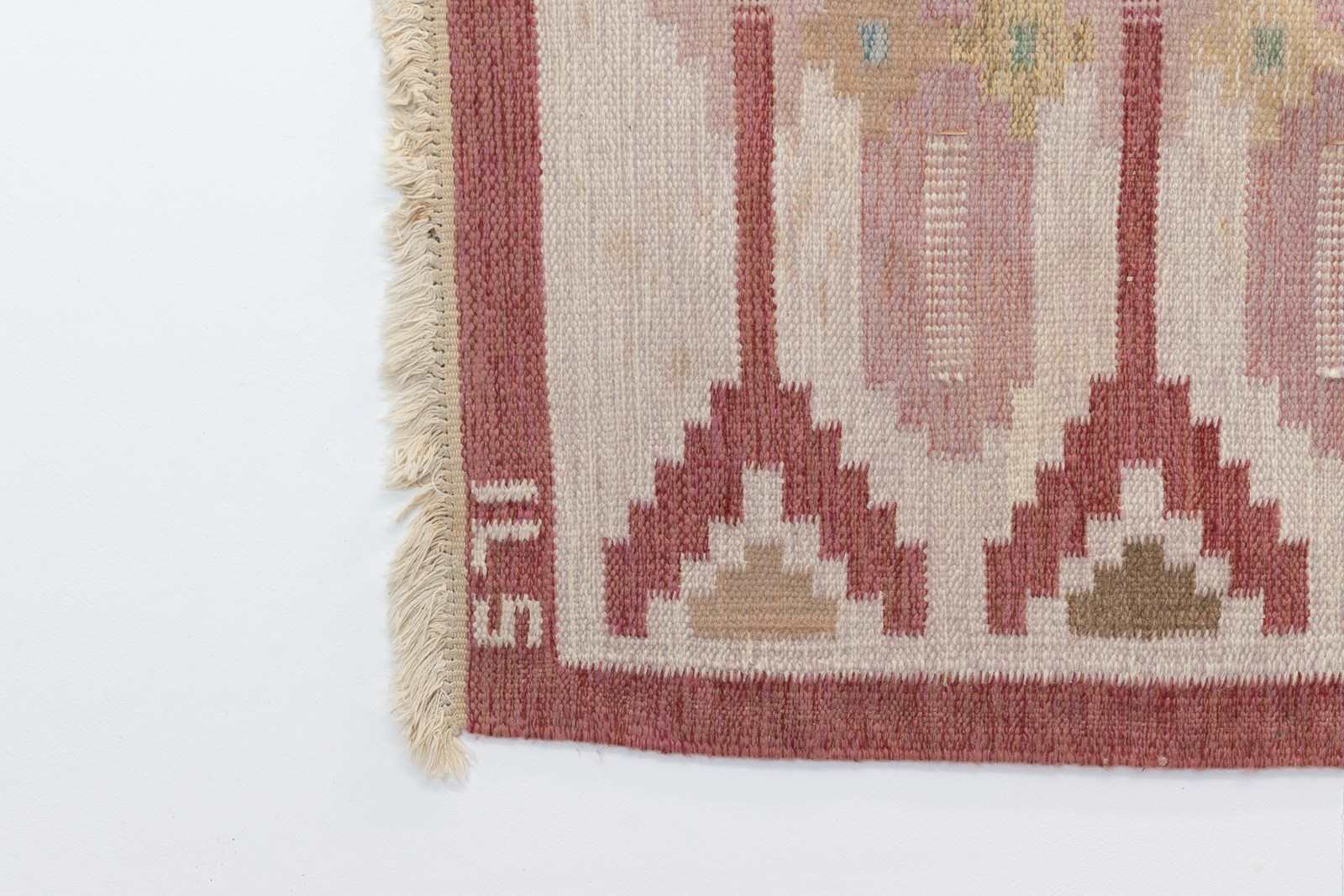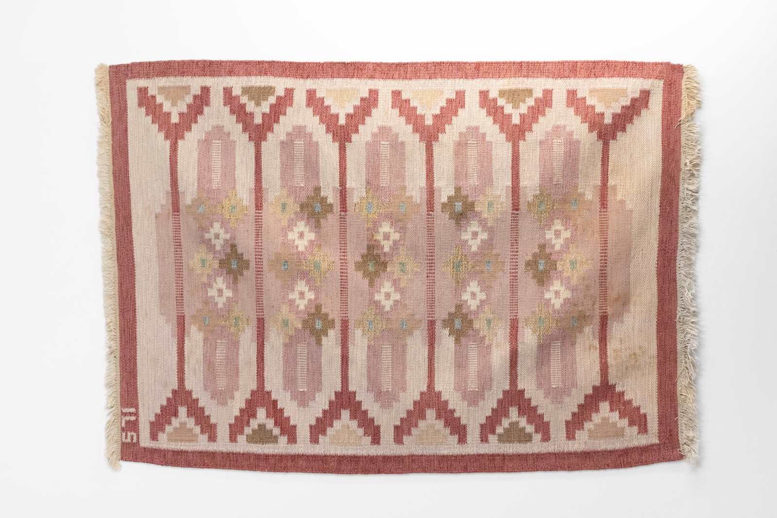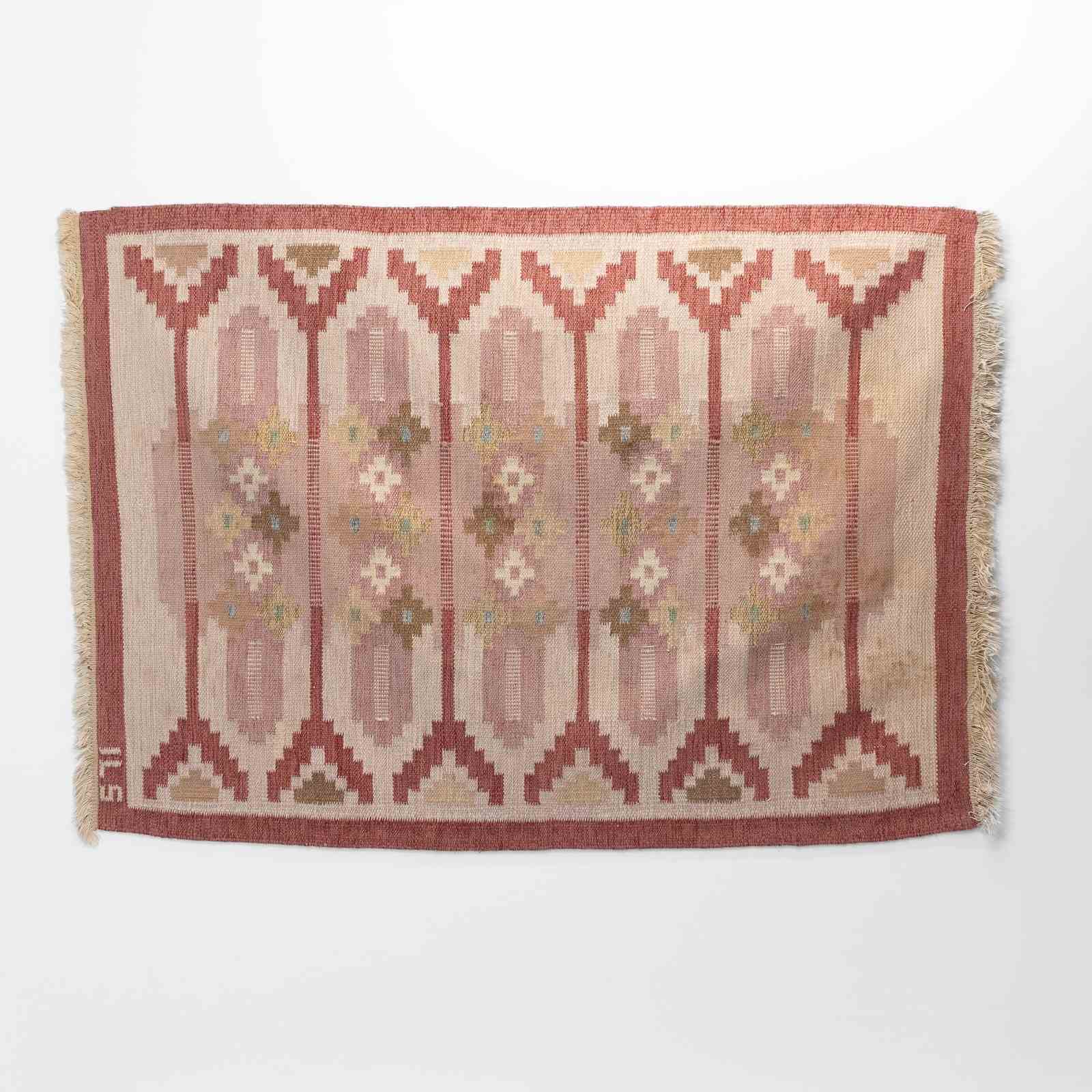 Mid-Century Swedish kilim in tones of red with a cream base. Some staining on one corner. Geometric pattern. Signed ILS. Sweden circa 1960. All our carpets undergo a professional cleaning process. However, due to their age and previous life, some may exhibit minor signs of wear consistent with their history. Please examine the provided photos carefully or contact us for further information.