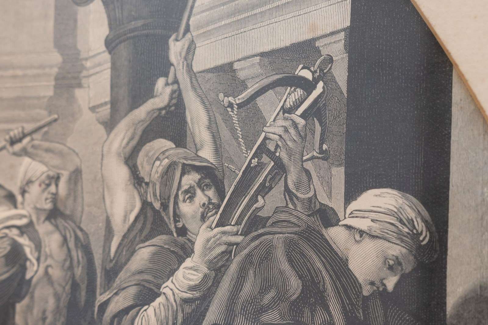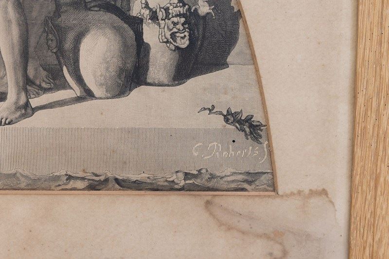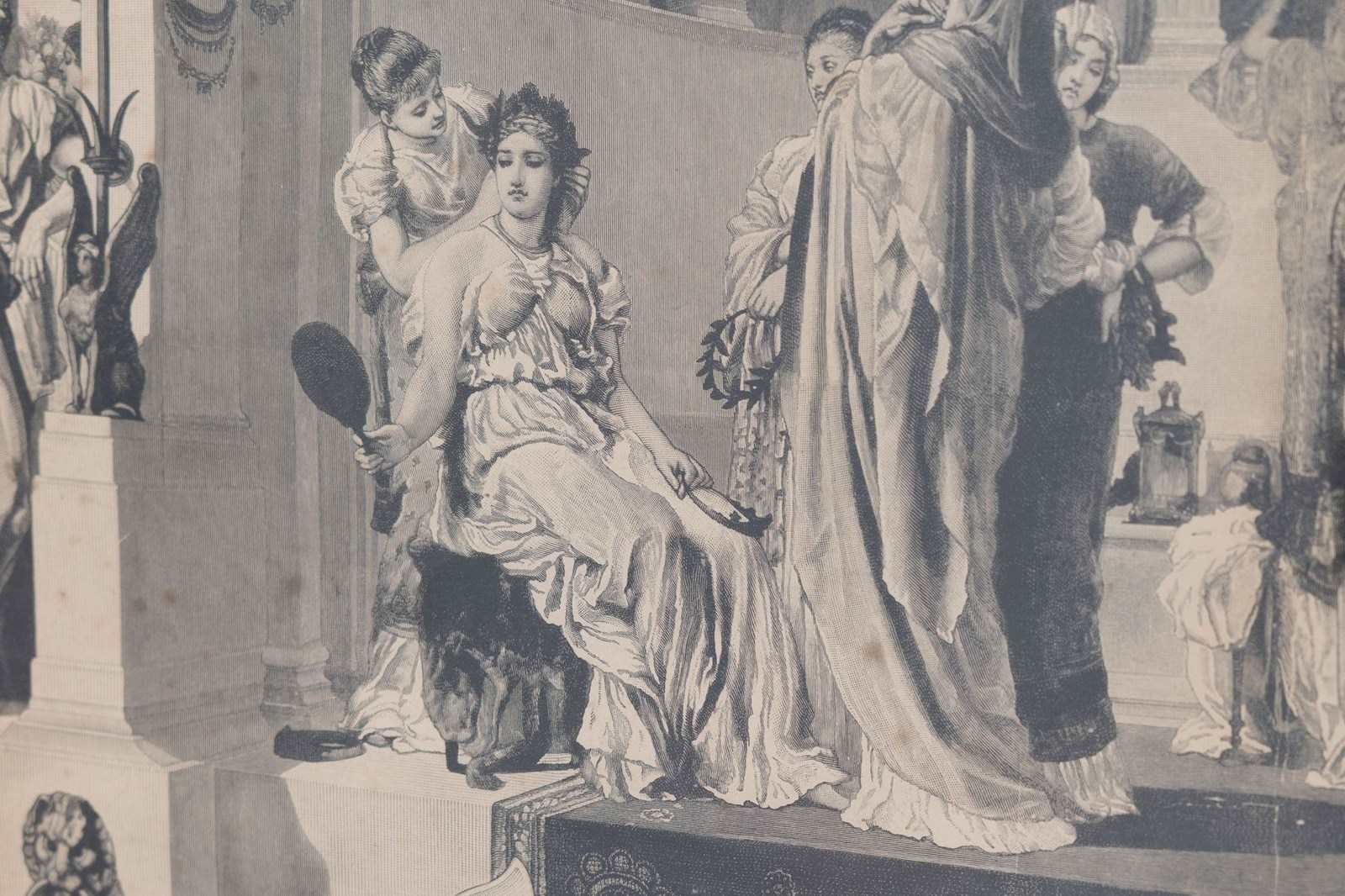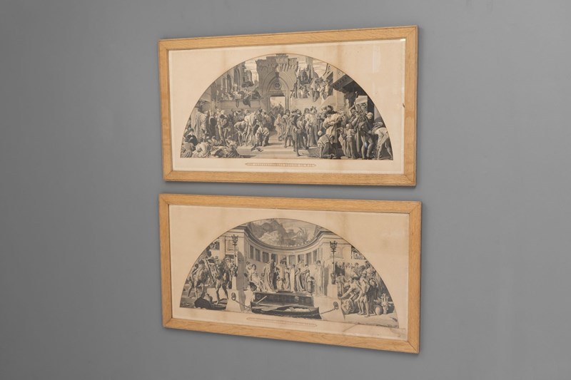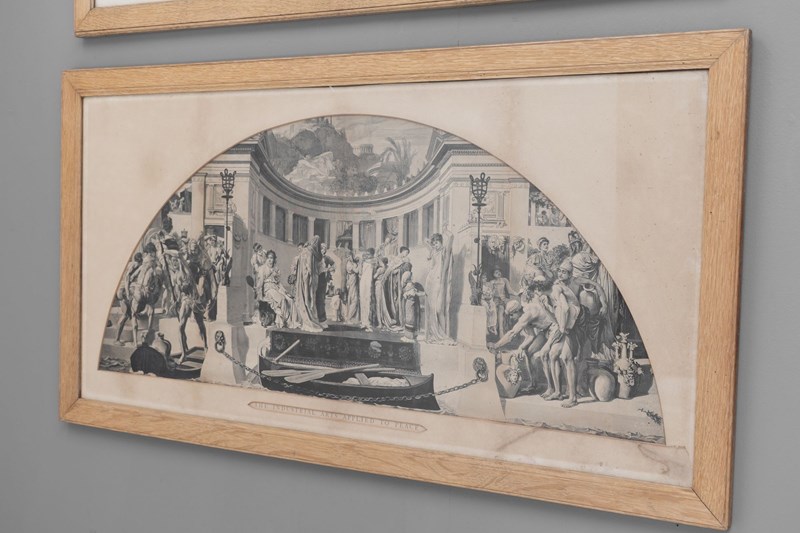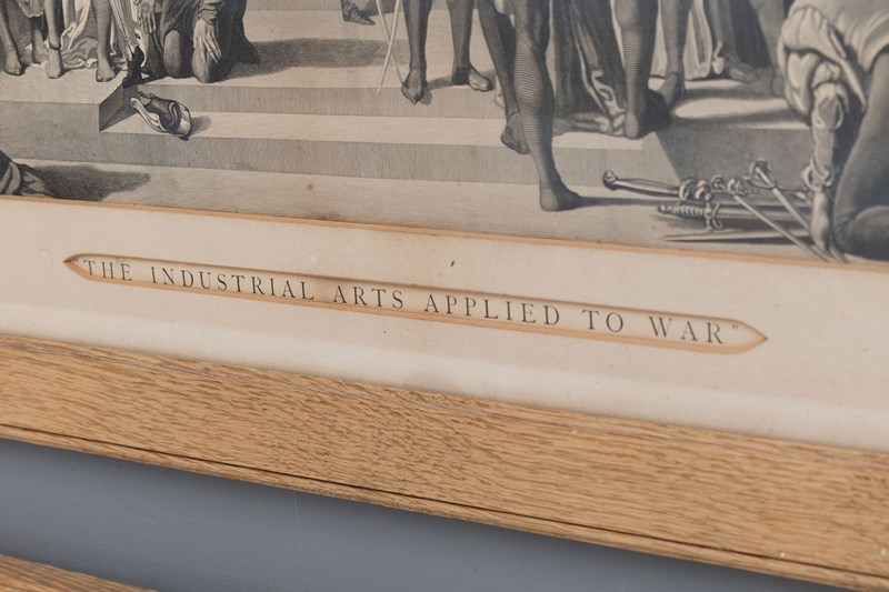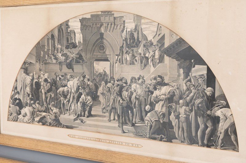 Pair of oak framed black and white prints " The Industrial Arts Applied to War and Peace " after Frederic Leighton. Circa 1900