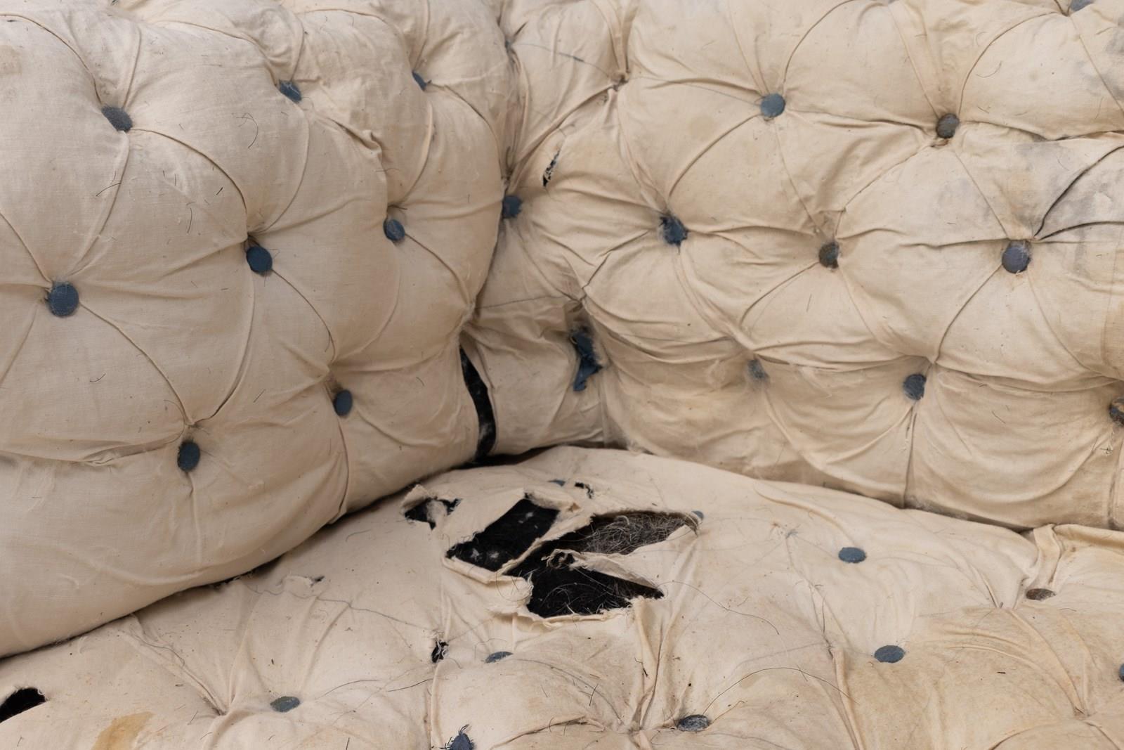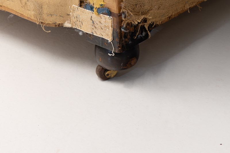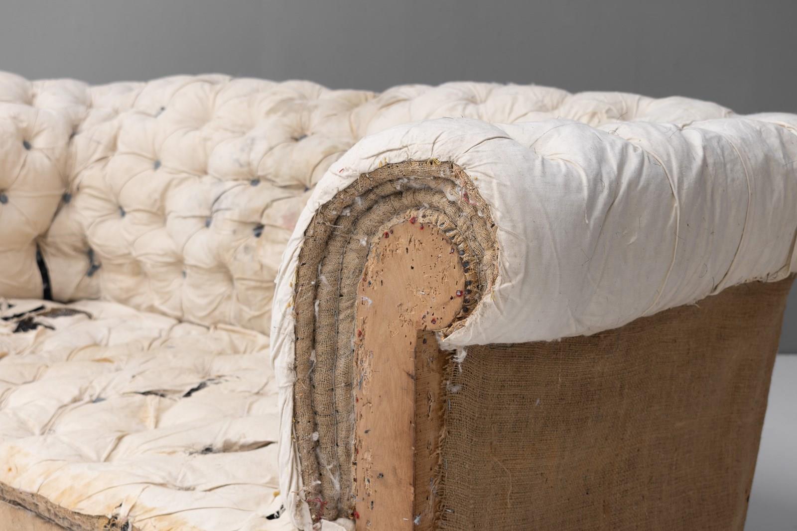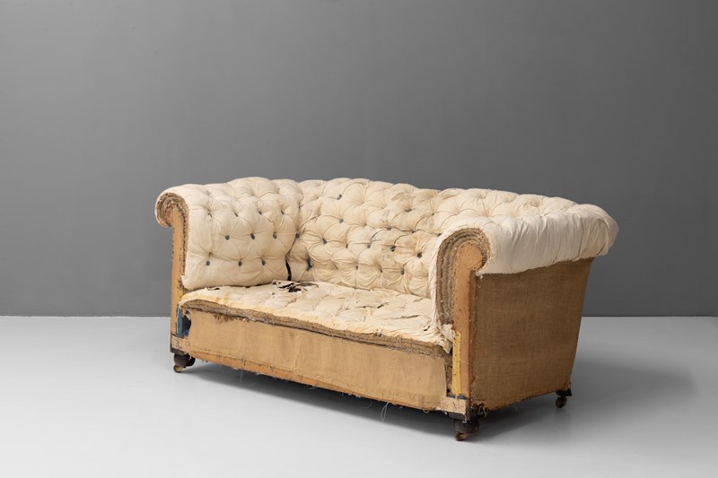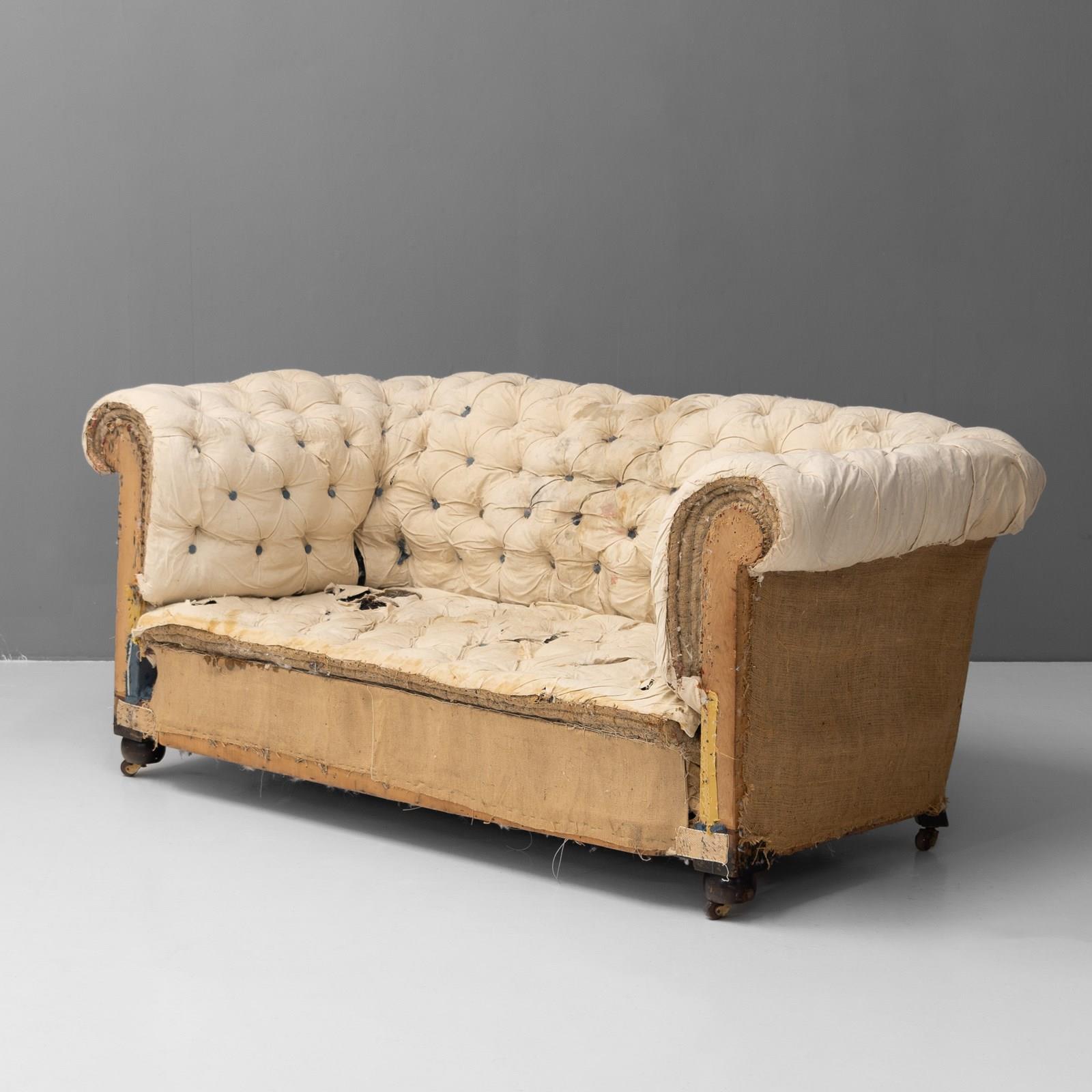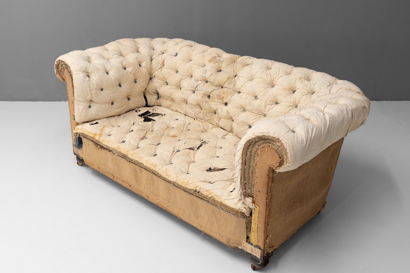 Two seat Chesterfield settee on turned walnut feet and original casters. Circa 1900.