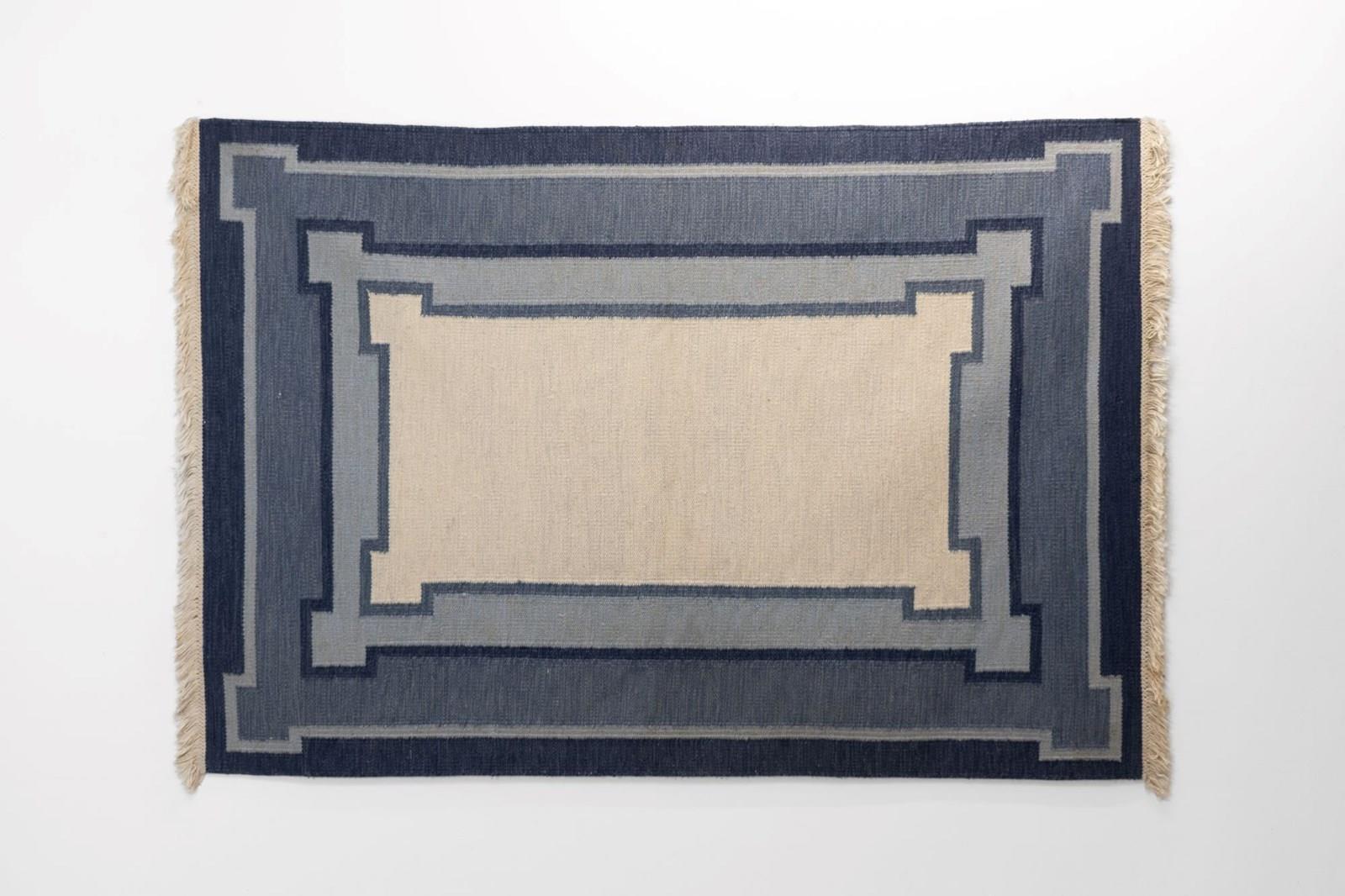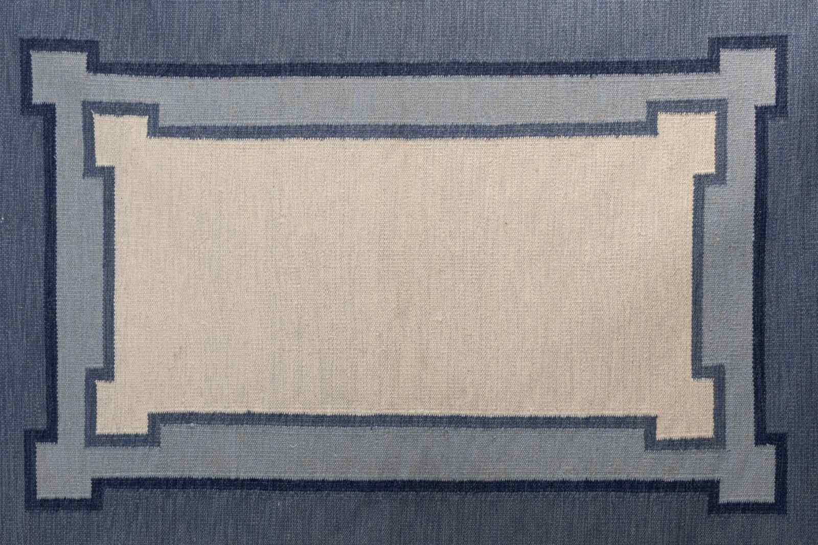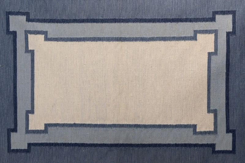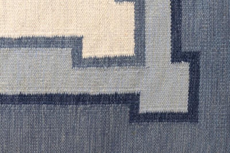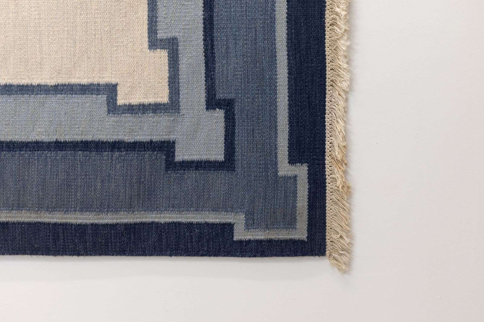 Vintage Swedish kilim in stepped blue tones. Unusual design. Sweden circa 1960. All our carpets undergo a professional cleaning process. However, due to their age and previous life, some may exhibit minor signs of wear consistent with their history. Please examine the provided photos carefully or contact us for further information.