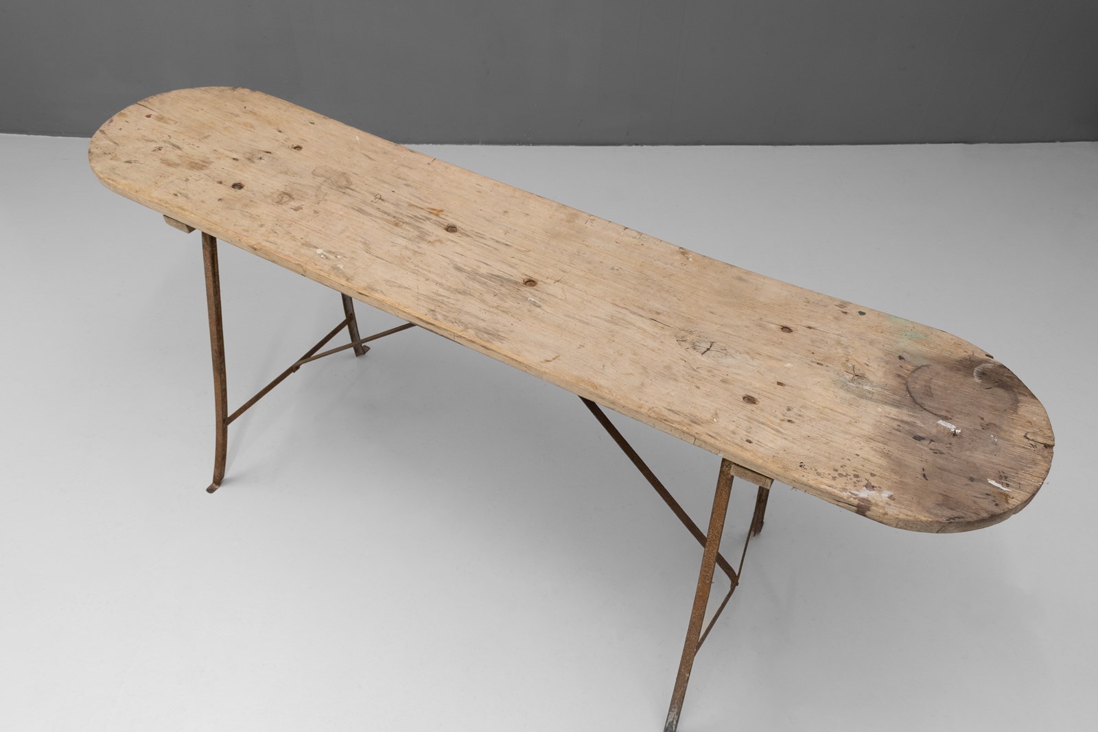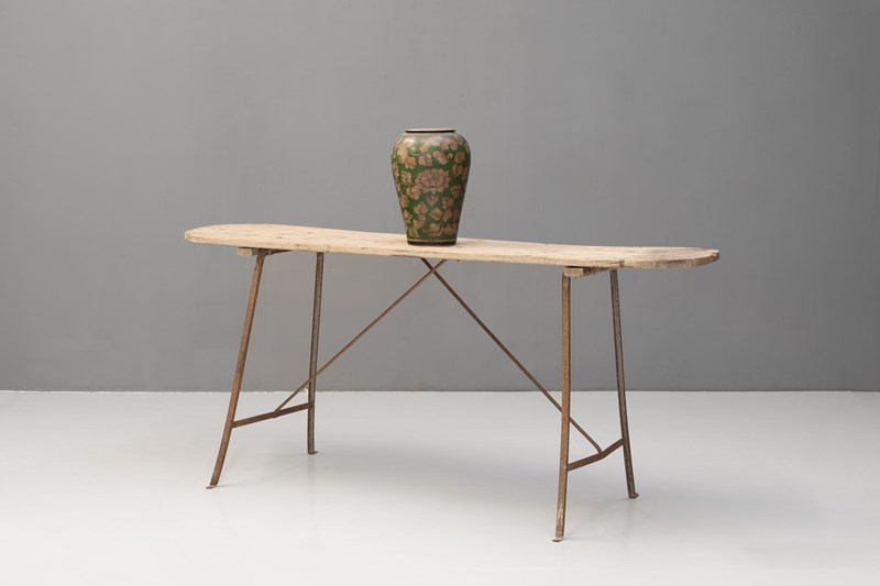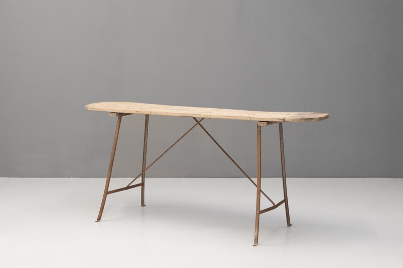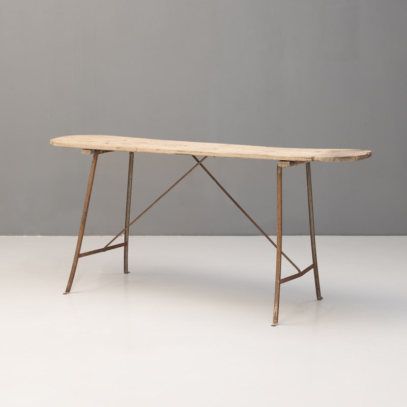 French wash table with poplar top on a metal frame base. Circa 1900.