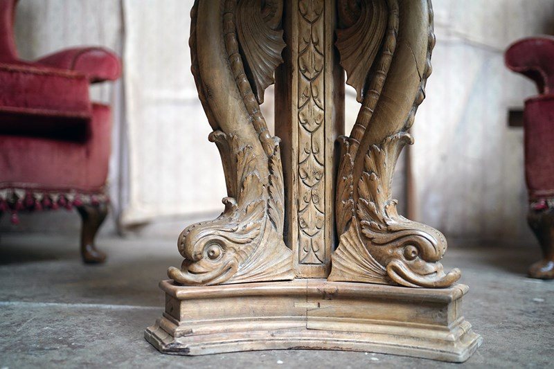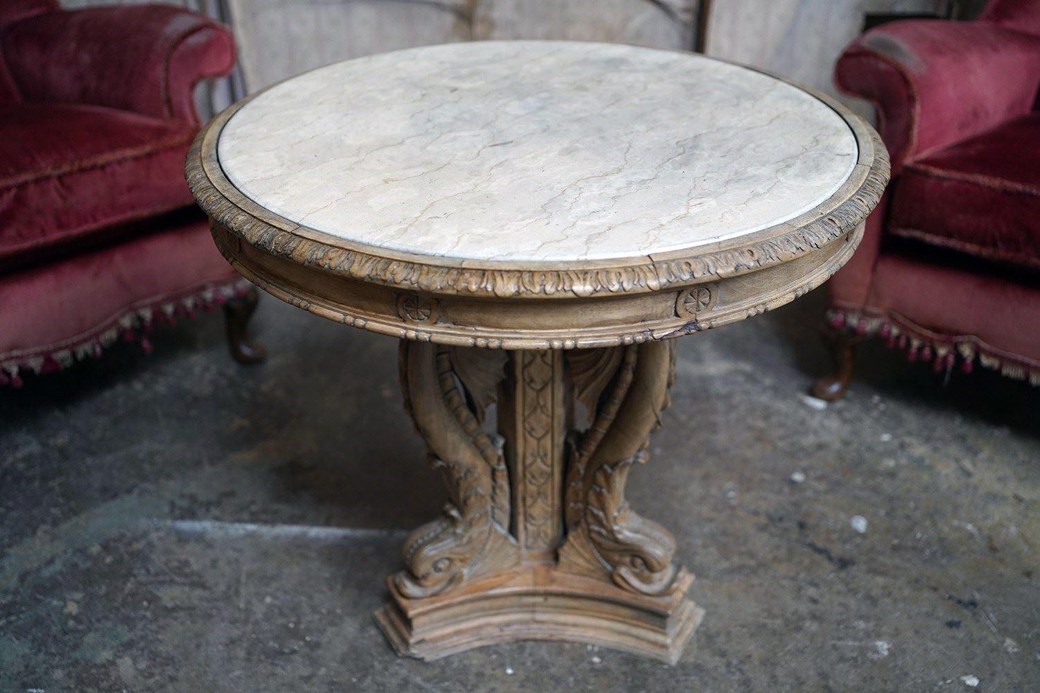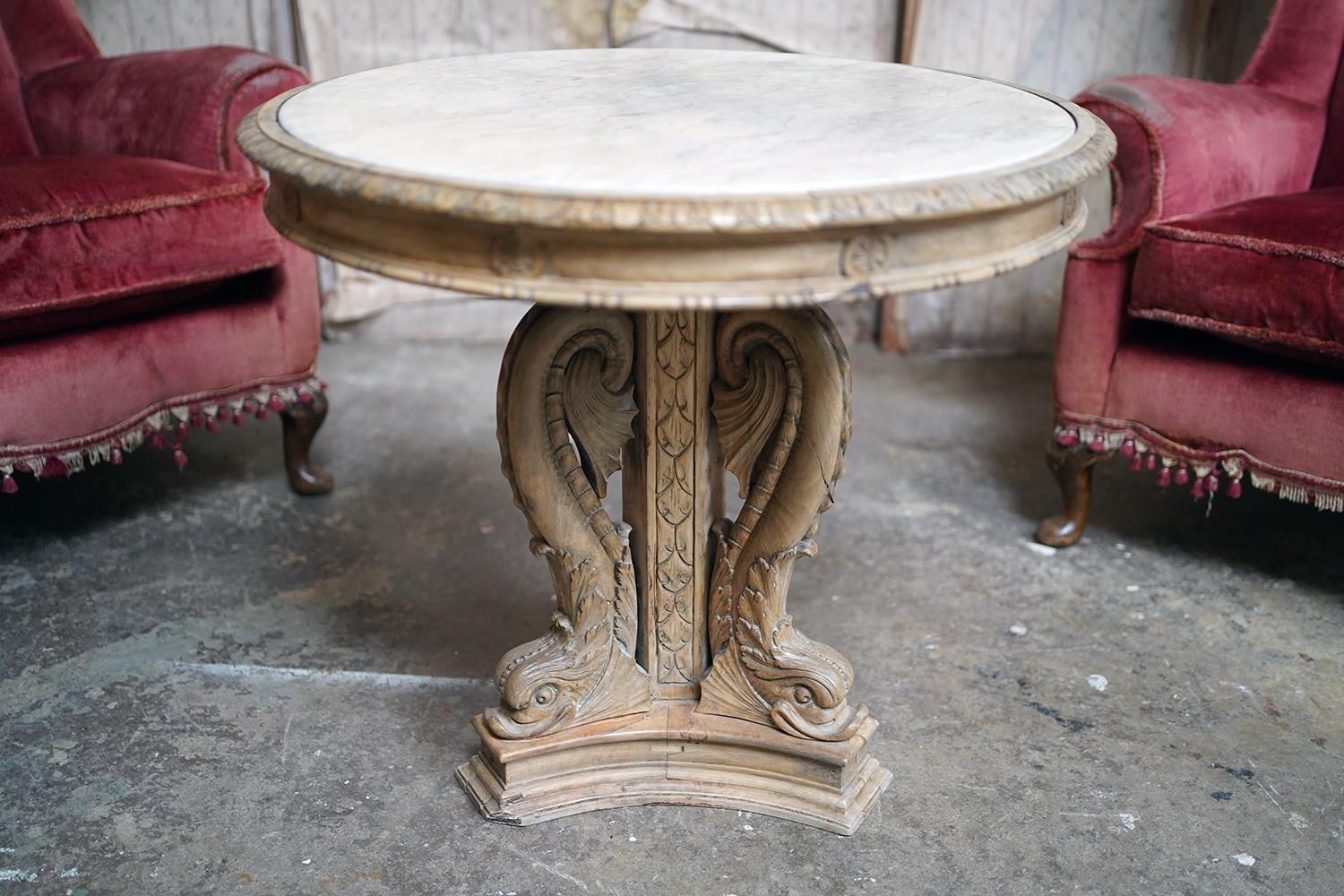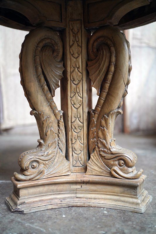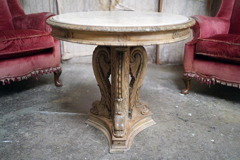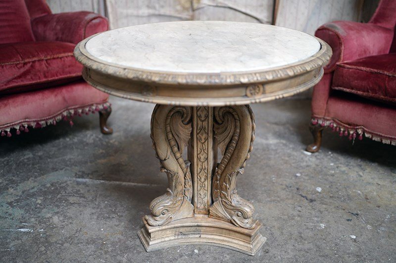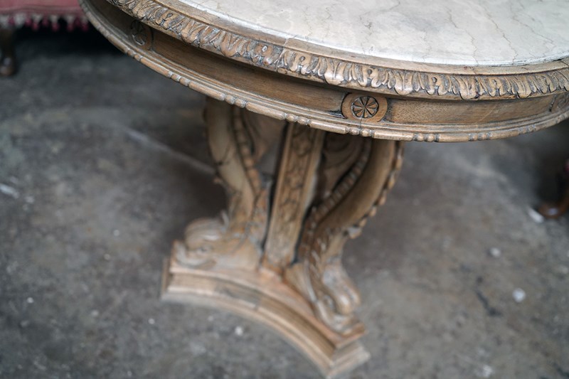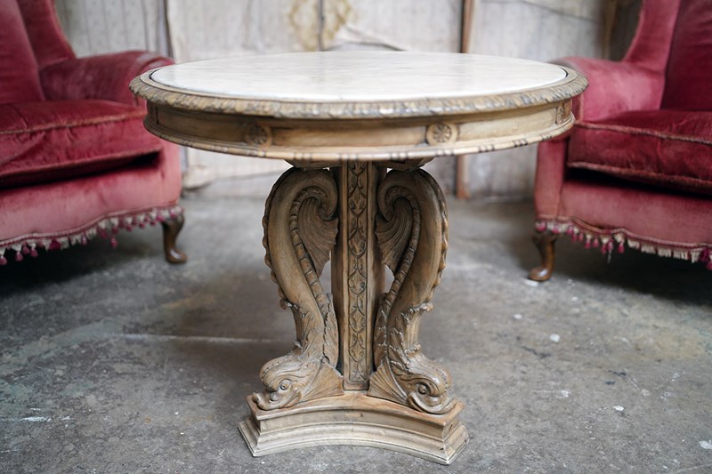 The beautiful gueridon, of occasional table proportions, having a circular veined Italian Fior di Bosco marble inset top over a gadrooned, cartouche and leaf moulded frieze, the limed beech and fruitwood carcass formed of three beautifully carved dolphin supports to a triform base and surviving from the third quarter of nineteenth century France.