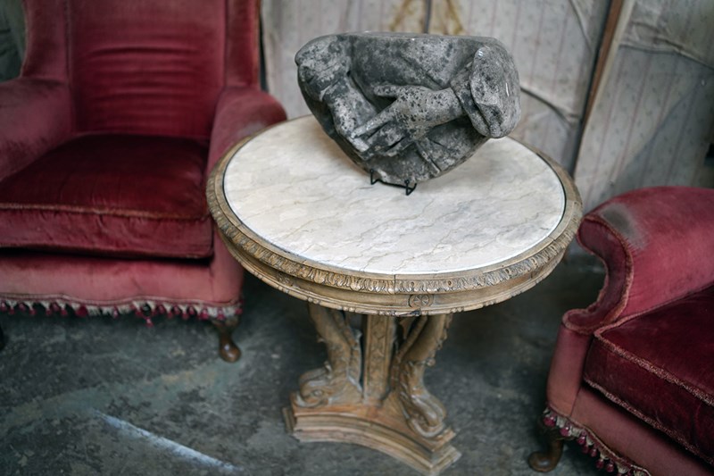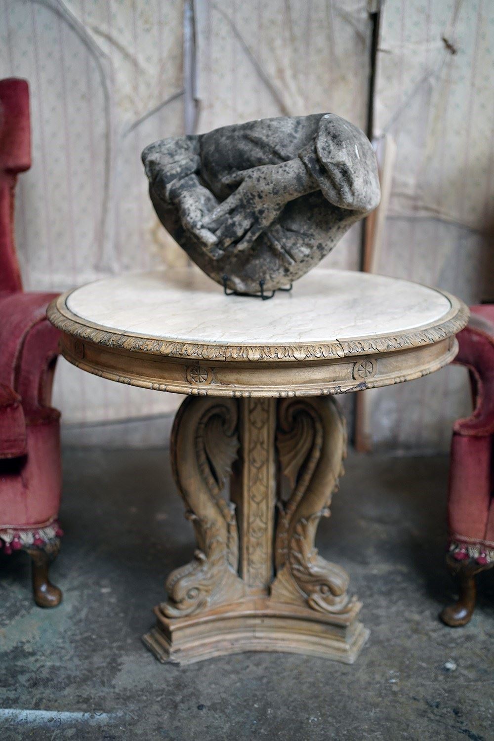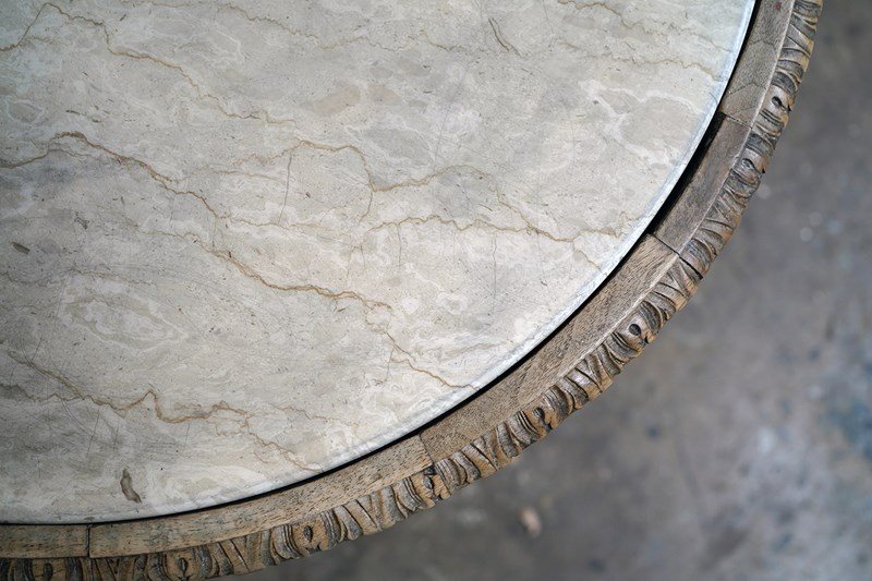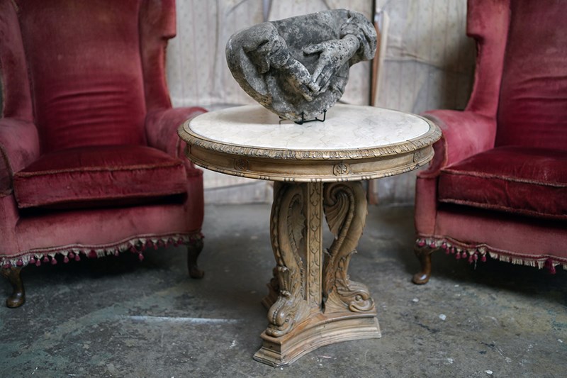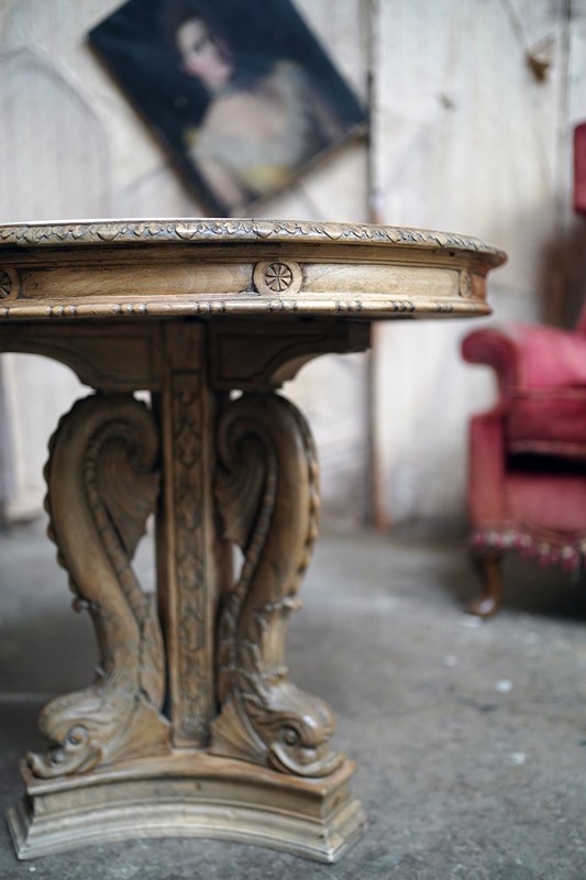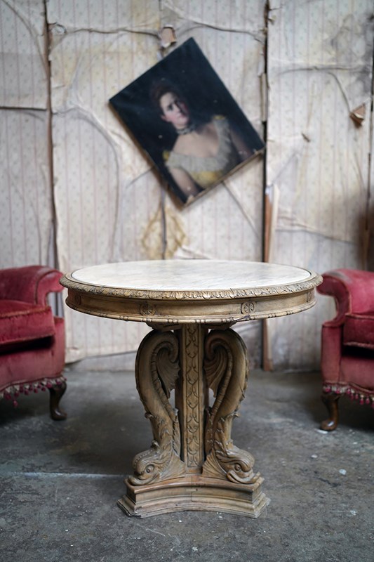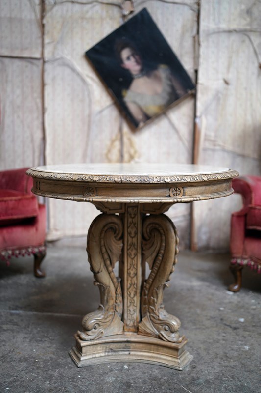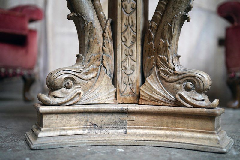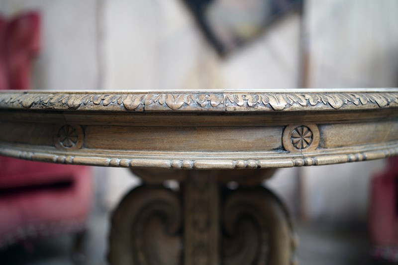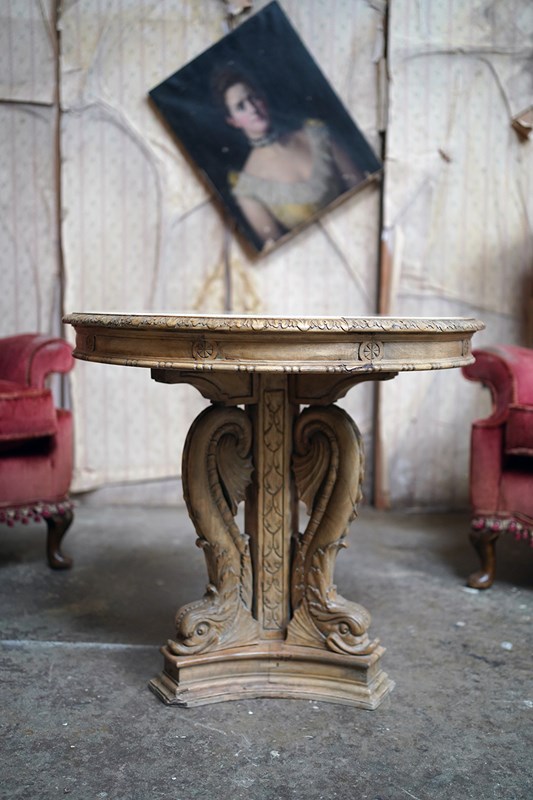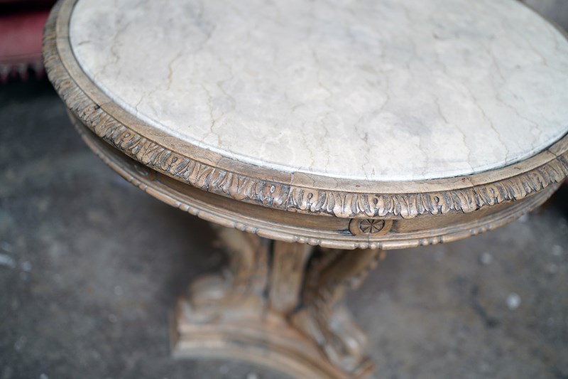 The beautiful gueridon, of occasional table proportions, having a circular veined Italian Fior di Bosco marble inset top over a gadrooned, cartouche and leaf moulded frieze, the limed beech and fruitwood carcass formed of three beautifully carved dolphin supports to a triform base and surviving from the third quarter of nineteenth century France.