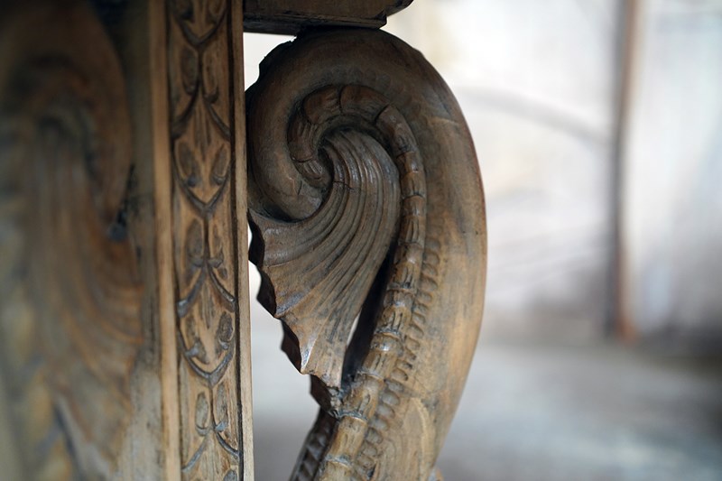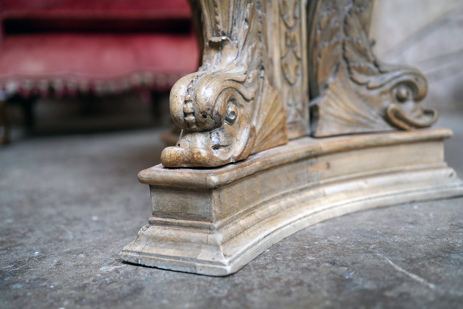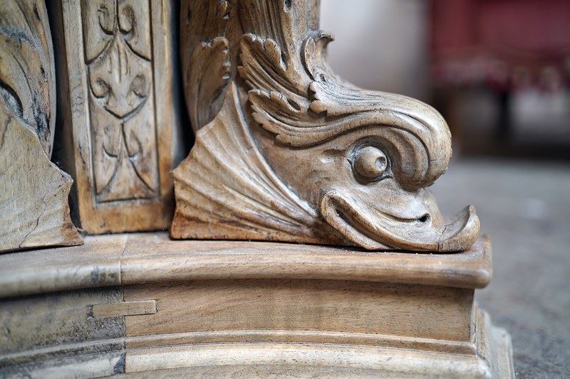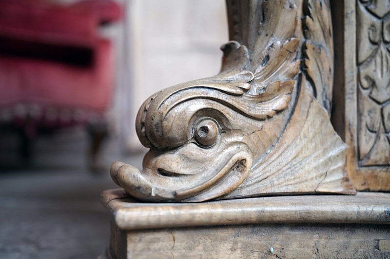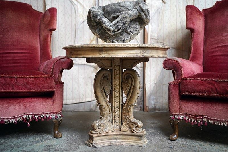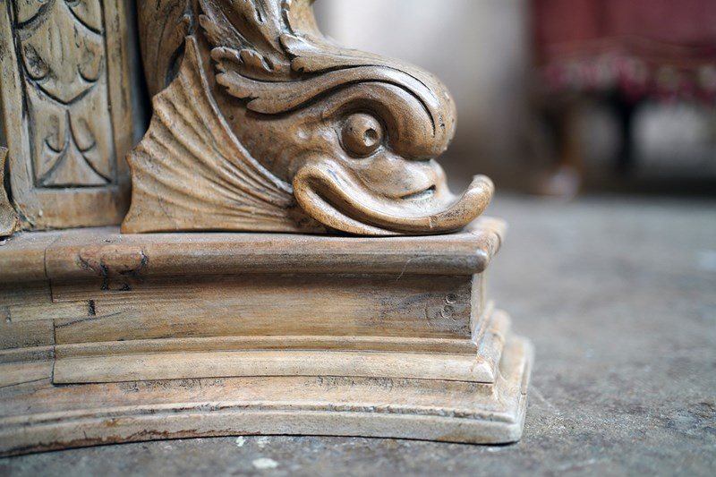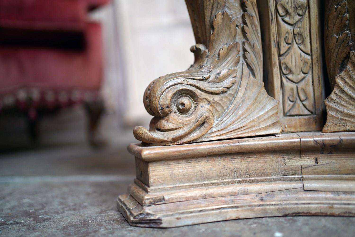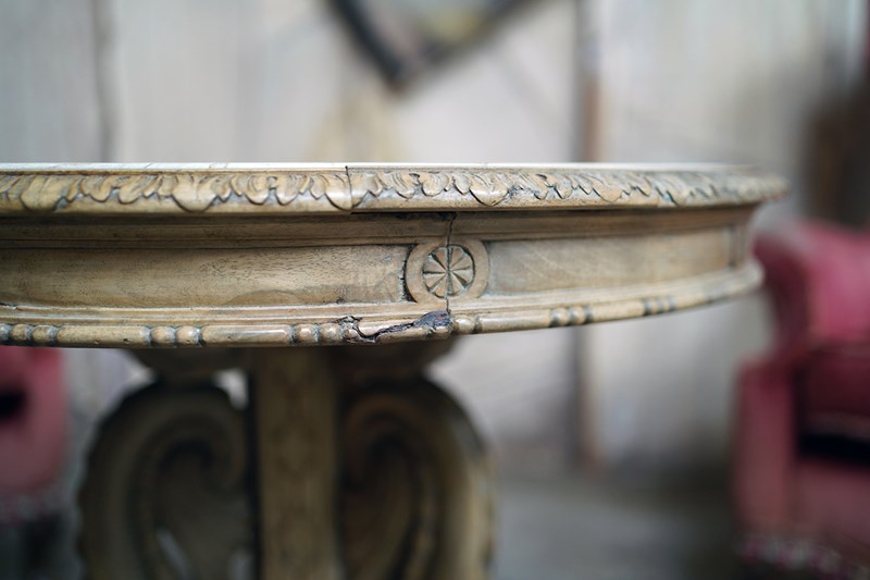 The beautiful gueridon, of occasional table proportions, having a circular veined Italian Fior di Bosco marble inset top over a gadrooned, cartouche and leaf moulded frieze, the limed beech and fruitwood carcass formed of three beautifully carved dolphin supports to a triform base and surviving from the third quarter of nineteenth century France.