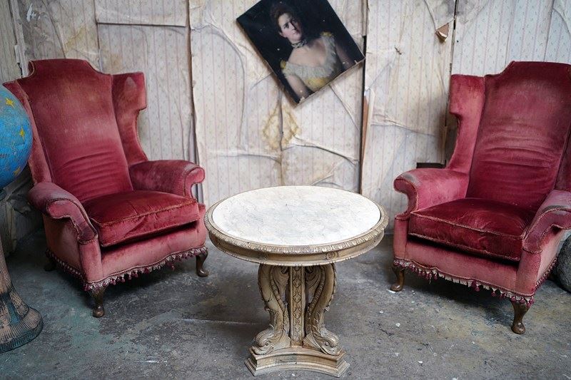 The table is in good overall order. There are light surface scratches and minor marks to the top, whilst the base has been bleached later to its inception. There are some small splits, minor breaks and historic strengthening and repairs throughout with some minor separation to the joints, notwithstanding she remains solid and stable and overall appears in good structural and cosmetic condition and is ready for use. The Fior di Bosco marble is an Italian stone prized for its subtle elegance and warm undertones.