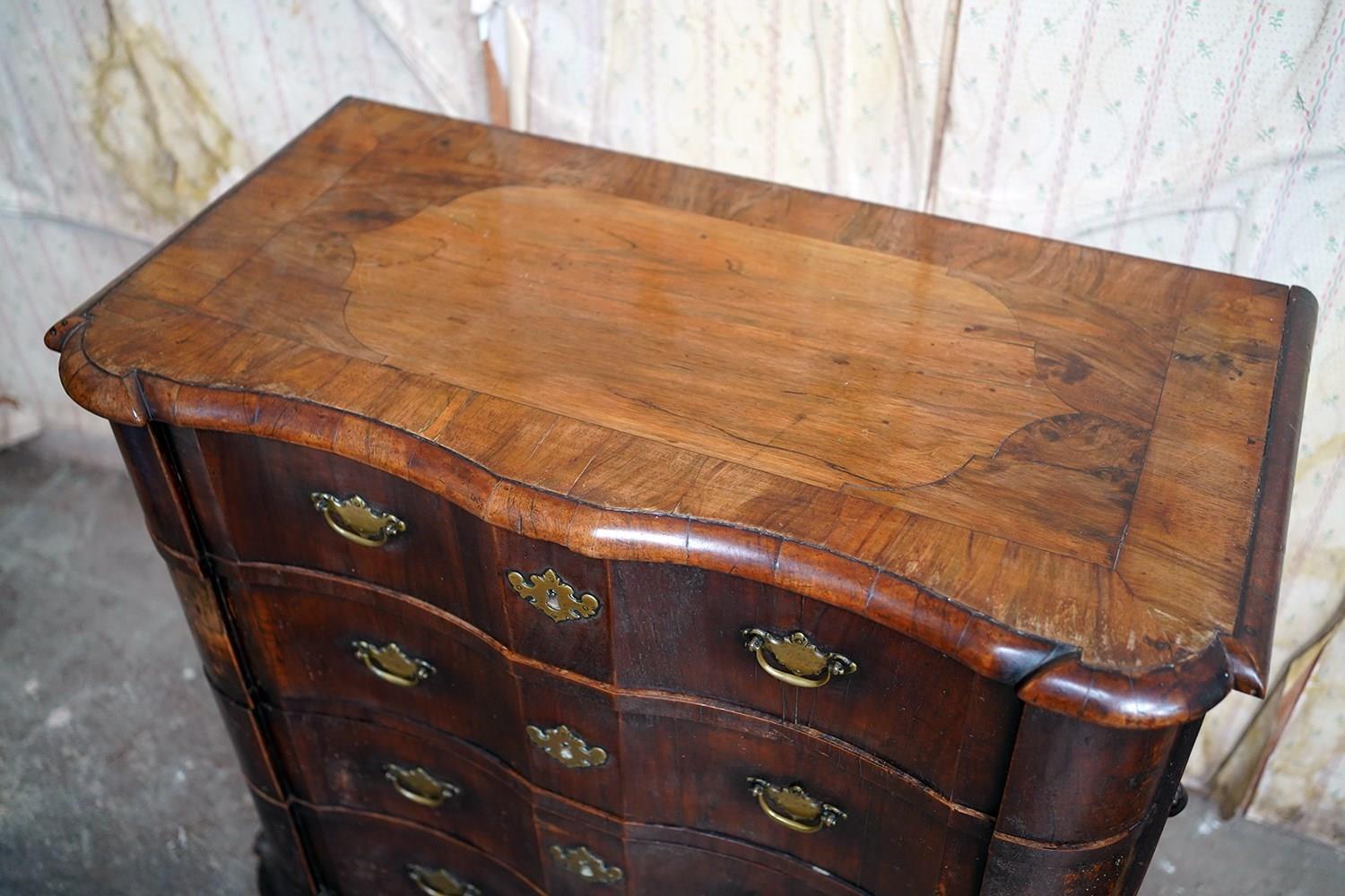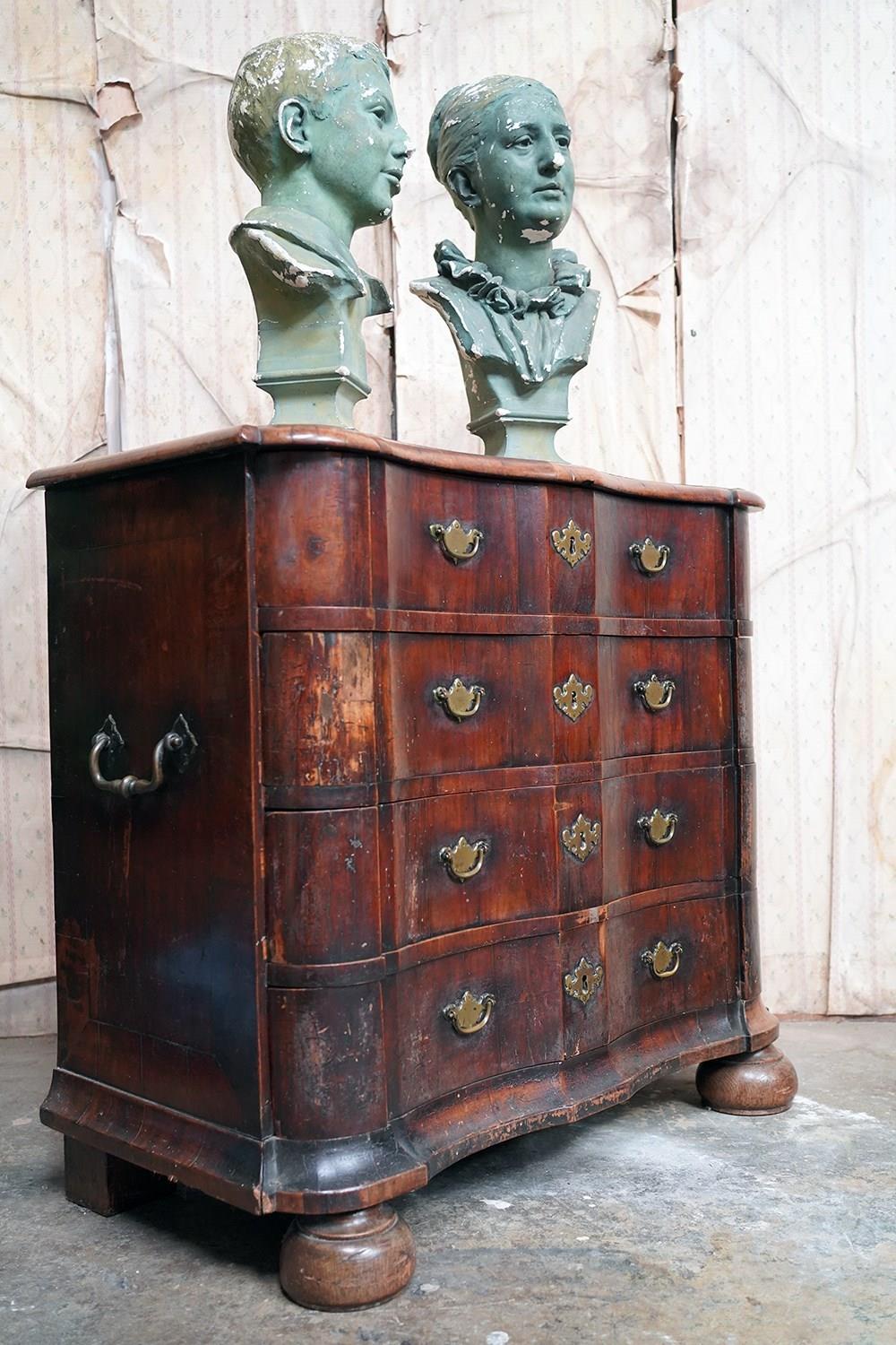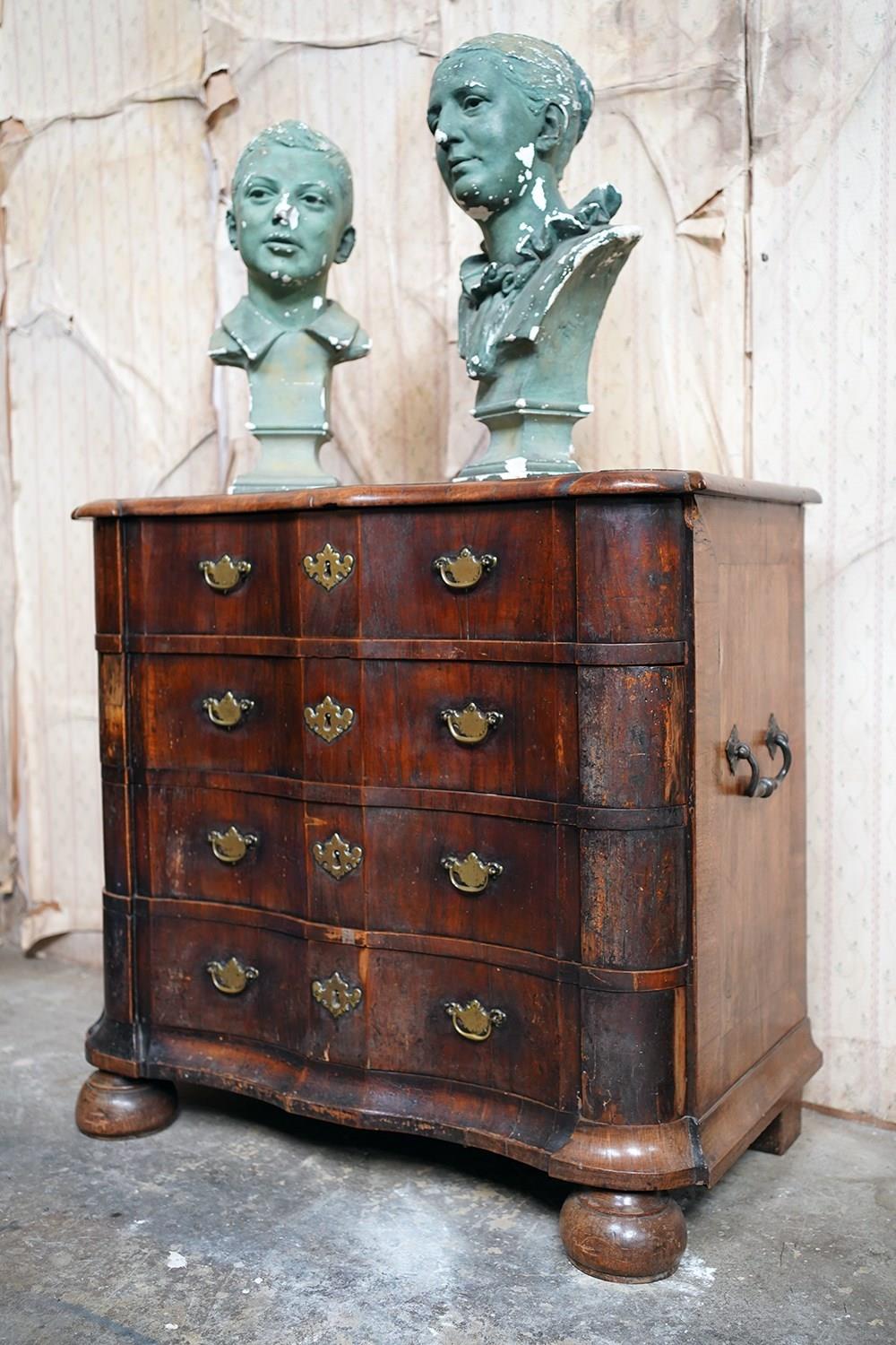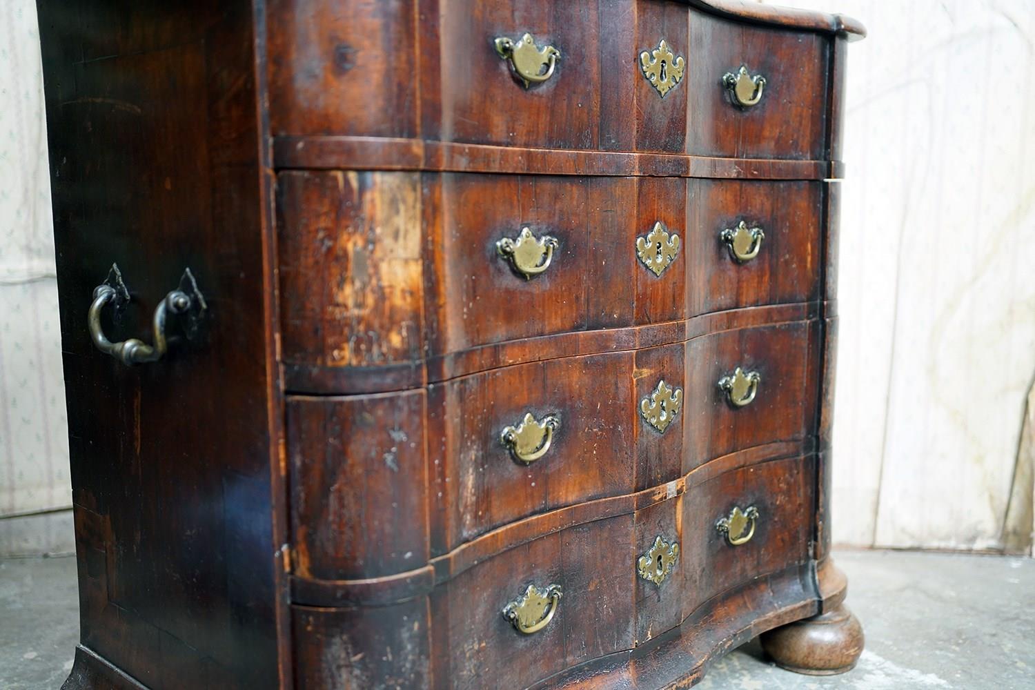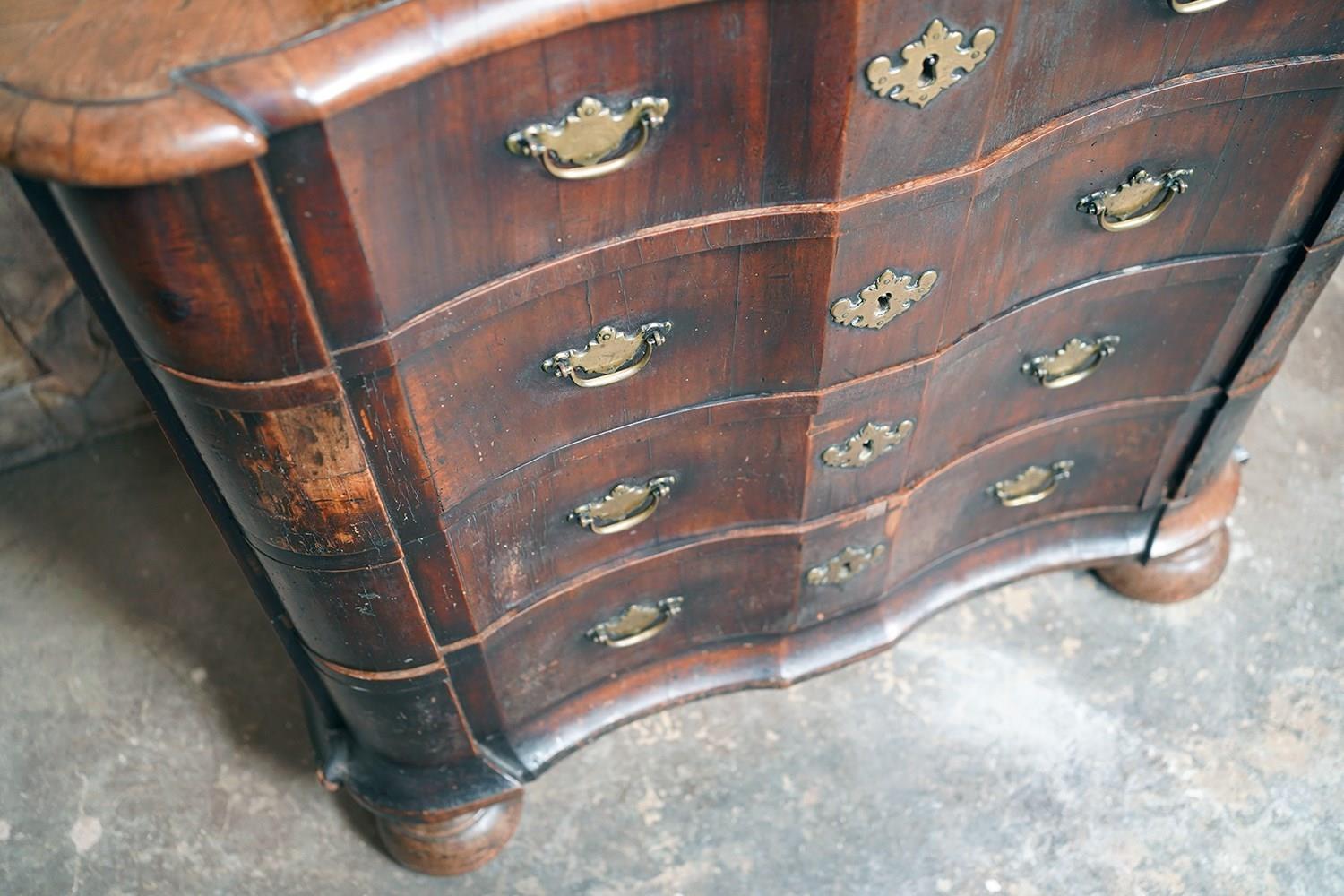 The shaped walnut carcass of superb generous baroque bombe type form, having a moulded top above an arrangement of four long serpentine graduated drawers to shaped ends, with panelled sides each with large brass carrying handles, the frontage with brass drop handles and rococo escutcheons, to a shaped moulded base raised on later(?) bun feet and surviving from the second quarter of eighteenth century Netherlands.
