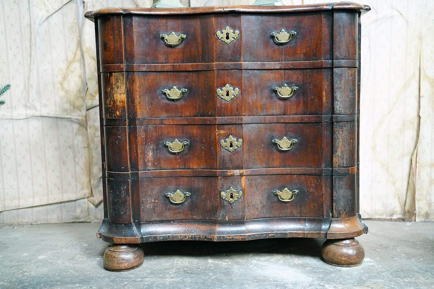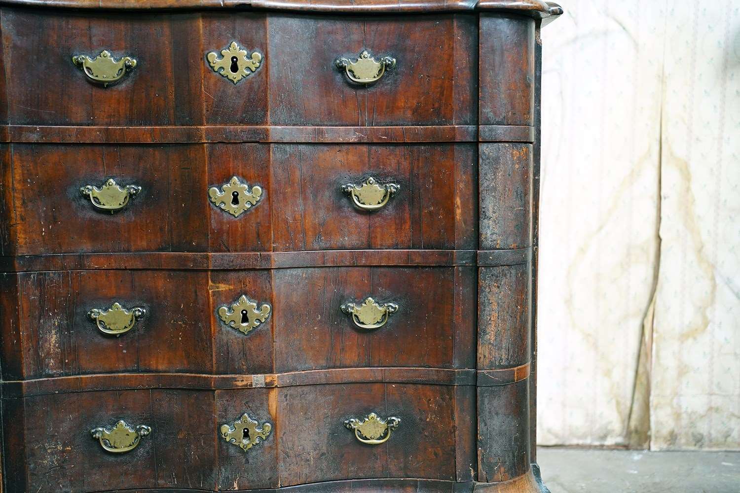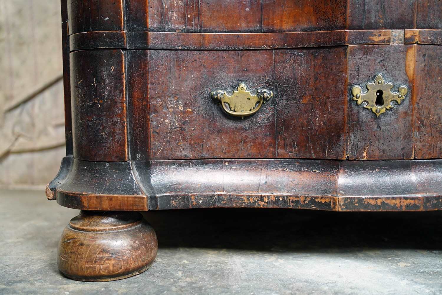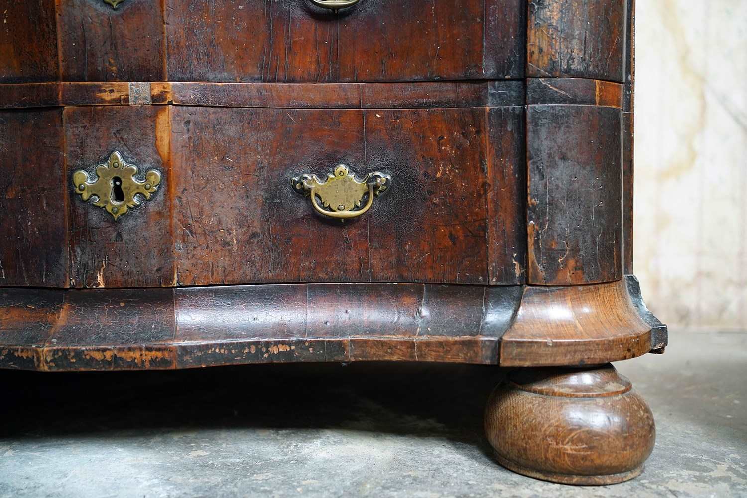 The shaped walnut carcass of superb generous baroque bombe type form, having a moulded top above an arrangement of four long serpentine graduated drawers to shaped ends, with panelled sides each with large brass carrying handles, the frontage with brass drop handles and rococo escutcheons, to a shaped moulded base raised on later(?) bun feet and surviving from the second quarter of eighteenth century Netherlands.