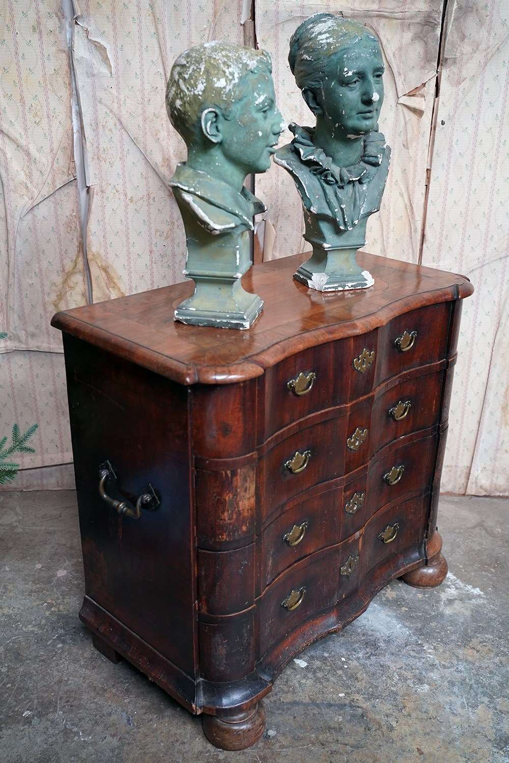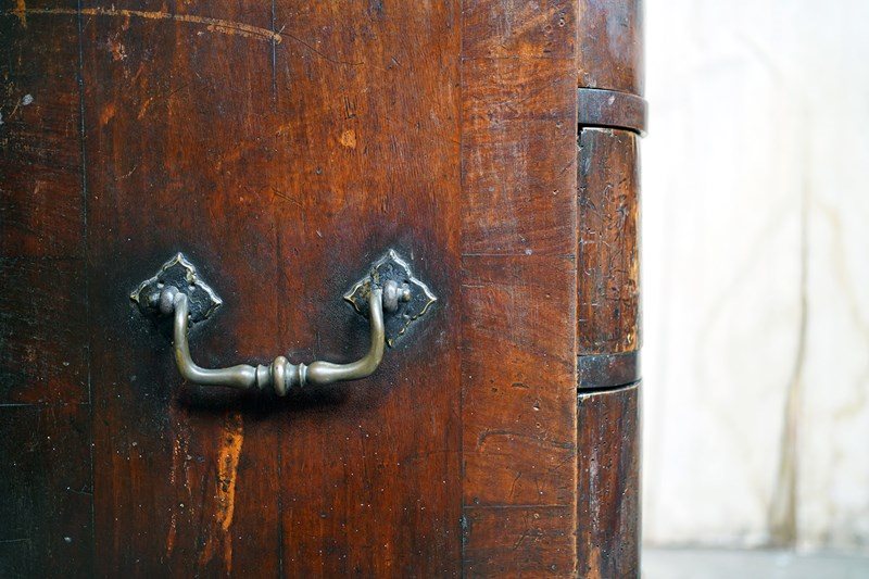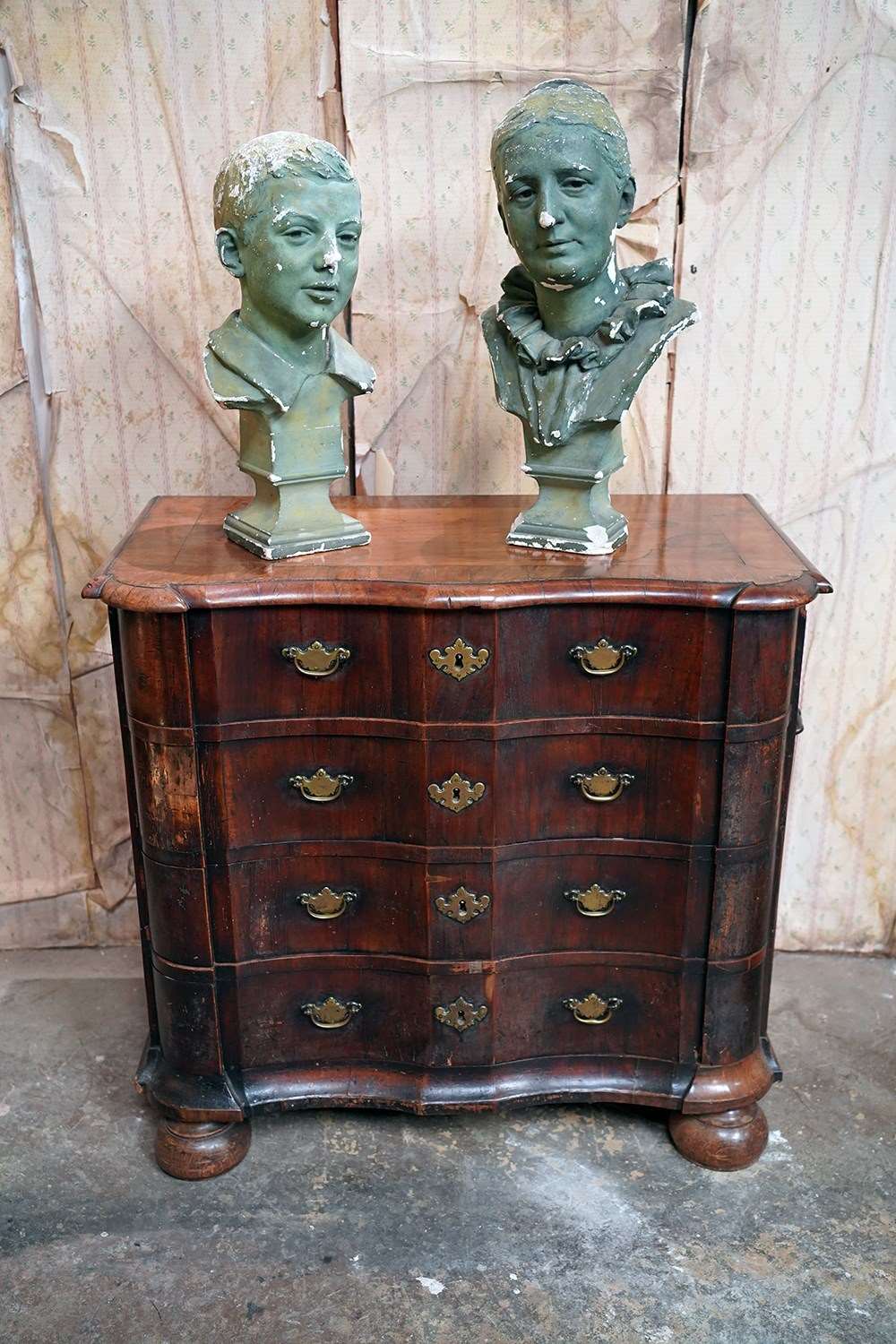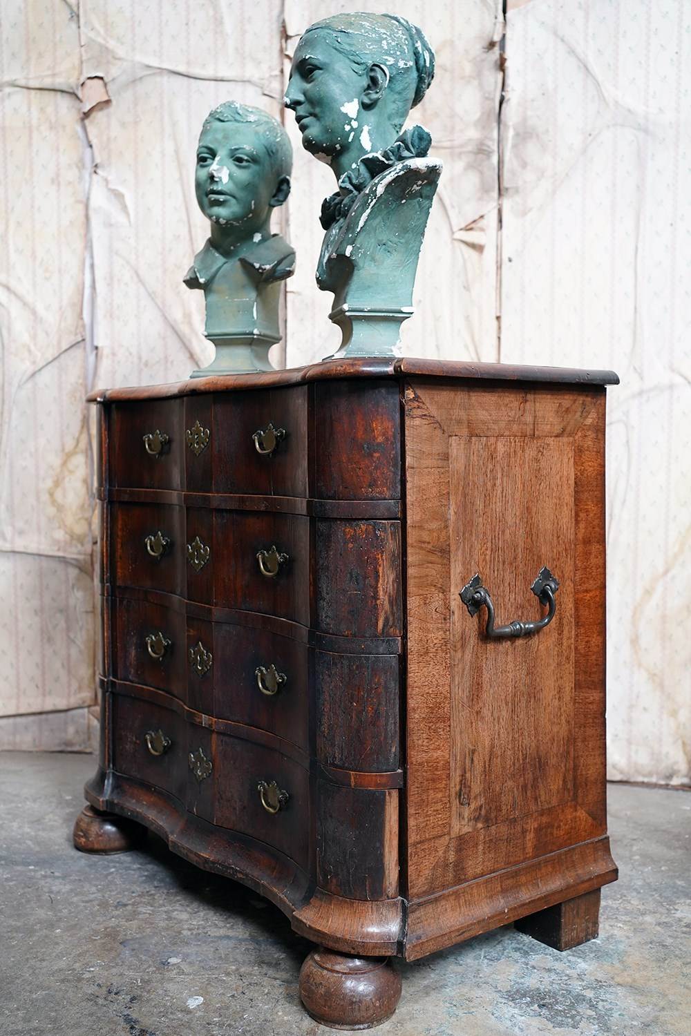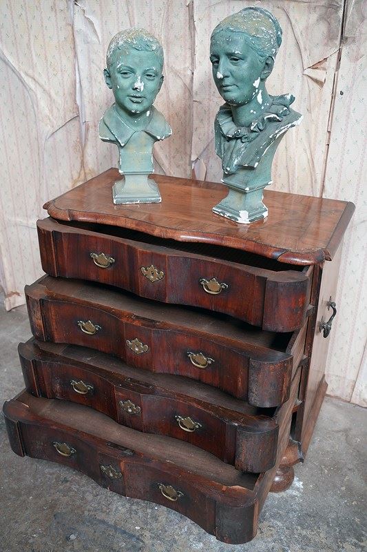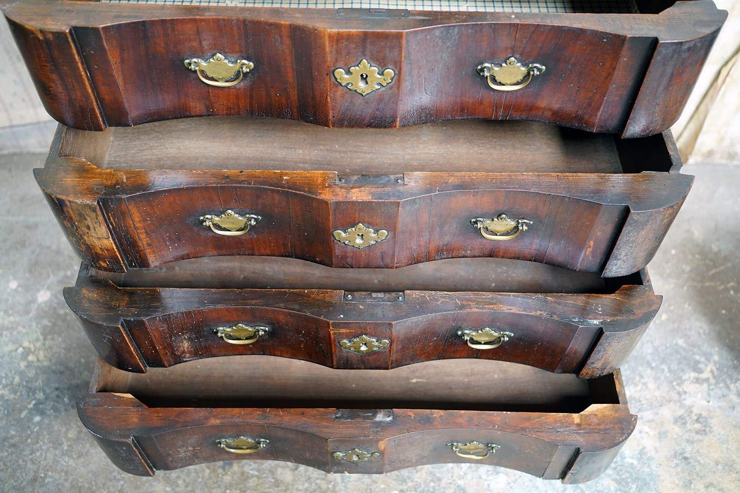 The shaped walnut carcass of superb generous baroque bombe type form, having a moulded top above an arrangement of four long serpentine graduated drawers to shaped ends, with panelled sides each with large brass carrying handles, the frontage with brass drop handles and rococo escutcheons, to a shaped moulded base raised on later(?) bun feet and surviving from the second quarter of eighteenth century Netherlands.