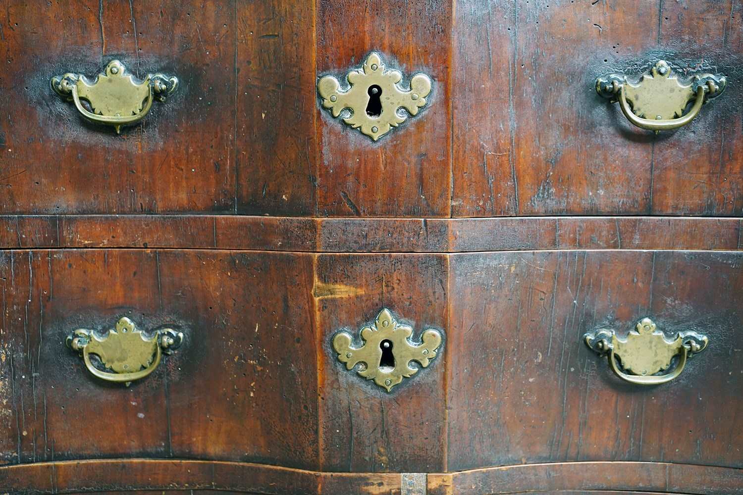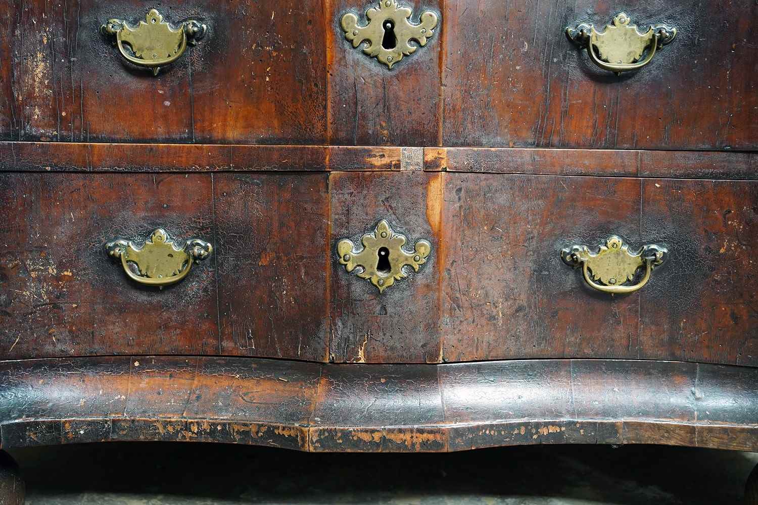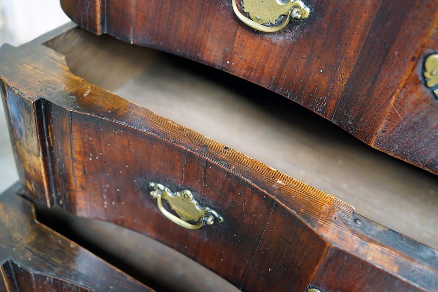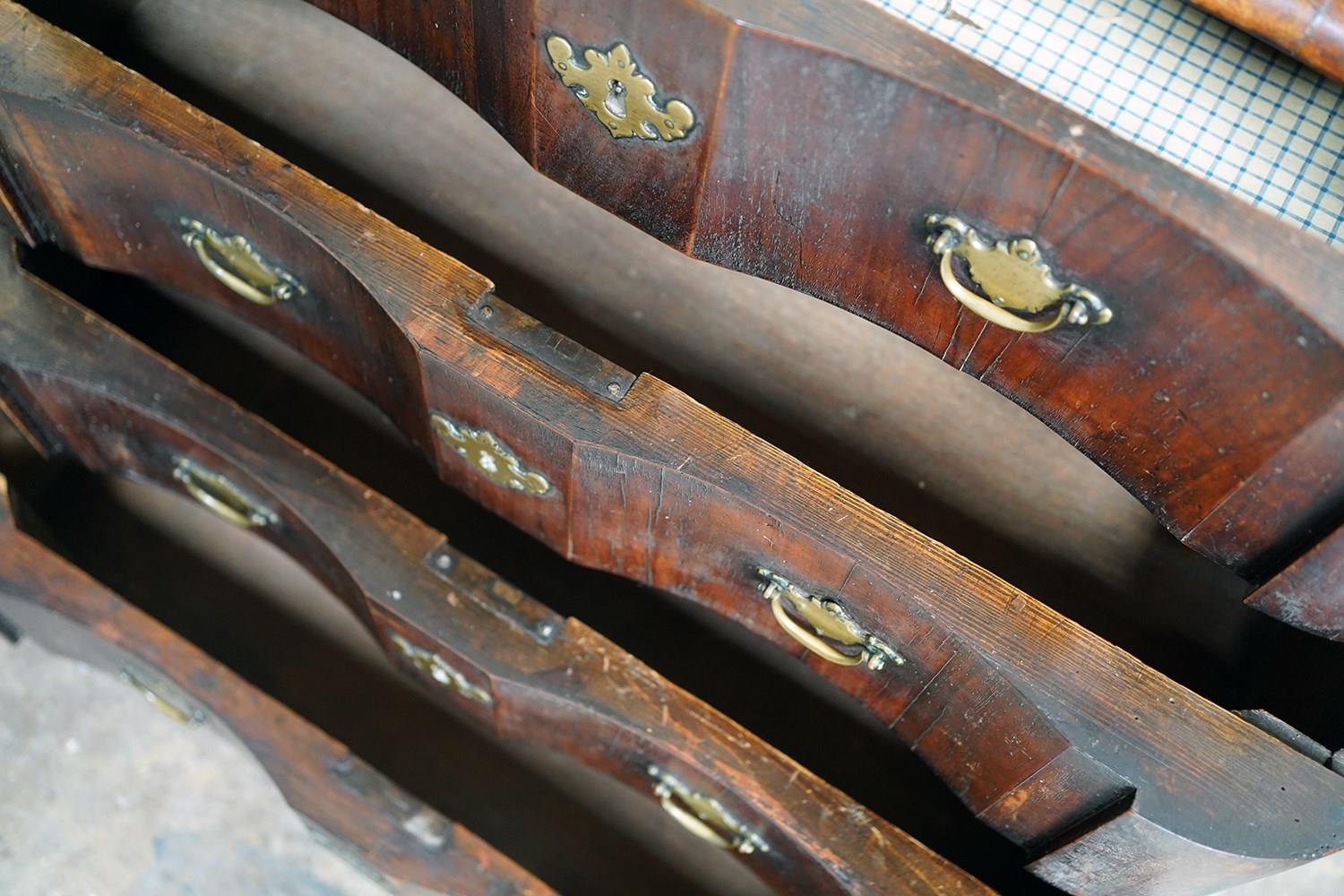 The heavy chest shows some rather attractive wear and tear with scuffing commensurate with its age, the drawers all running smoothly and the carcass structurally sound. Timeworn, unrestored, yet structurally sound and wonderfully cosmetically untouched. There are losses to the veneer, historic marks, warp and shrinkage consistent with age as photographed. It remains untouched and deeply burnished from generations of use with the surfaces now a collage of oxidised walnut veneers, shrinkage lines and time-softened edges.