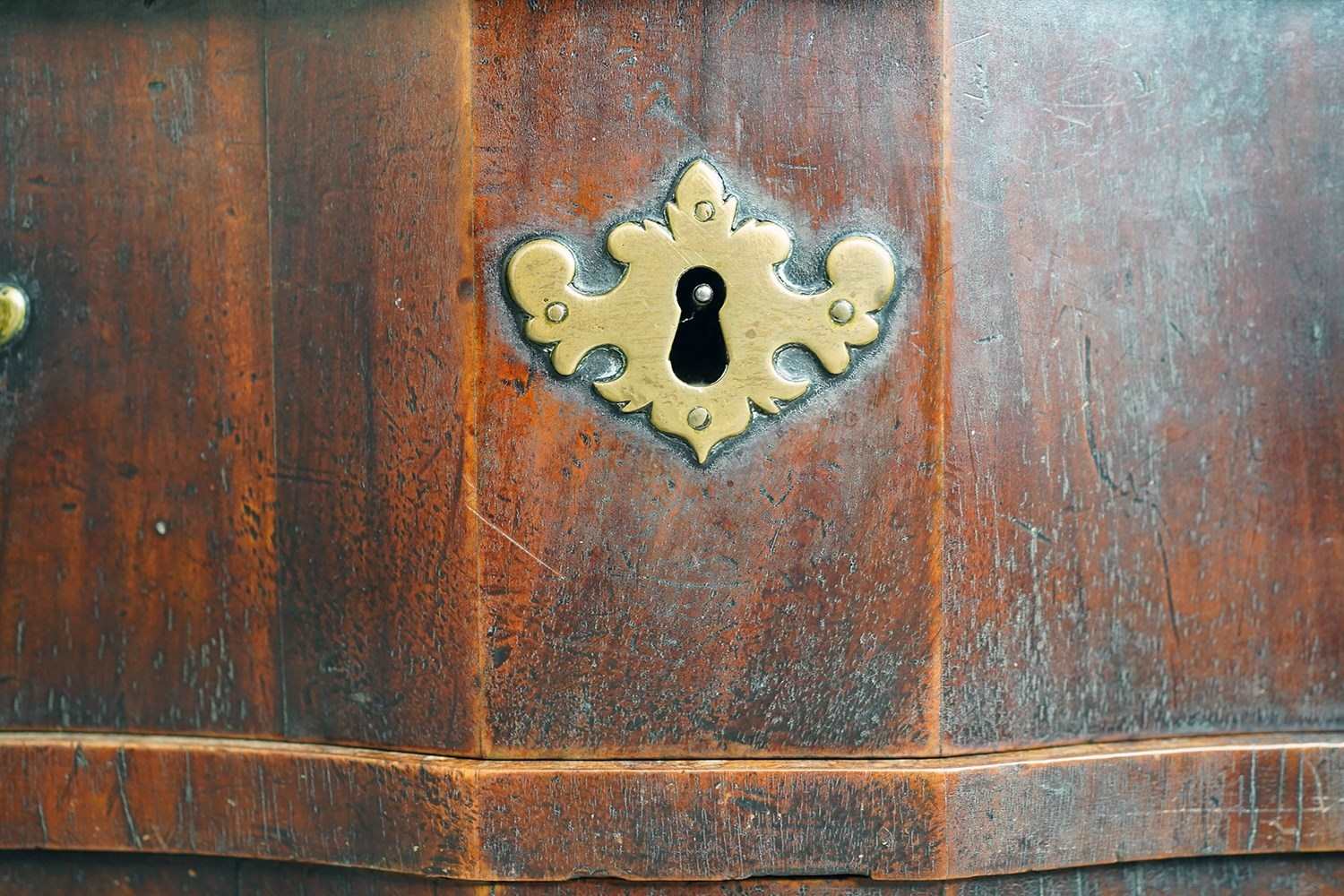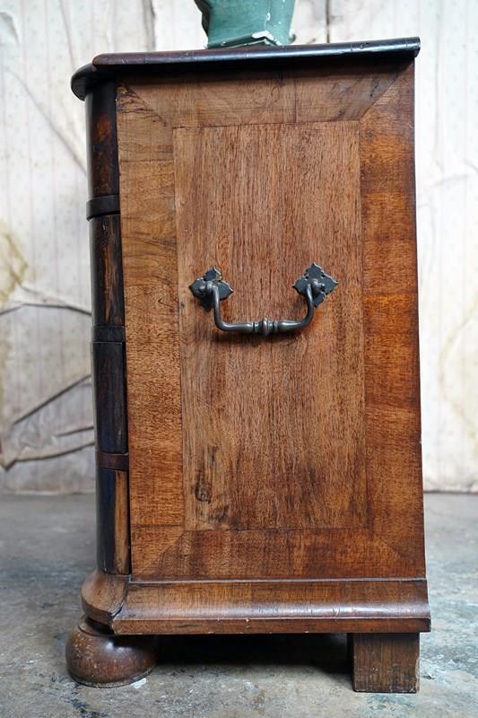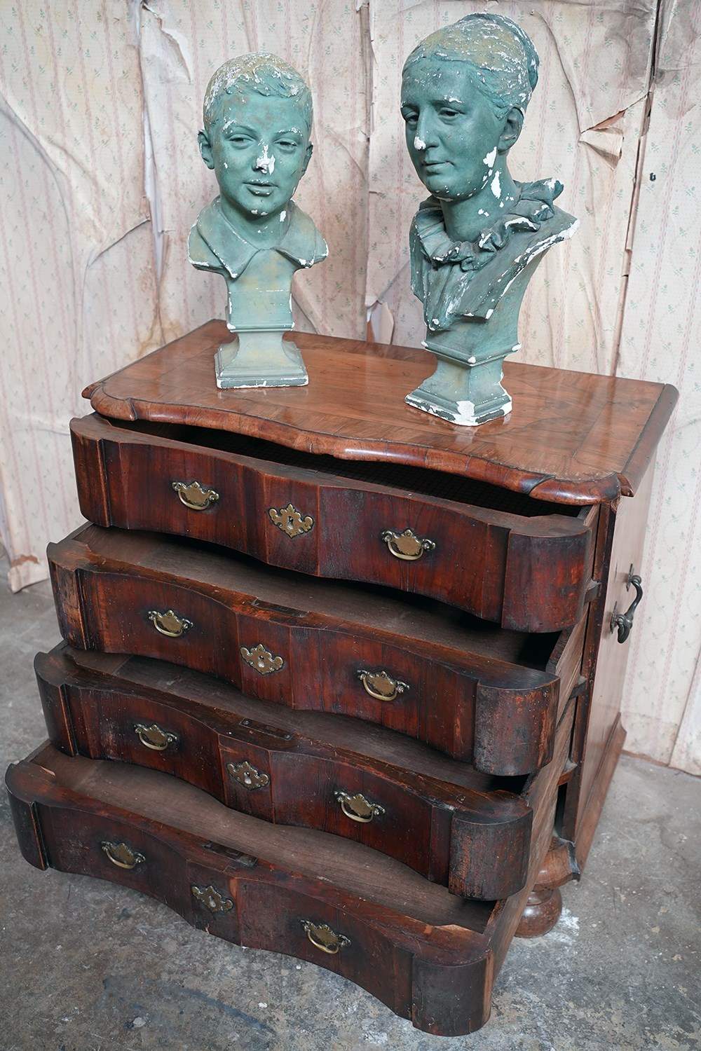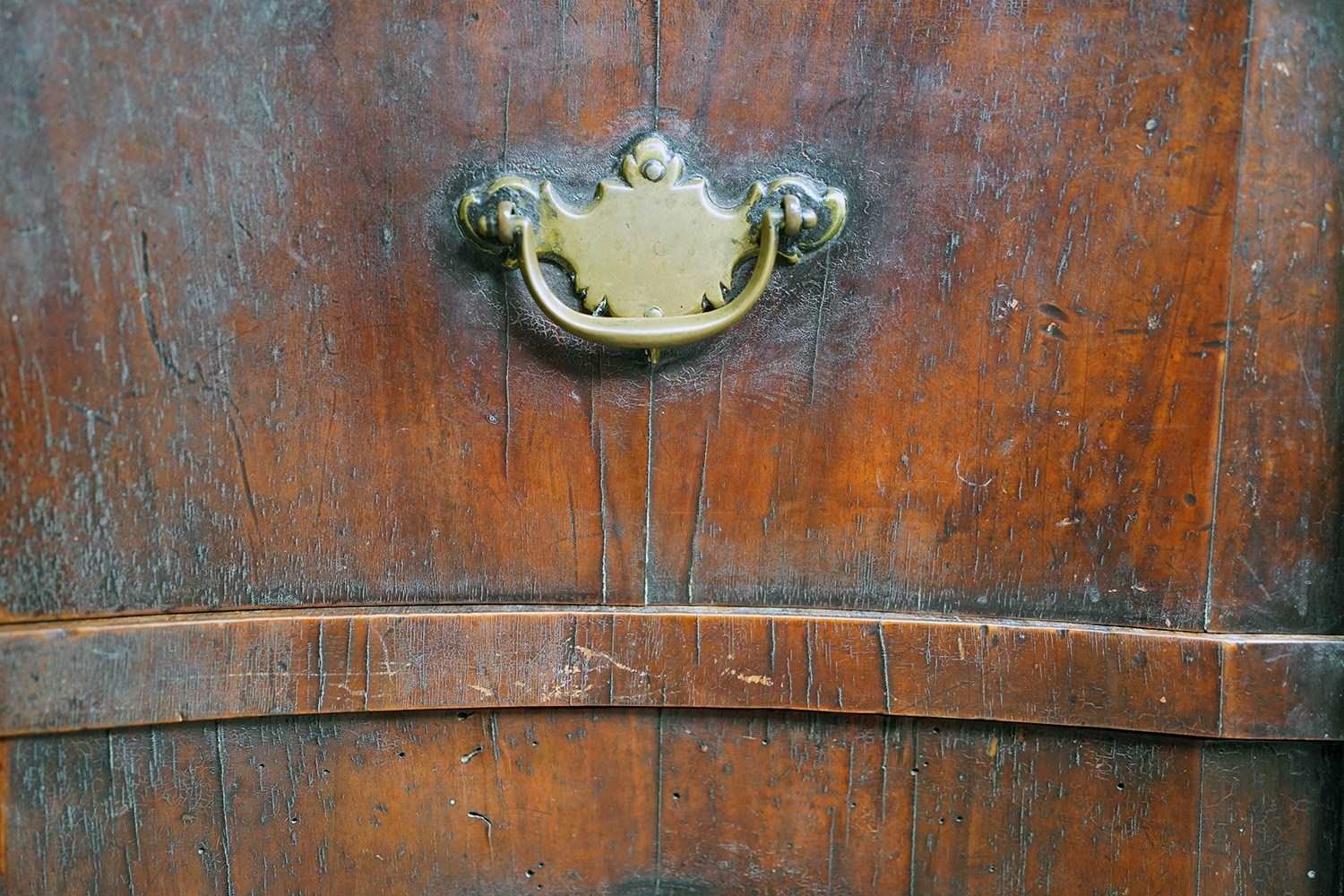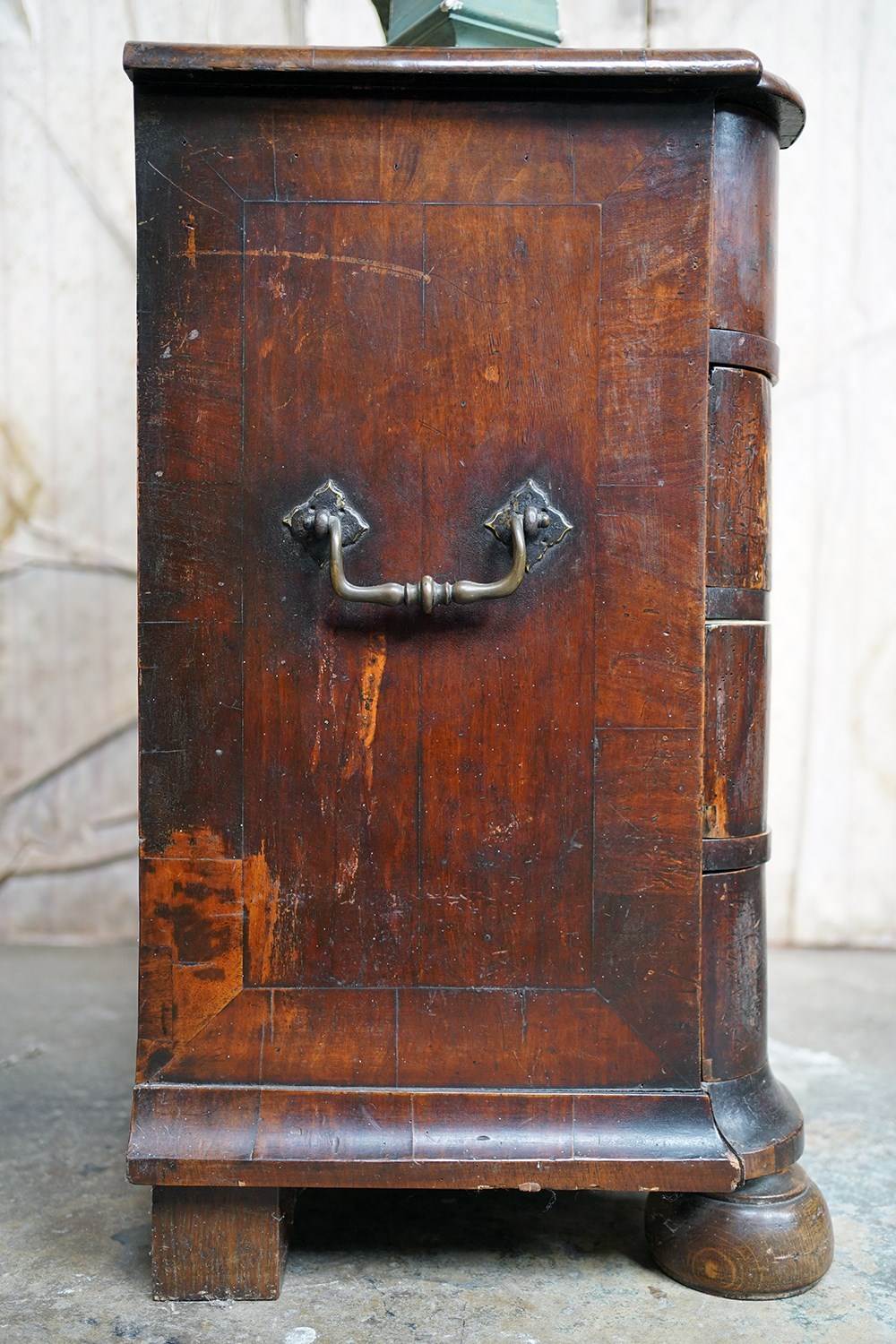 The heavy chest shows some rather attractive wear and tear with scuffing commensurate with its age, the drawers all running smoothly and the carcass structurally sound. Timeworn, unrestored, yet structurally sound and wonderfully cosmetically untouched. There are losses to the veneer, historic marks, warp and shrinkage consistent with age as photographed. It remains untouched and deeply burnished from generations of use with the surfaces now a collage of oxidised walnut veneers, shrinkage lines and time-softened edges.