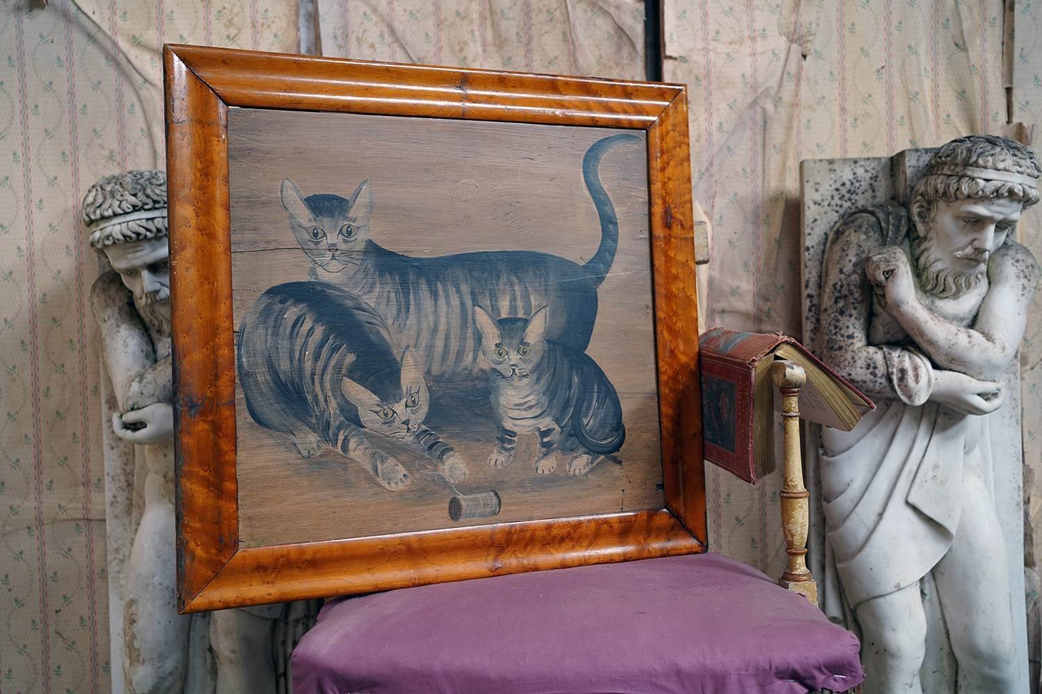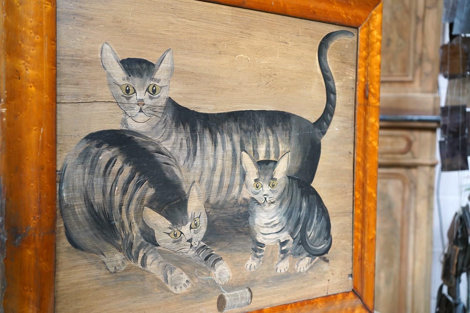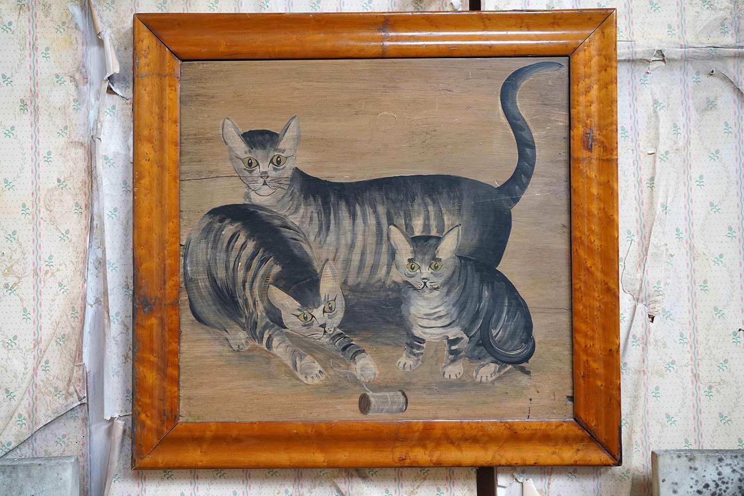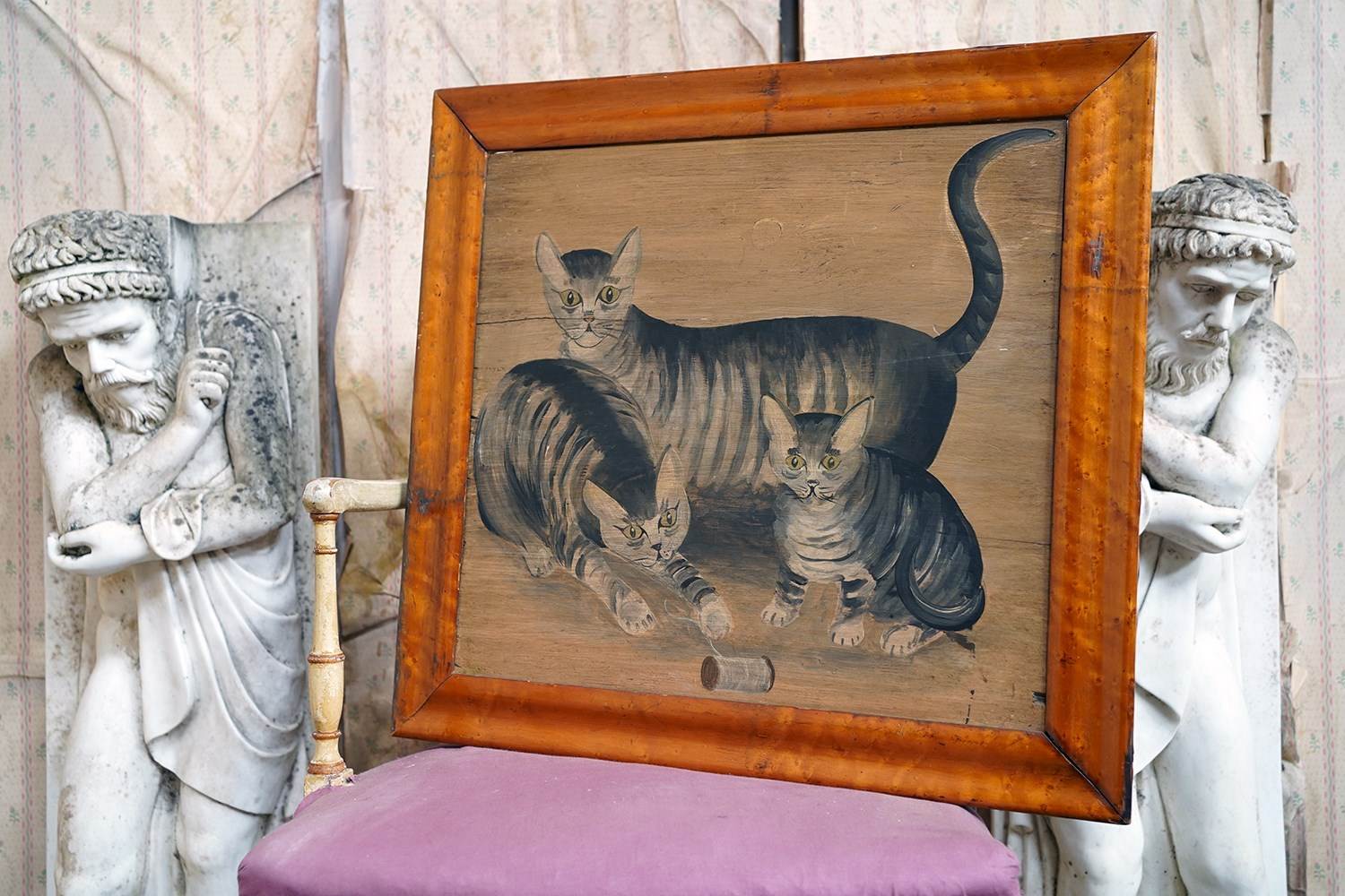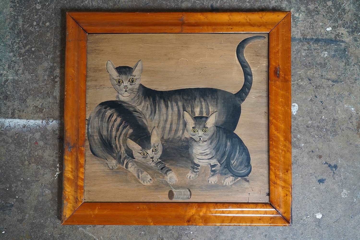 The charming and highly decorative naïve school painting depicting three kittens gathered around a small wooden reel of thread, rendered in oil on a single-piece panel, the composition being simple yet engaging: one kitten crouches playfully in the foreground, paw extended toward the thread, whilst the second sits upright in quiet observation and a third stands protectively behind, its arched back and raised tail lending a subtle sense of movement and hierarchy to the scene; the whole painted during the second quarter of the nineteenth century.