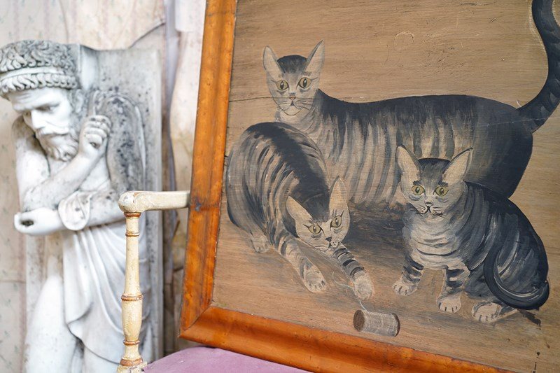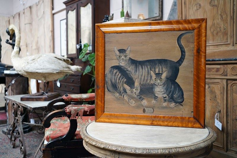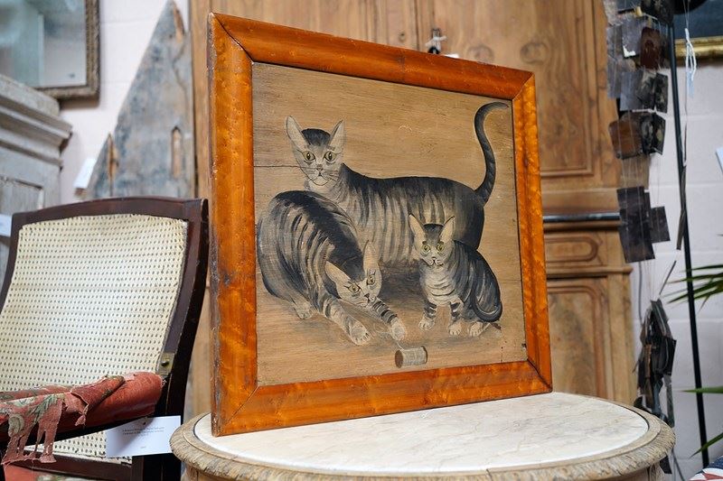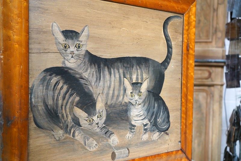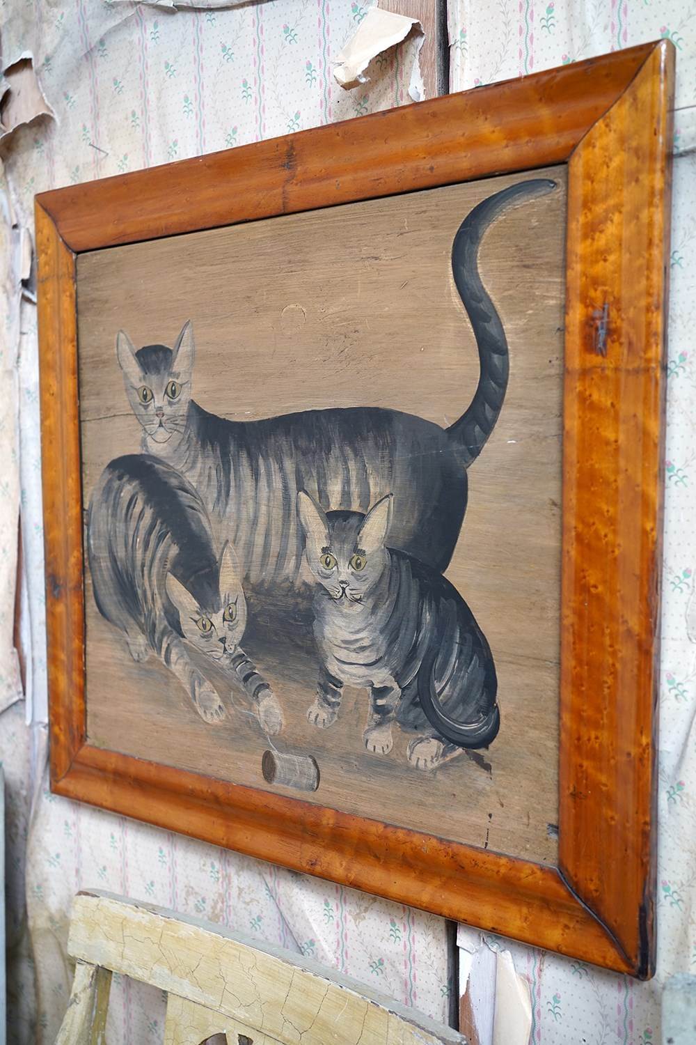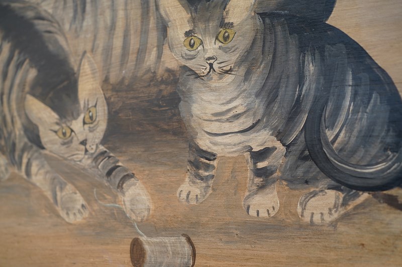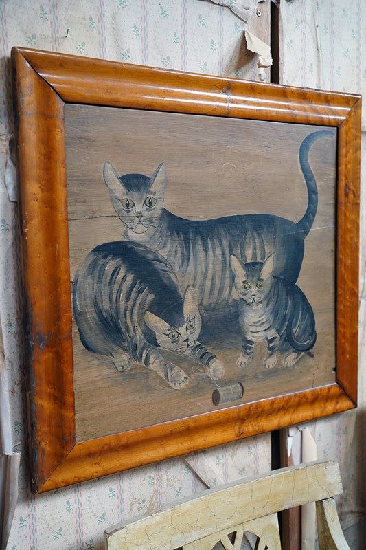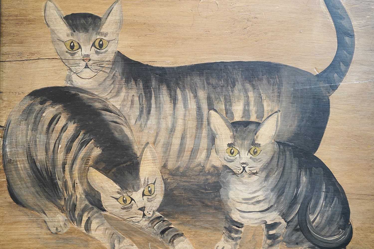 The charming and highly decorative naïve school painting depicting three kittens gathered around a small wooden reel of thread, rendered in oil on a single-piece panel, the composition being simple yet engaging: one kitten crouches playfully in the foreground, paw extended toward the thread, whilst the second sits upright in quiet observation and a third stands protectively behind, its arched back and raised tail lending a subtle sense of movement and hierarchy to the scene; the whole painted during the second quarter of the nineteenth century.