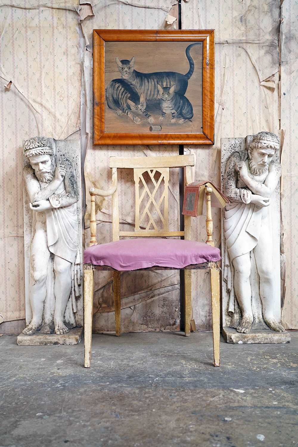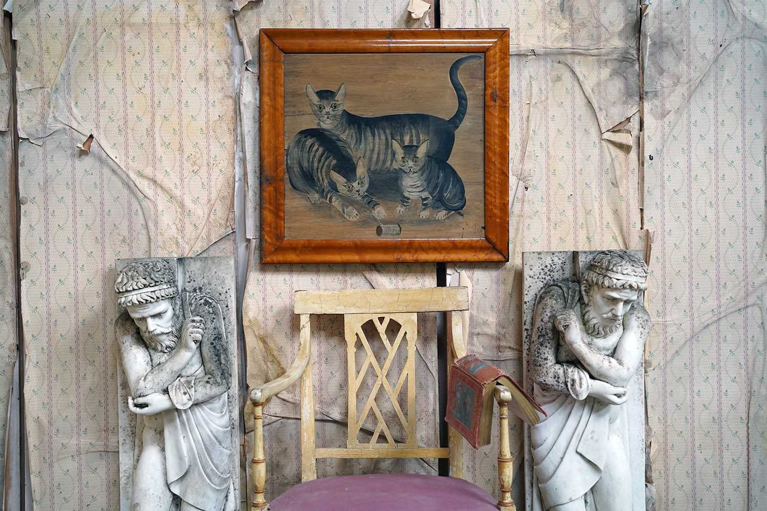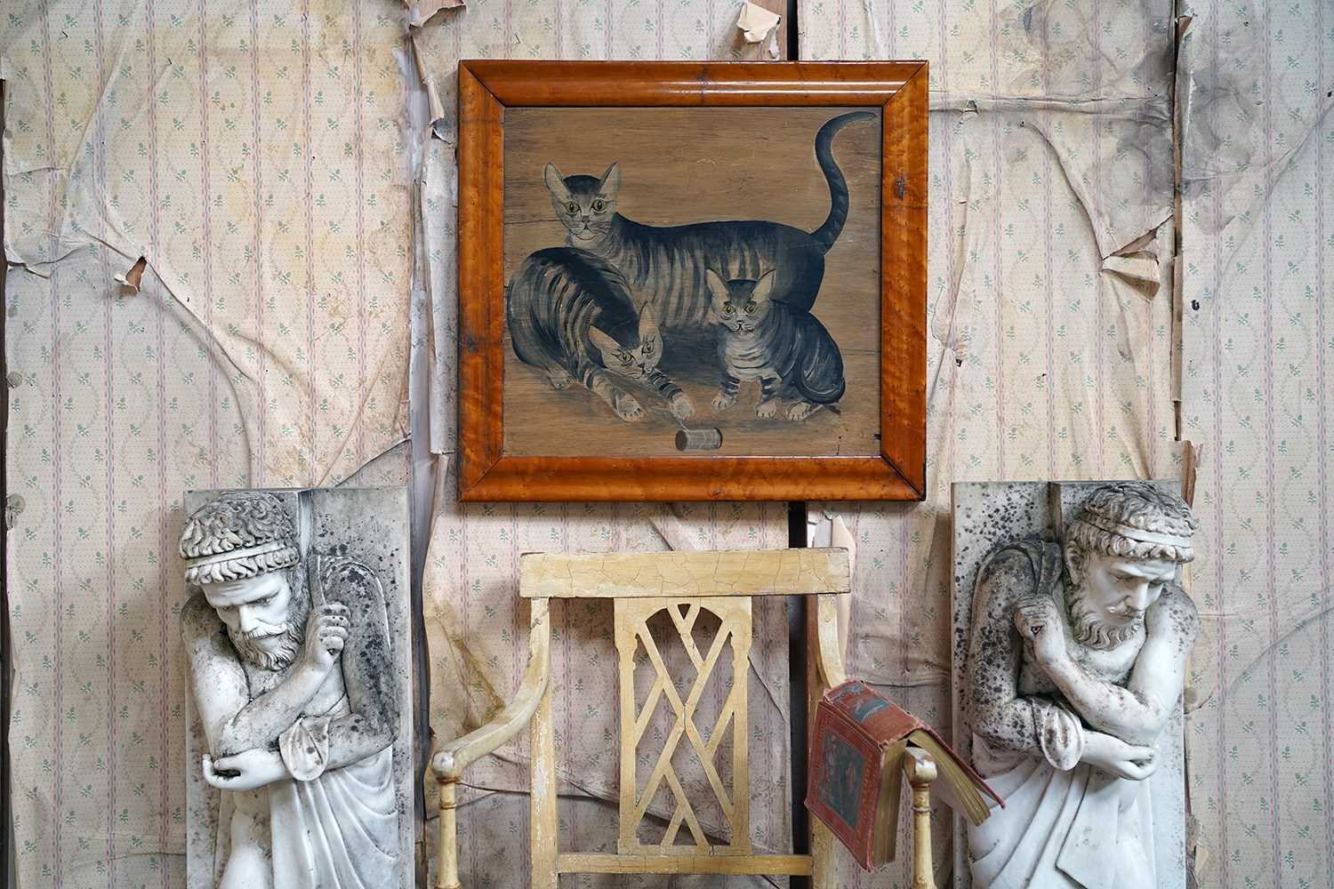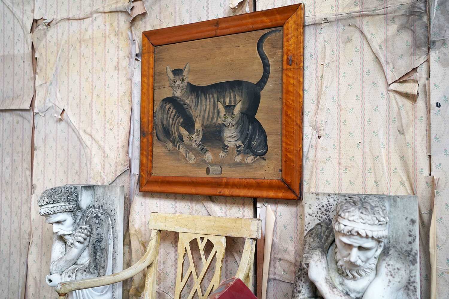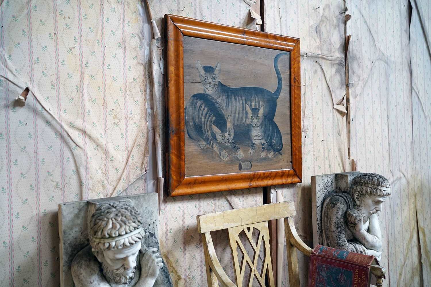 The charming and highly decorative naïve school painting depicting three kittens gathered around a small wooden reel of thread, rendered in oil on a single-piece panel, the composition being simple yet engaging: one kitten crouches playfully in the foreground, paw extended toward the thread, whilst the second sits upright in quiet observation and a third stands protectively behind, its arched back and raised tail lending a subtle sense of movement and hierarchy to the scene; the whole painted during the second quarter of the nineteenth century.
