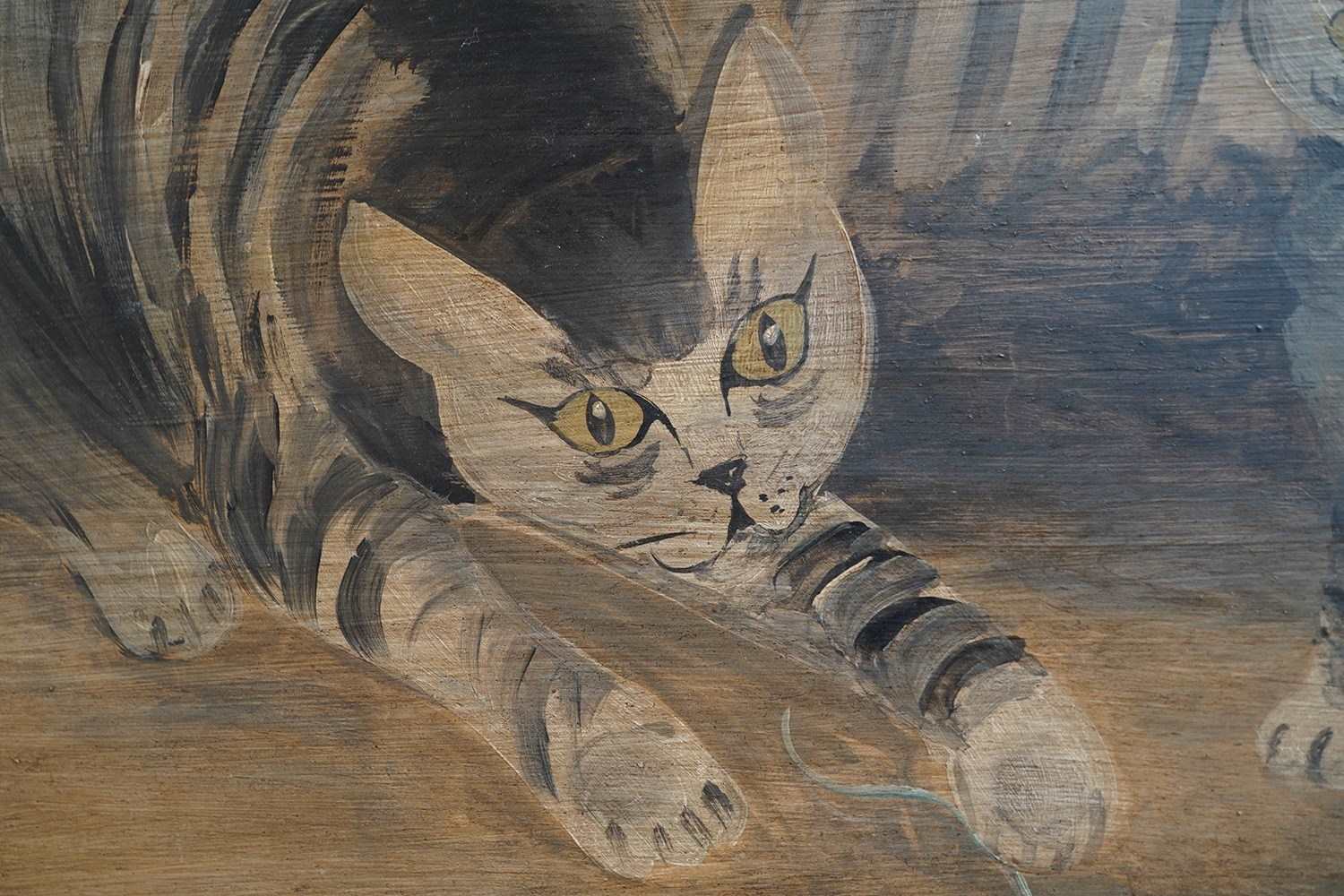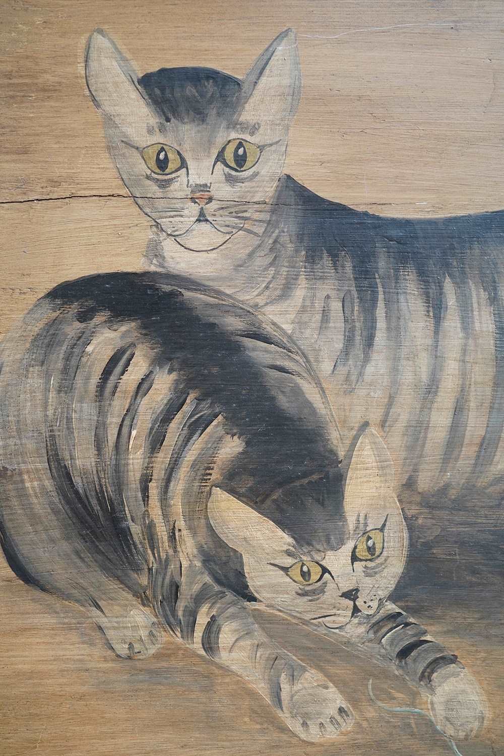 Executed with a confident but unschooled hand, the artist has prioritised expression and character over strict anatomical accuracy. The kittens are given exaggerated, almond-shaped eyes and softly stylised features, imbuing them with a distinctly human charm. Their striped coats are suggested through loose, fluid brushwork, with darker washes pulled through a warm, honeyed ground that allows the tone of the panel itself to participate in the overall palette.