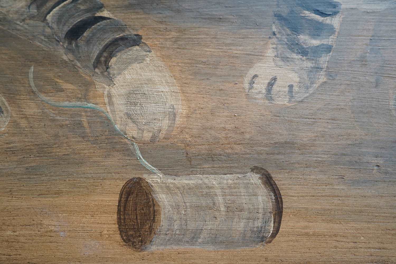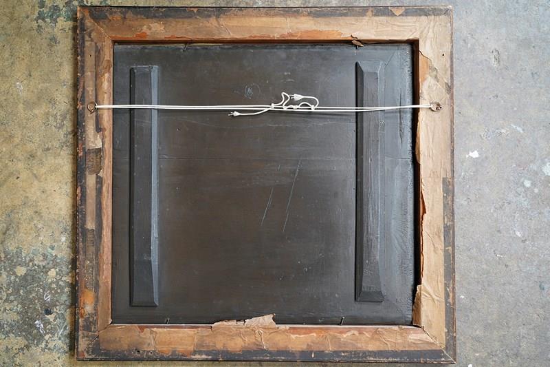 The surface is particularly appealing; and its condition is consistent with age: areas of surface wear, light abrasions, and minor paint loss throughout, all of which contribute positively to its character. No evidence of heavy overpainting or restoration is apparent from the images, and the piece retains an honest, untouched feel. The paint has worn thin in places, revealing the underlying timber and creating a beautifully integrated patina. There is a dryness to the finish consistent with early nineteenth century provincial work, and the limited palette; earth browns, soft blacks, and muted creams all add to its quiet authenticity. The panel itself shows a natural horizontal join line, one hairline crack to the upper left area and minor age-related movement, entirely in keeping with its construction and age and is housed in what could be a slightly later nineteenth century maple frame, which complements the tones of the painting well and enhances its overall presence.