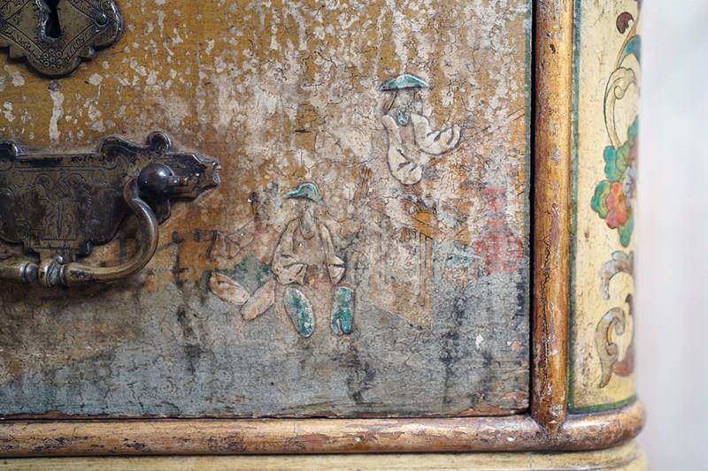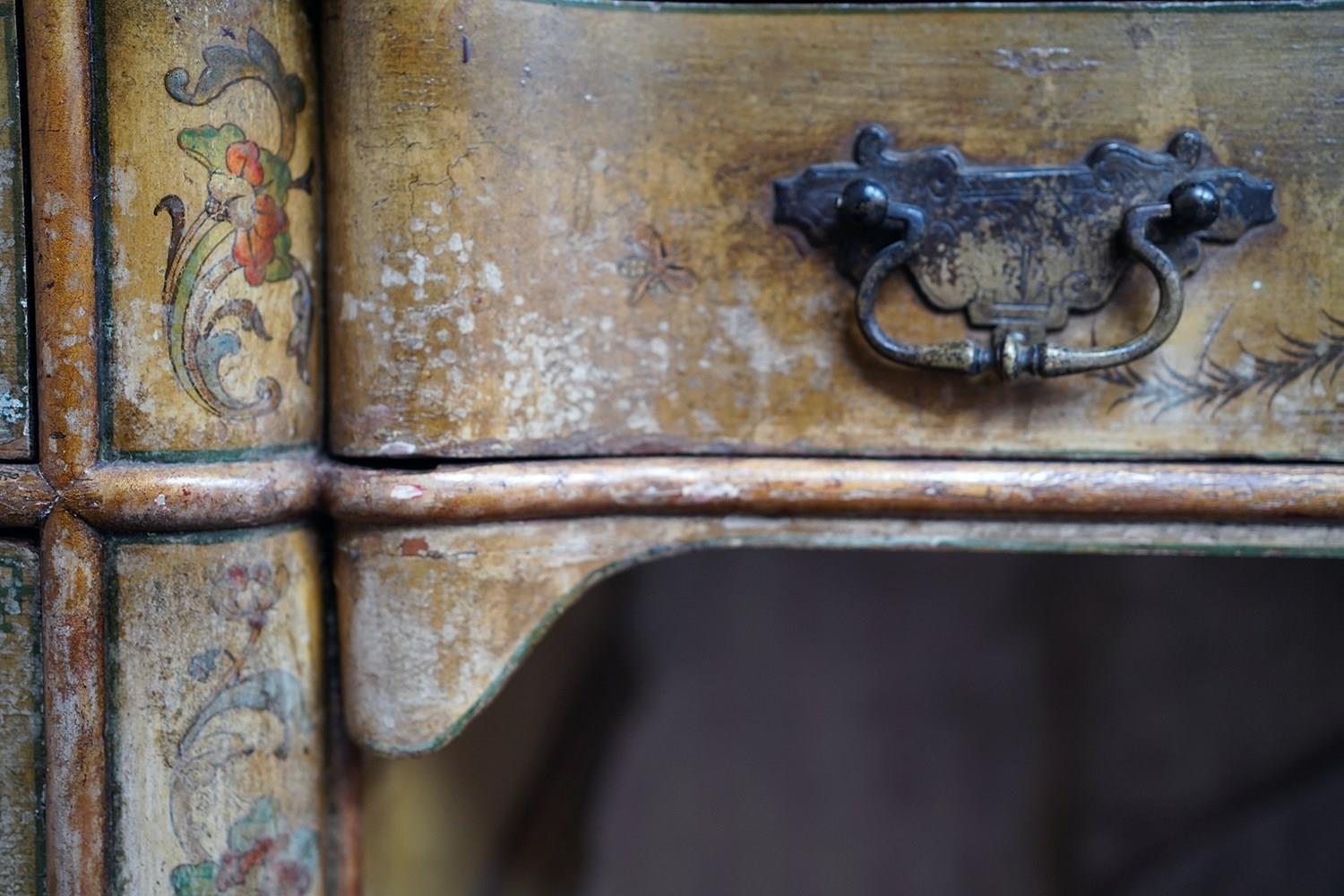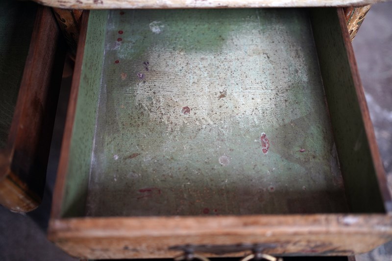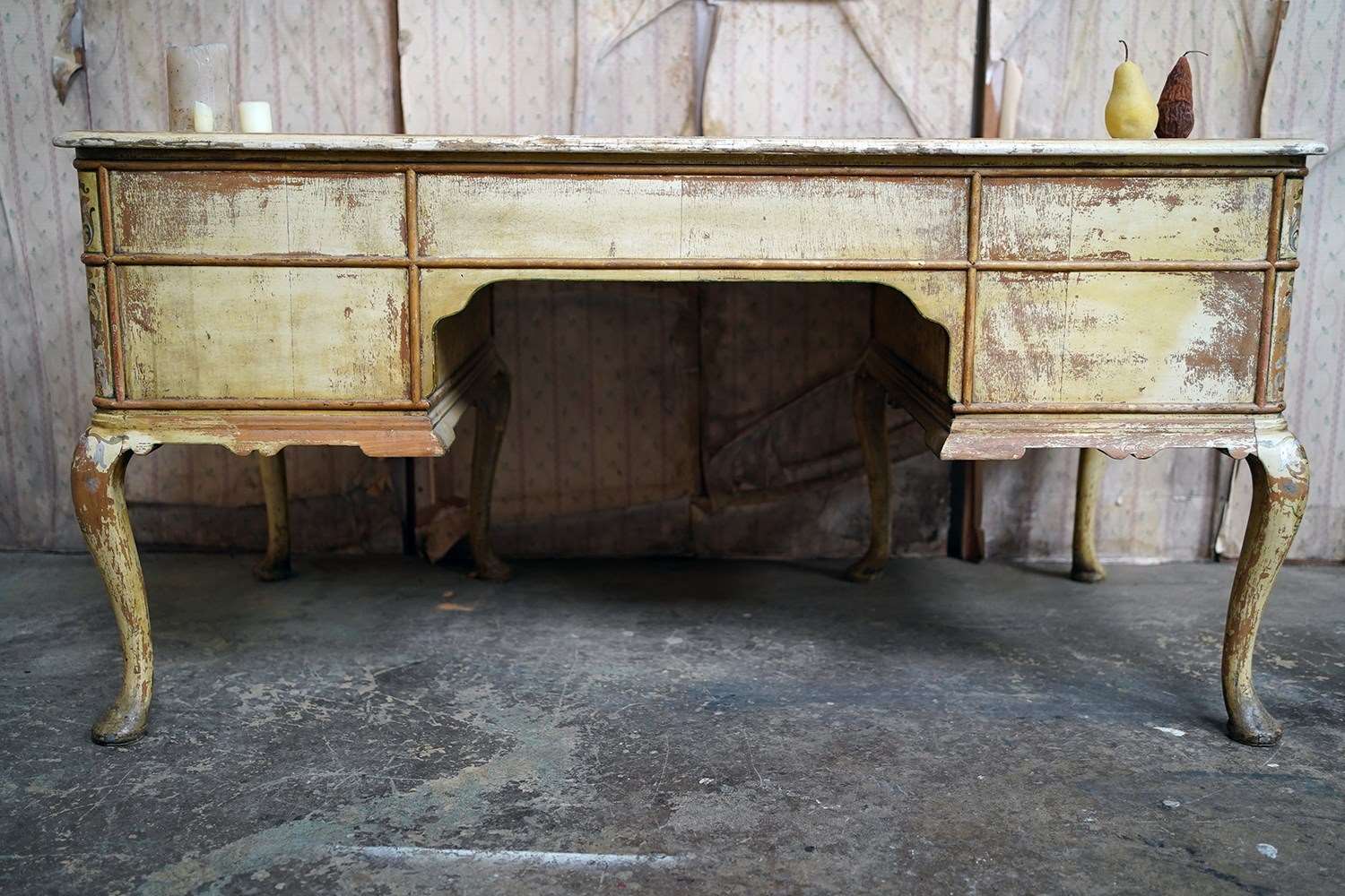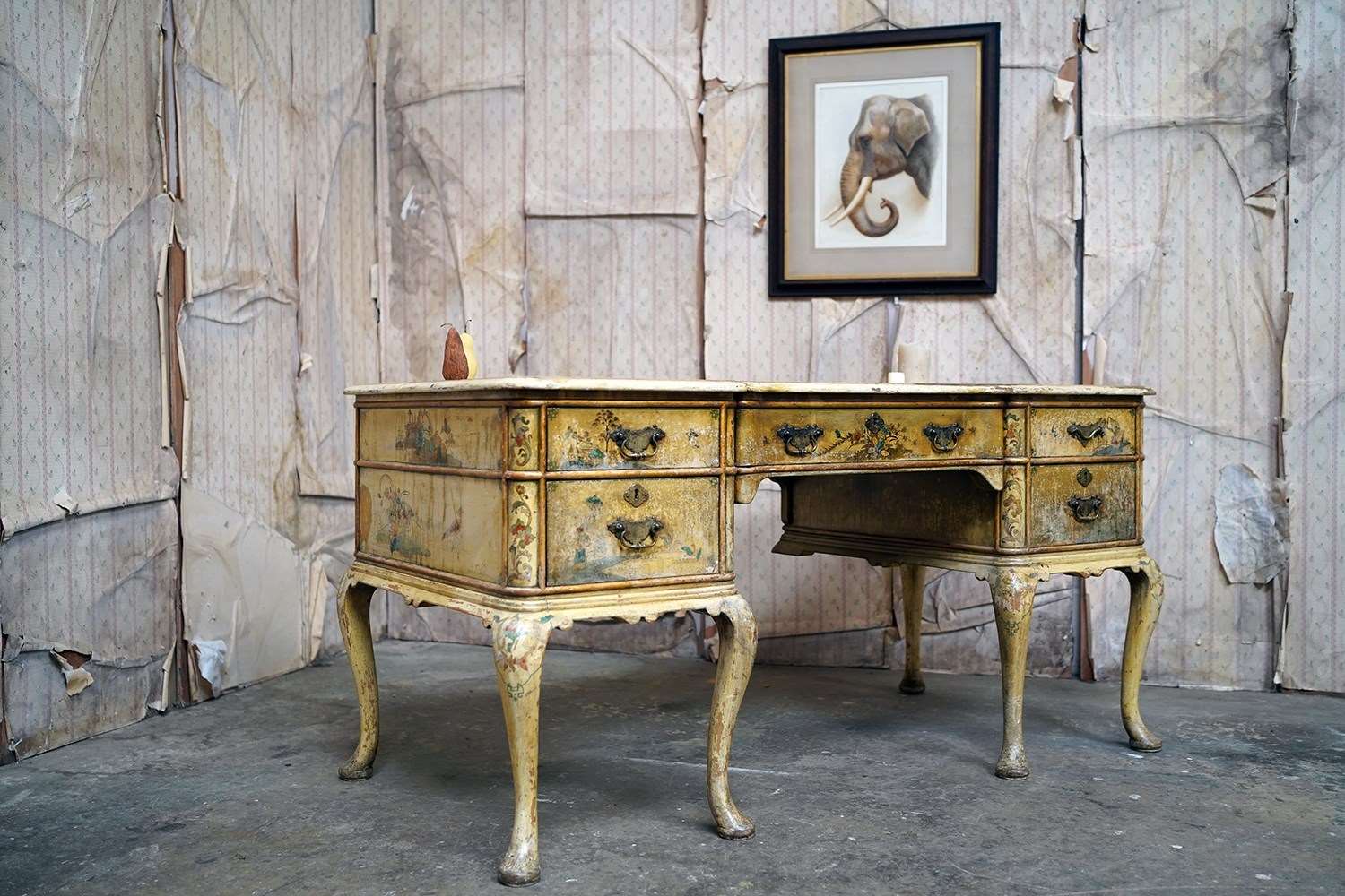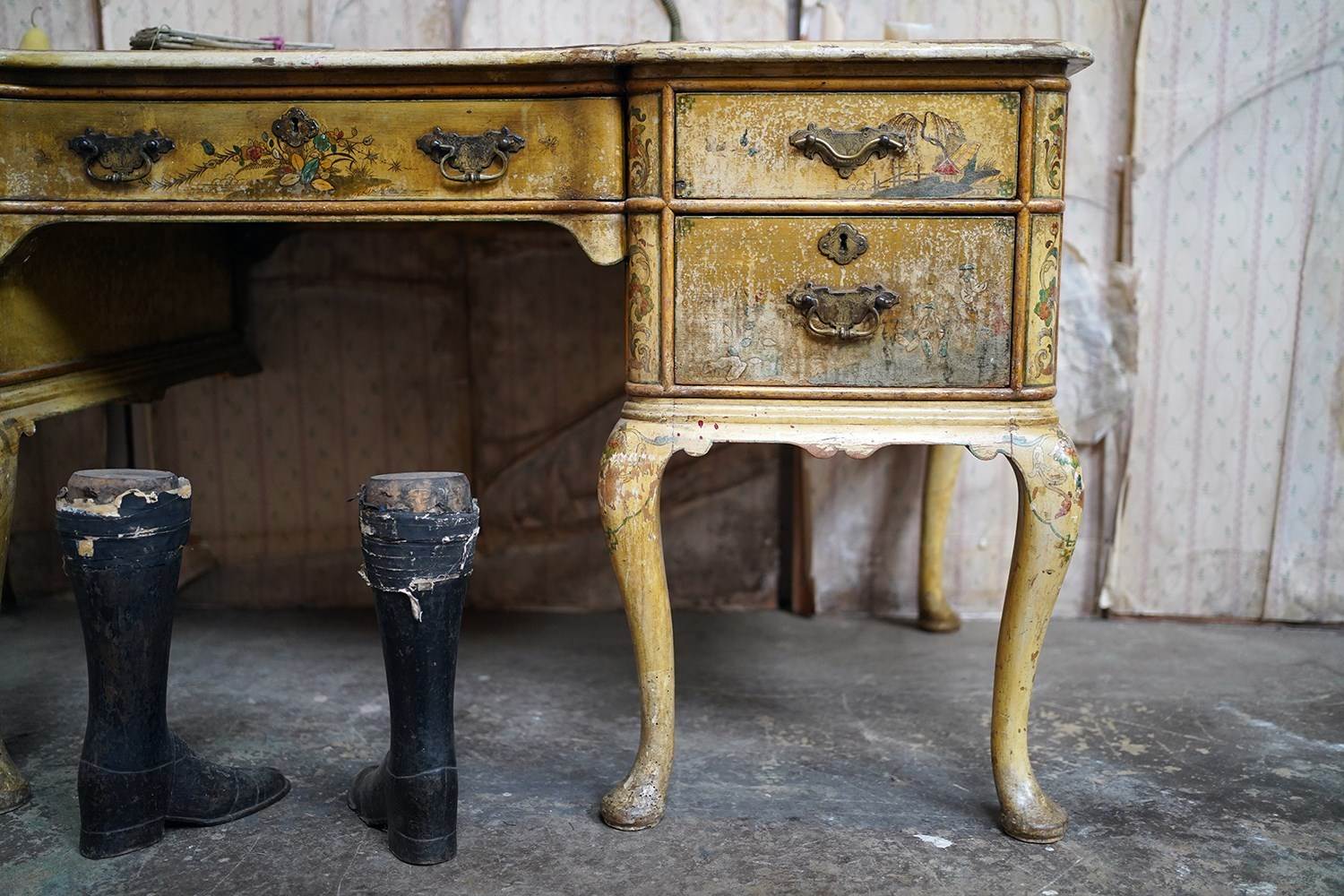 The condition of the desk is completely original and very much of the country house, i.e. lived in but thoroughly evocative of its story so far. The decoration continues uninterrupted across the drawer fronts, sides, and legs, creating a cohesive and immersive surface. There is visible craquelure, rubbing, losses, and fading to the painted decoration, particularly to the writing surface and edges, consistent with age and prolonged use. These signs of wear lend the piece a wonderful patina and depth rather than detracting from its presence. The structure is sound, with the drawers running well, and the hardware is original aside from one handle that is a later replacement.