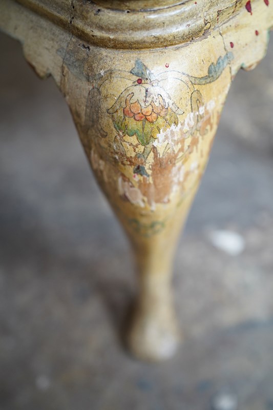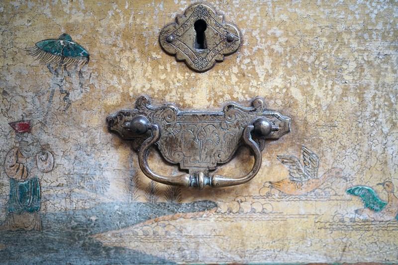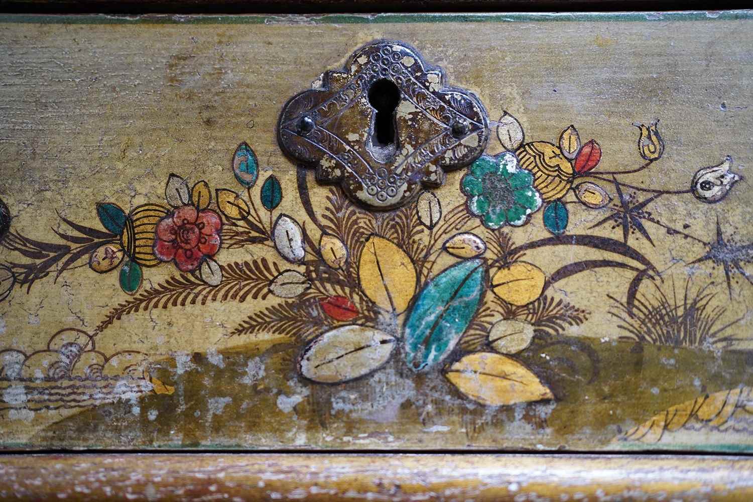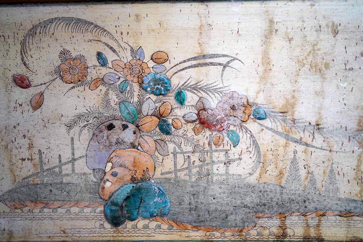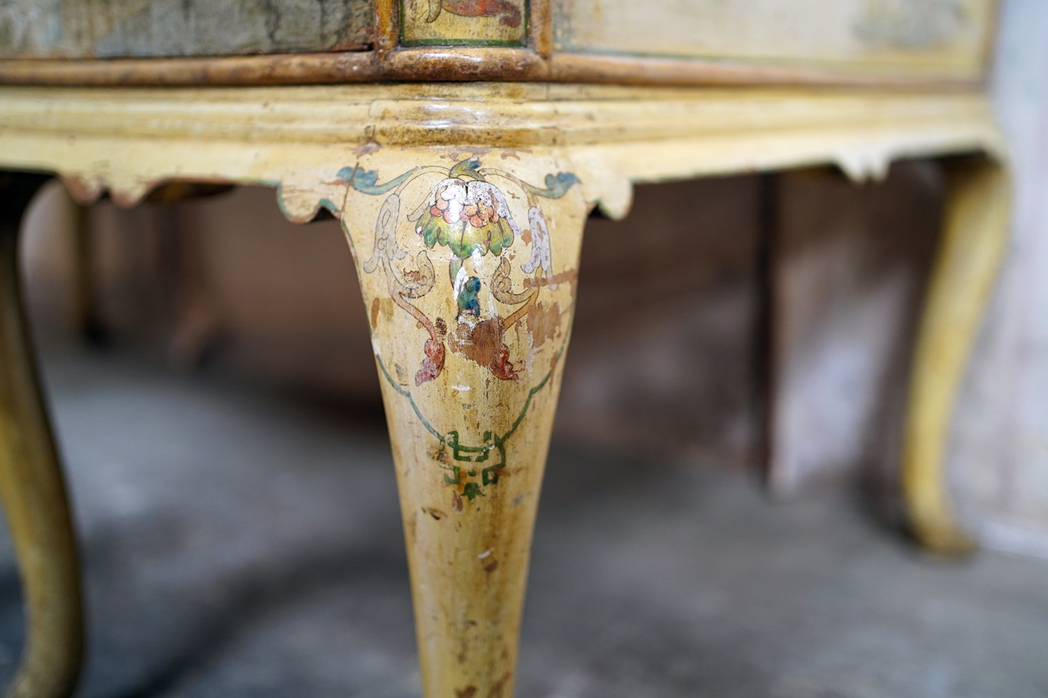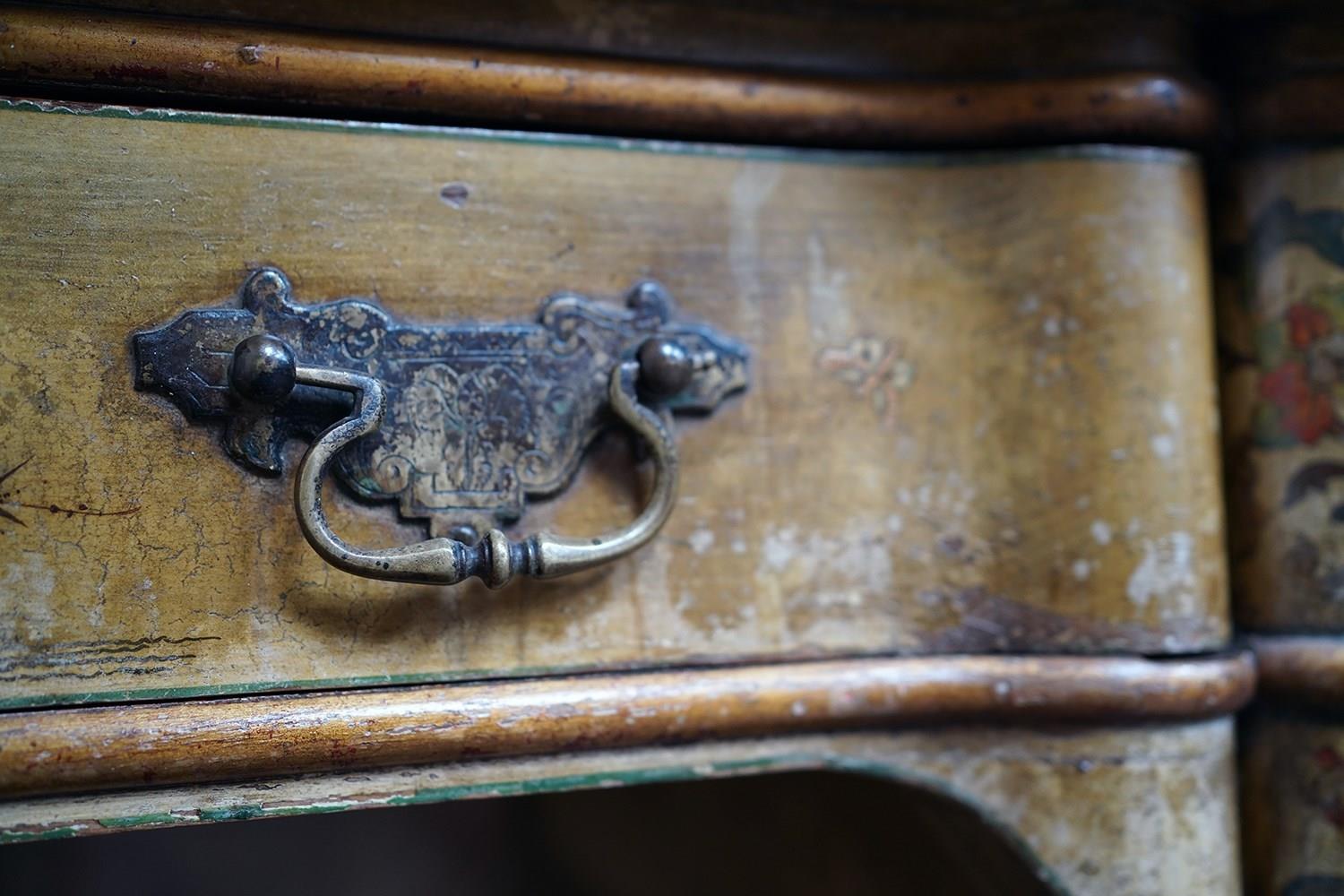 The condition of the desk is completely original and very much of the country house, i.e. lived in but thoroughly evocative of its story so far. The decoration continues uninterrupted across the drawer fronts, sides, and legs, creating a cohesive and immersive surface. There is visible craquelure, rubbing, losses, and fading to the painted decoration, particularly to the writing surface and edges, consistent with age and prolonged use. These signs of wear lend the piece a wonderful patina and depth rather than detracting from its presence. The structure is sound, with the drawers running well, and the hardware is original aside from one handle that is a later replacement.