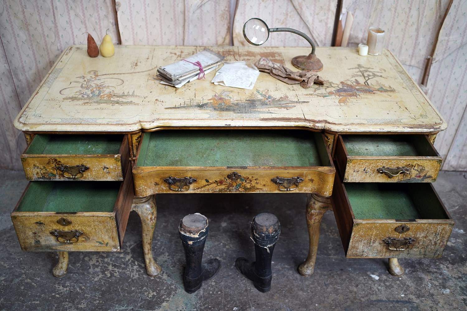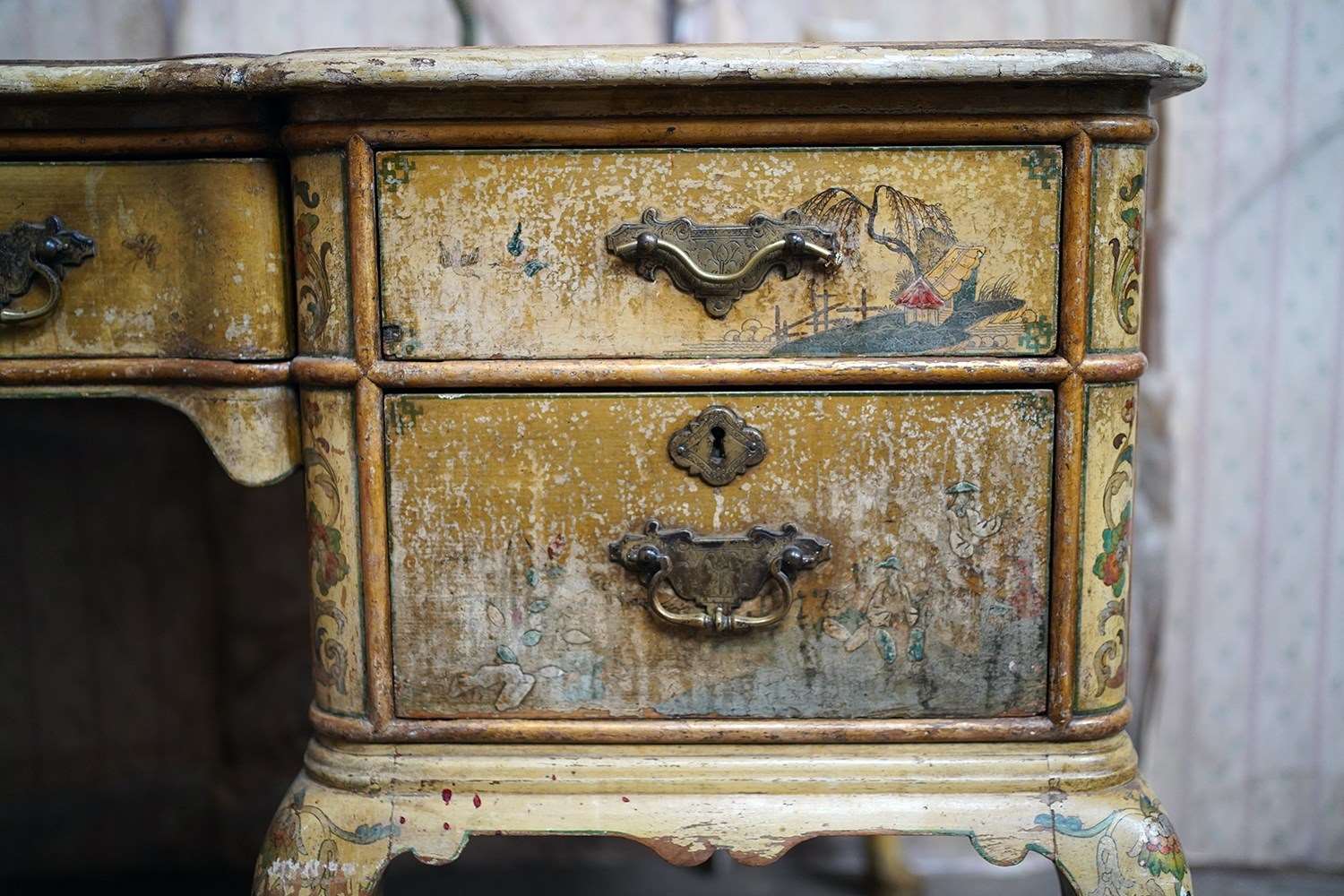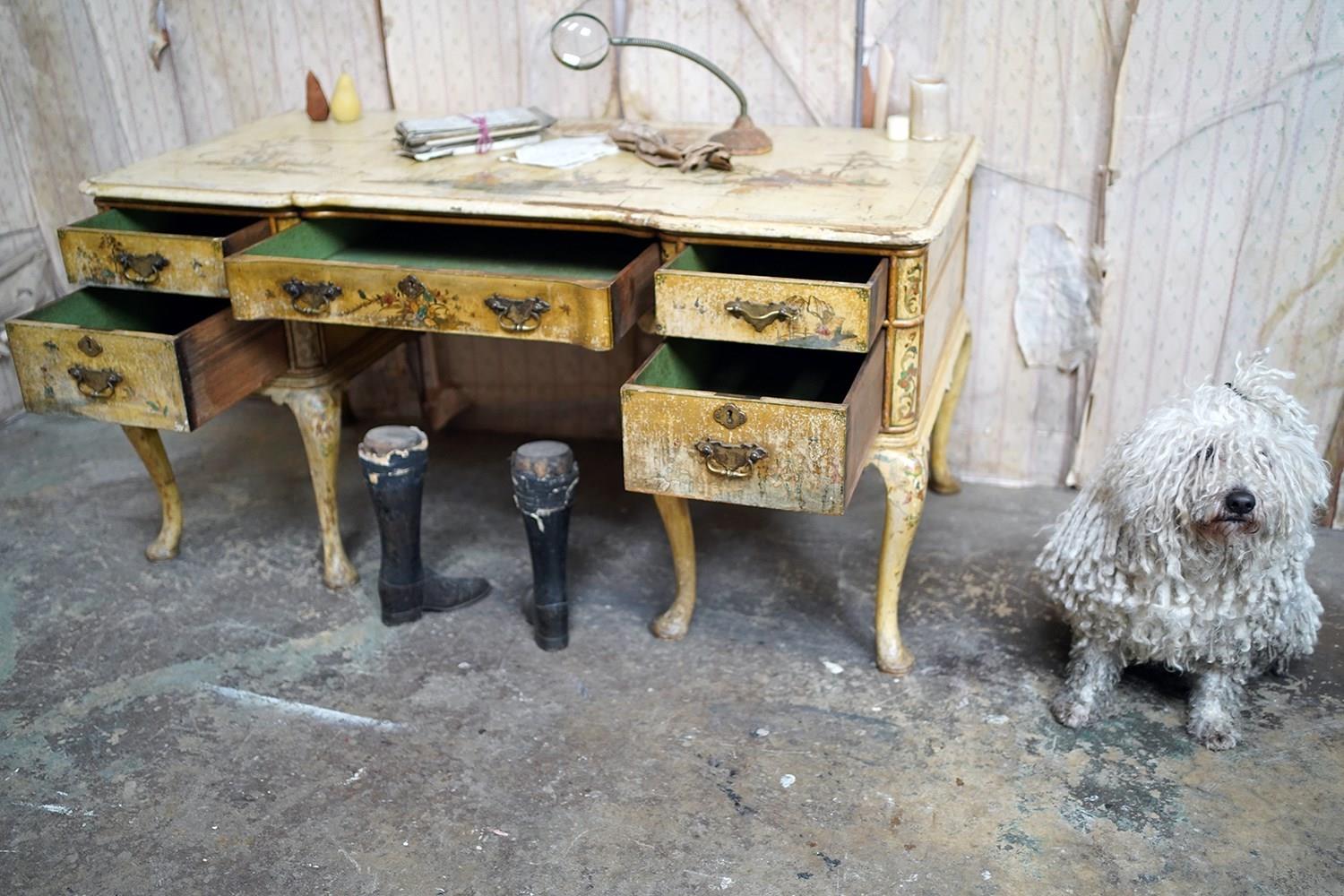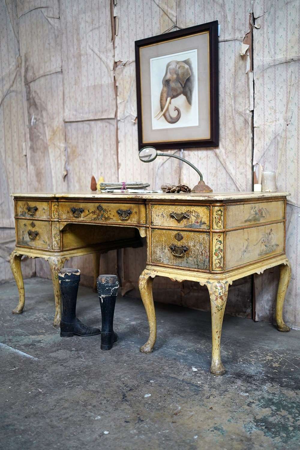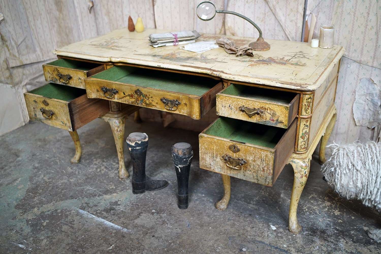 Overall, this is a highly characterful and visually arresting writing desk, rich in surface, texture, and narrative. Its timeworn chinoiserie decoration, elegant proportions, and honest wear make it an ideal piece for a country house interior or layered, collected setting, where patina and storytelling are prized above perfection.