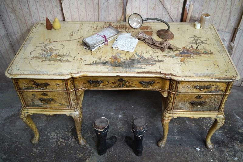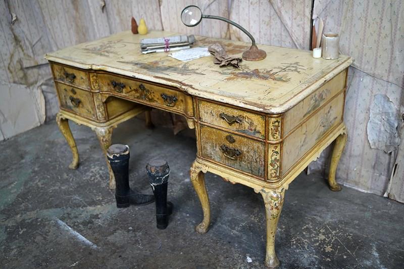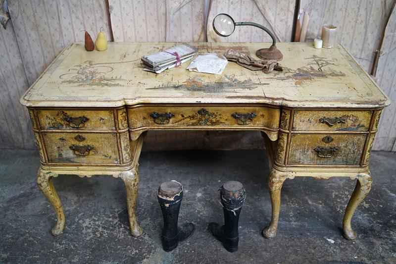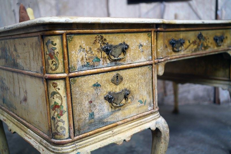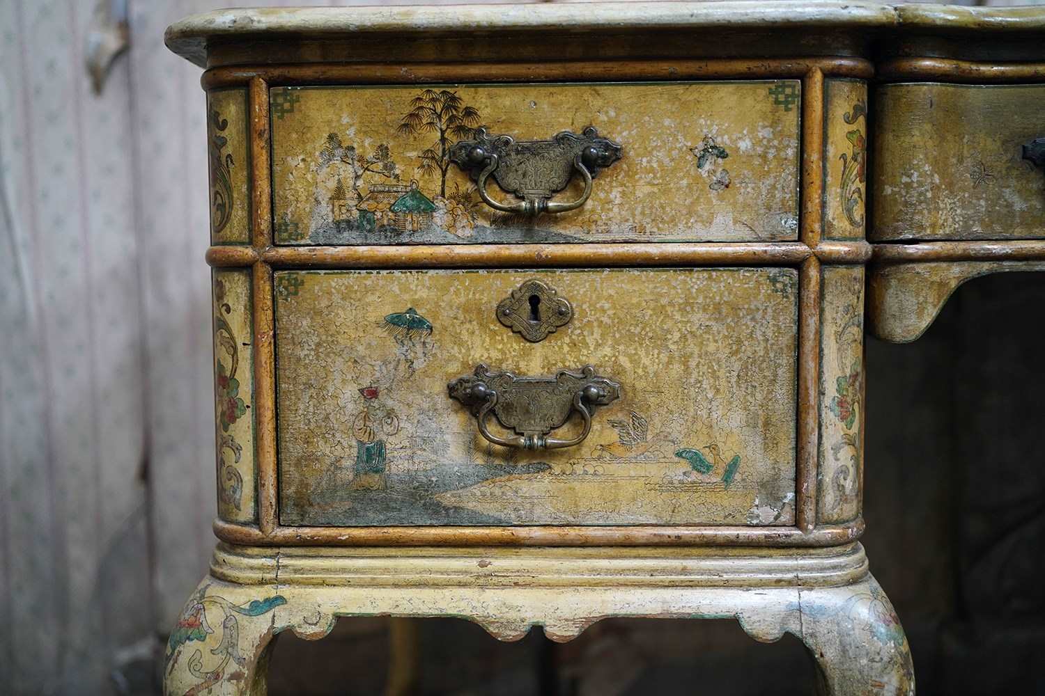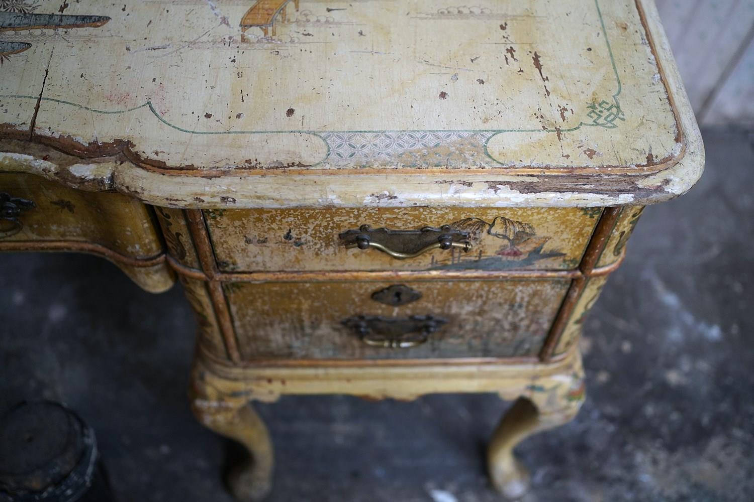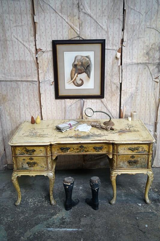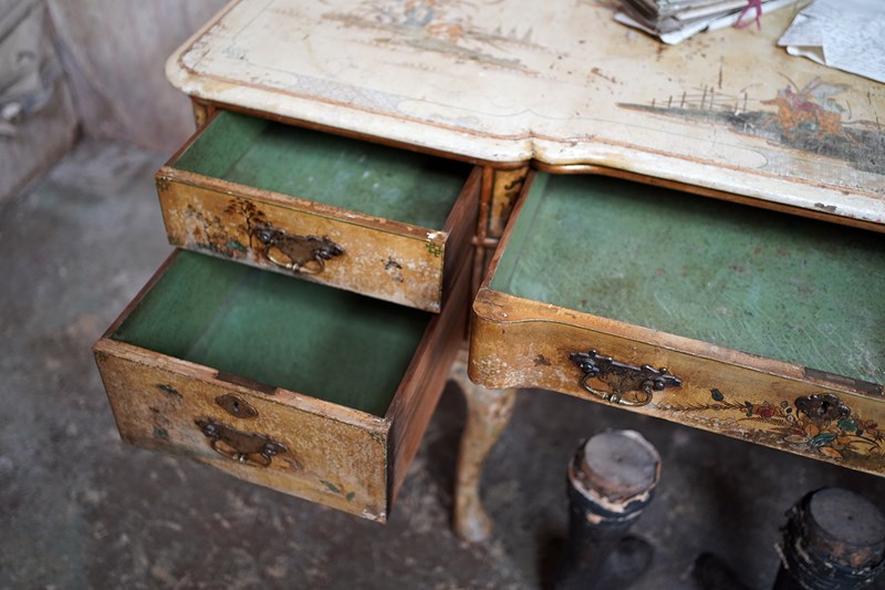 Overall, this is a highly characterful and visually arresting writing desk, rich in surface, texture, and narrative. Its timeworn chinoiserie decoration, elegant proportions, and honest wear make it an ideal piece for a country house interior or layered, collected setting, where patina and storytelling are prized above perfection.