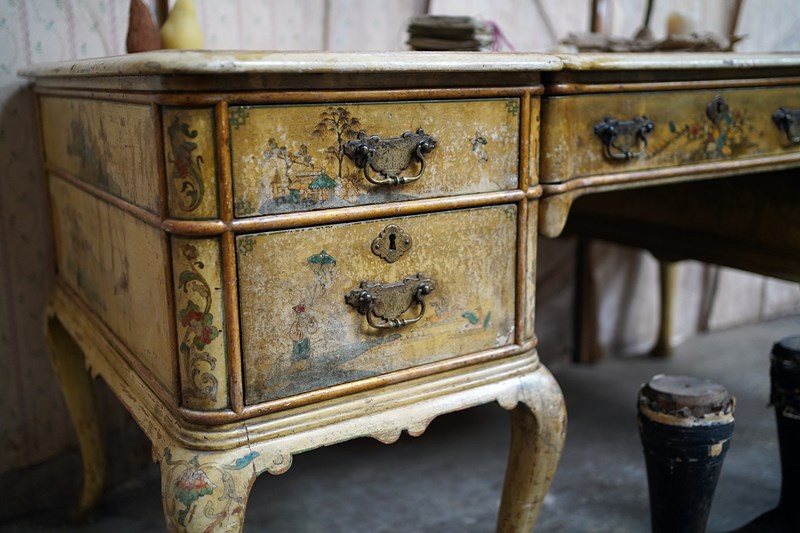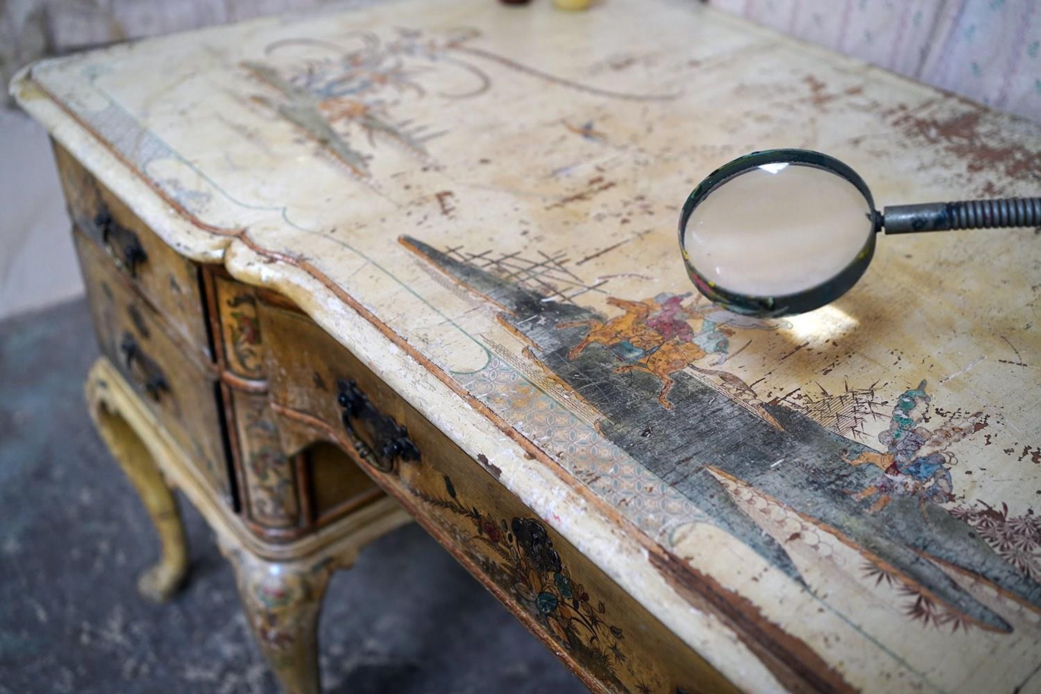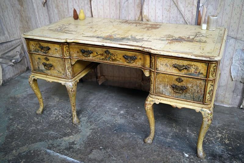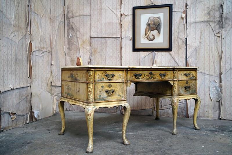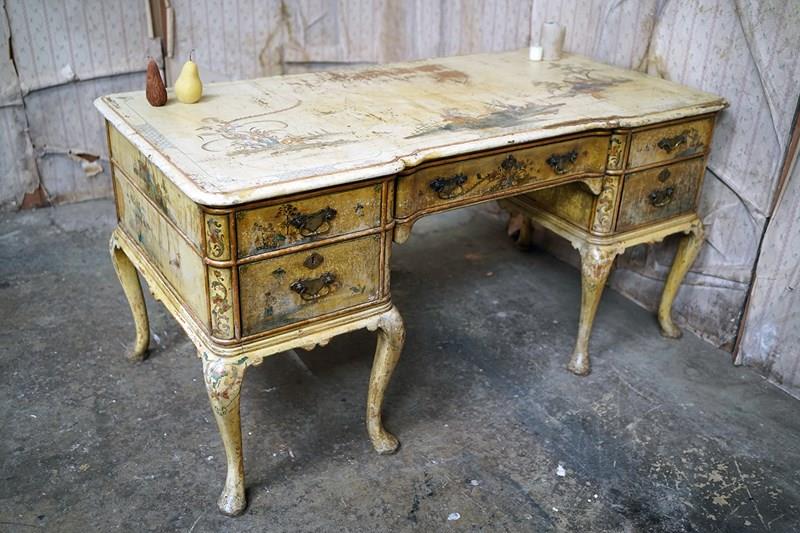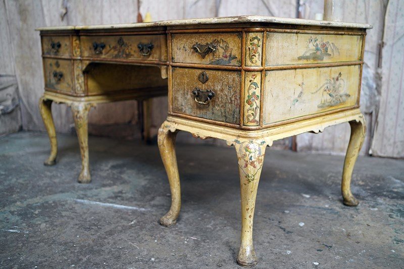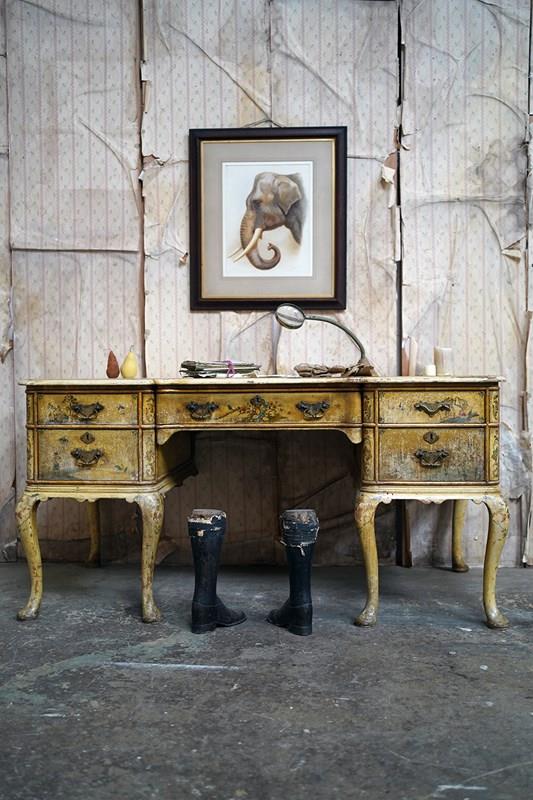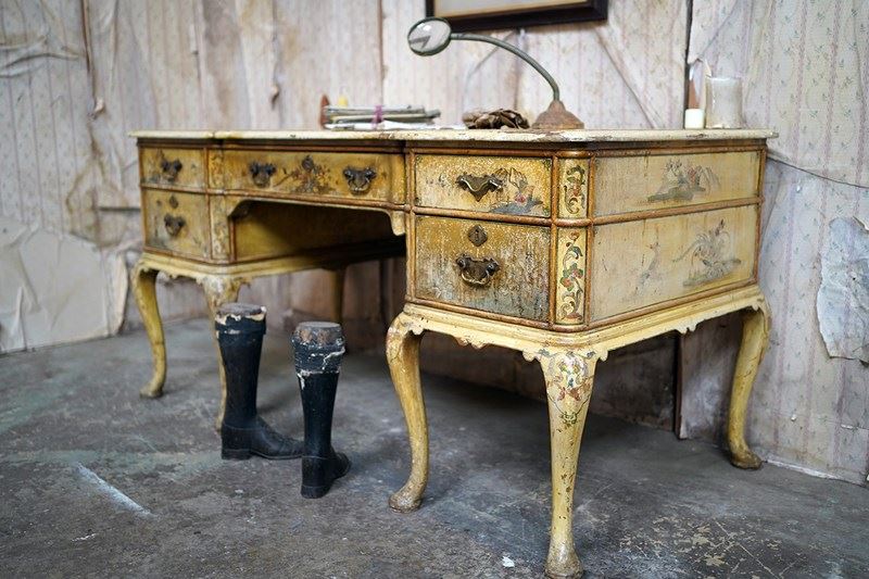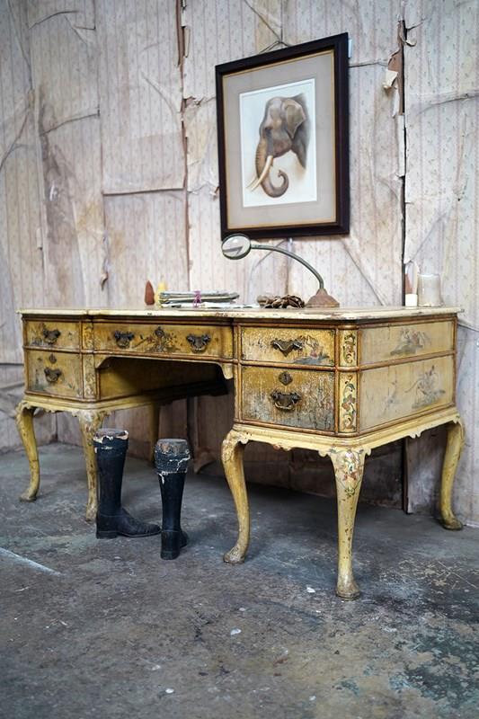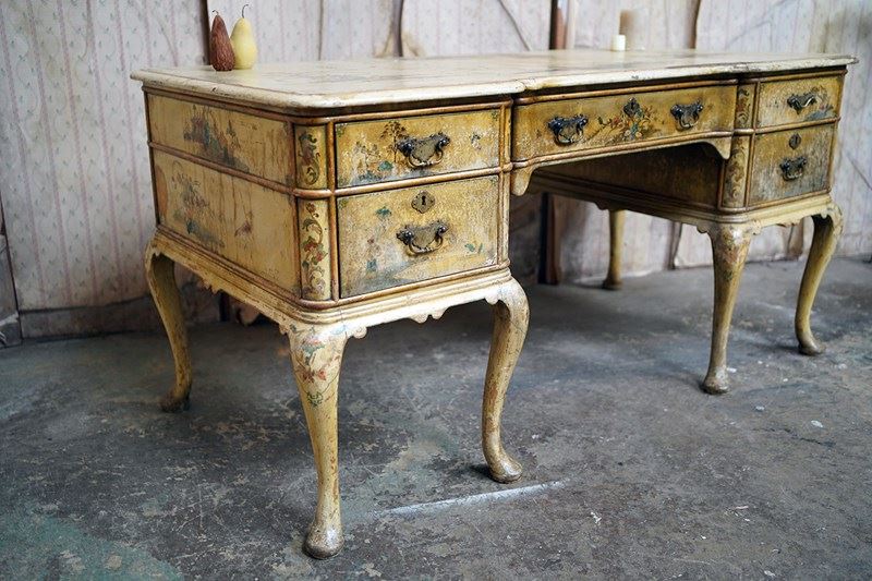 Overall, this is a highly characterful and visually arresting writing desk, rich in surface, texture, and narrative. Its timeworn chinoiserie decoration, elegant proportions, and honest wear make it an ideal piece for a country house interior or layered, collected setting, where patina and storytelling are prized above perfection.