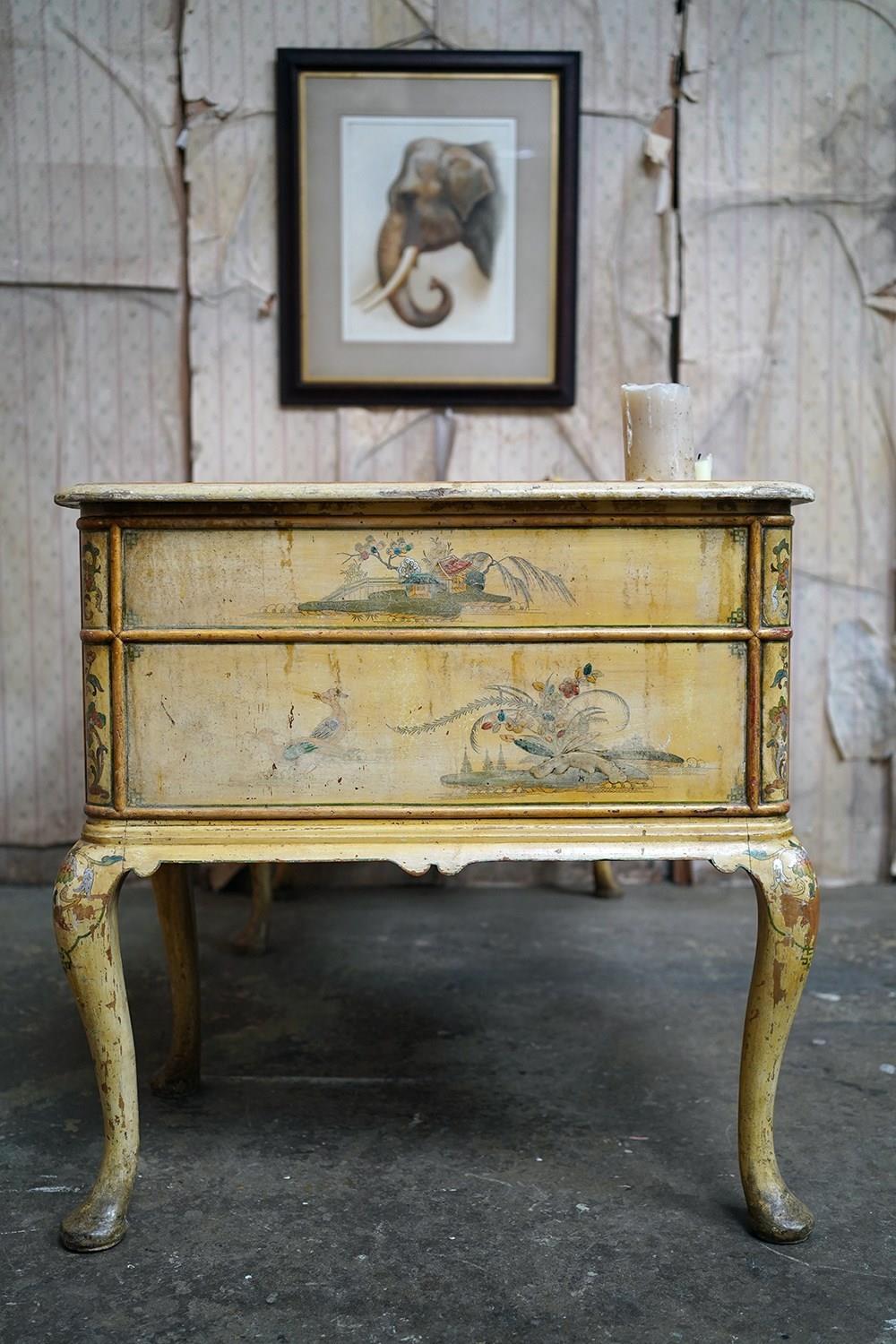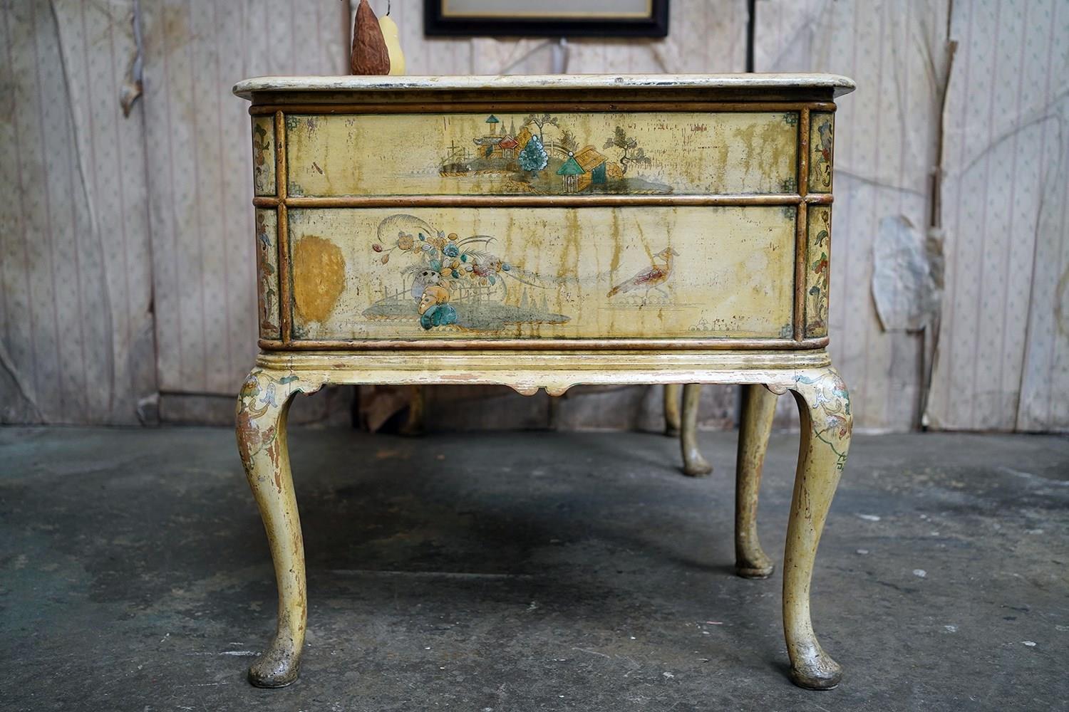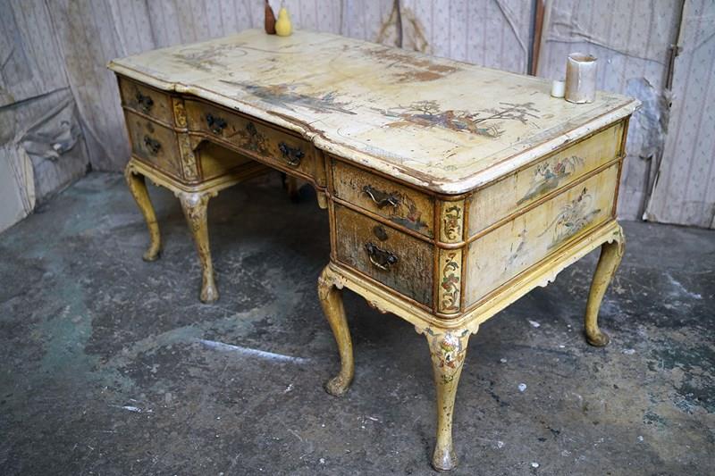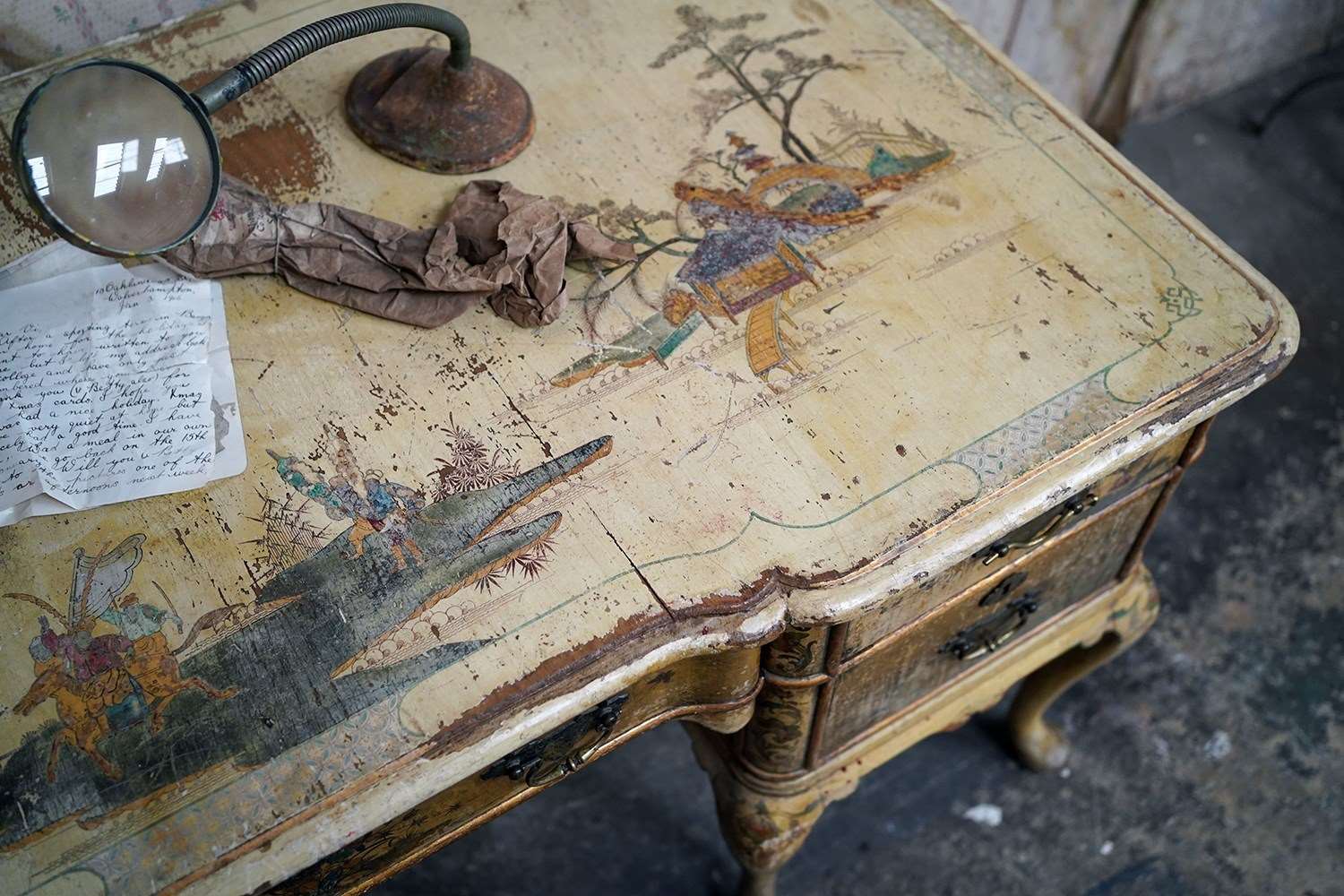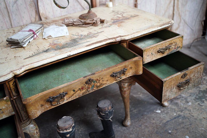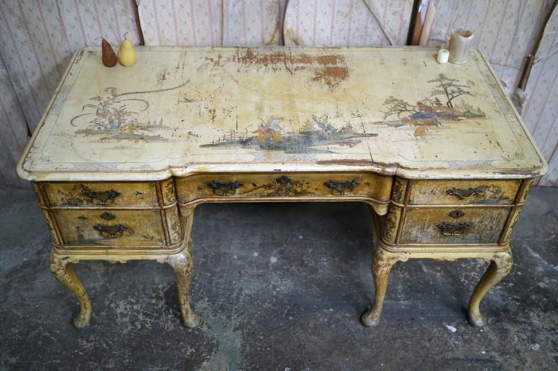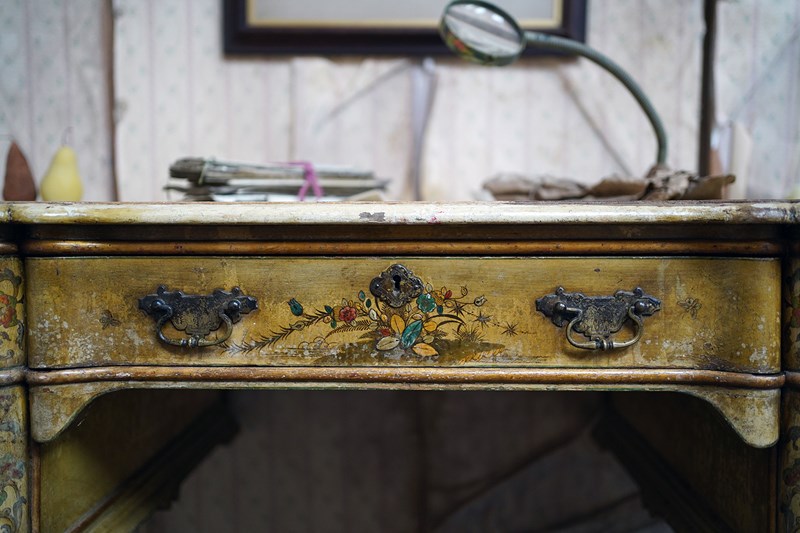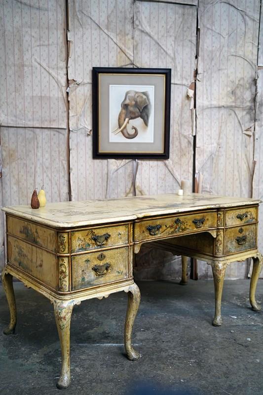 Overall, this is a highly characterful and visually arresting writing desk, rich in surface, texture, and narrative. Its timeworn chinoiserie decoration, elegant proportions, and honest wear make it an ideal piece for a country house interior or layered, collected setting, where patina and storytelling are prized above perfection.