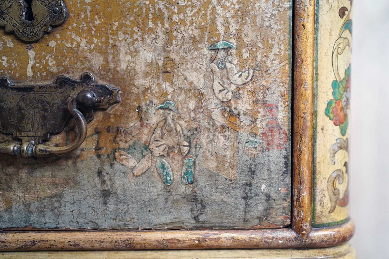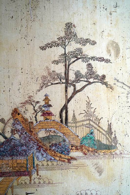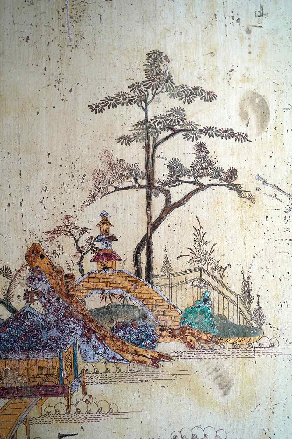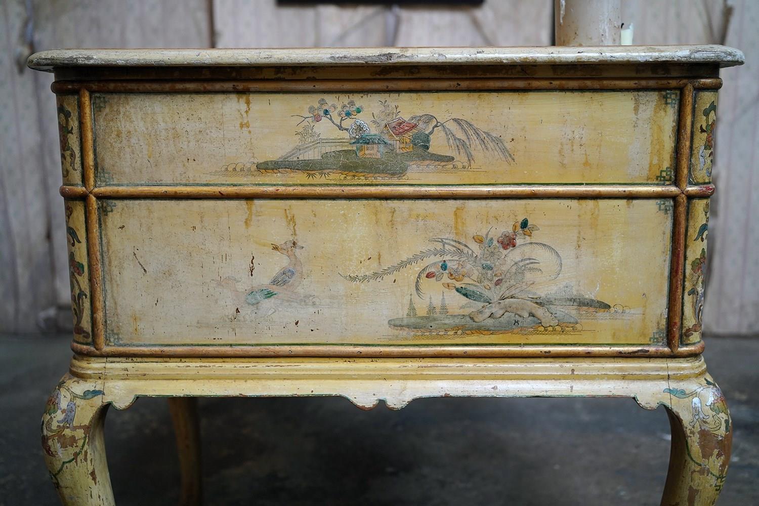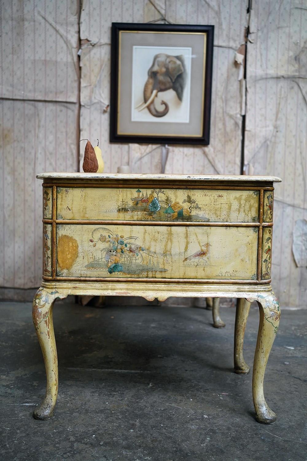Overall, this is a highly characterful and visually arresting writing desk, rich in surface, texture, and narrative. Its timeworn chinoiserie decoration, elegant proportions, and honest wear make it an ideal piece for a country house interior or layered, collected setting, where patina and storytelling are prized above perfection.