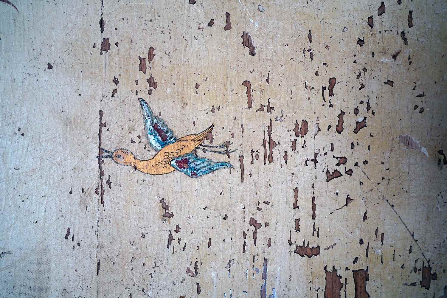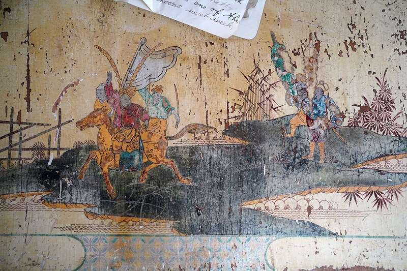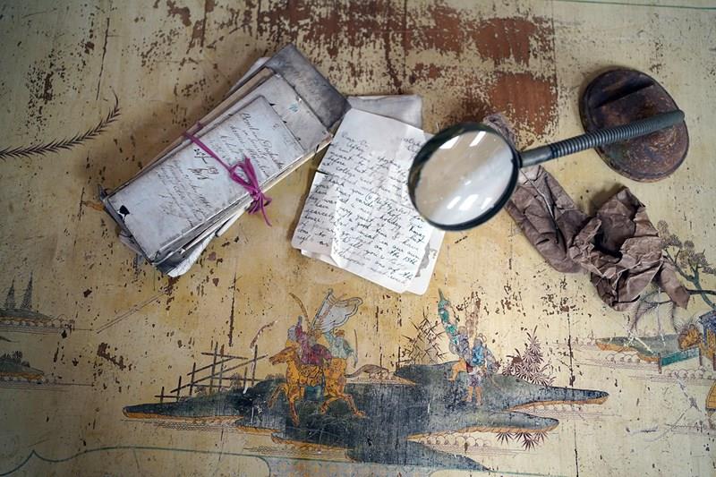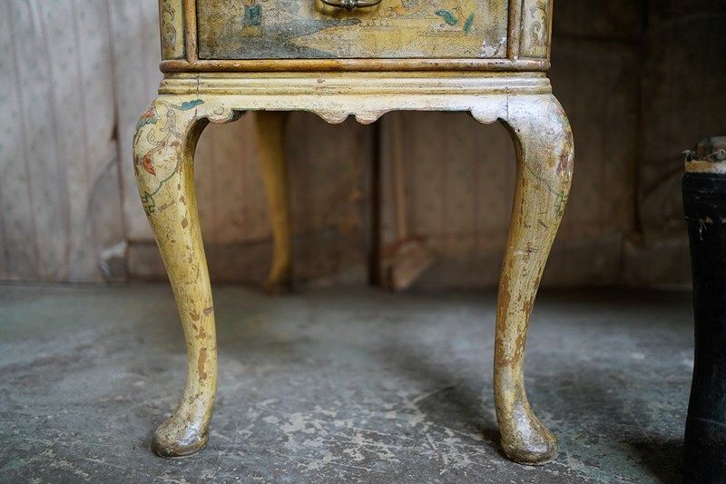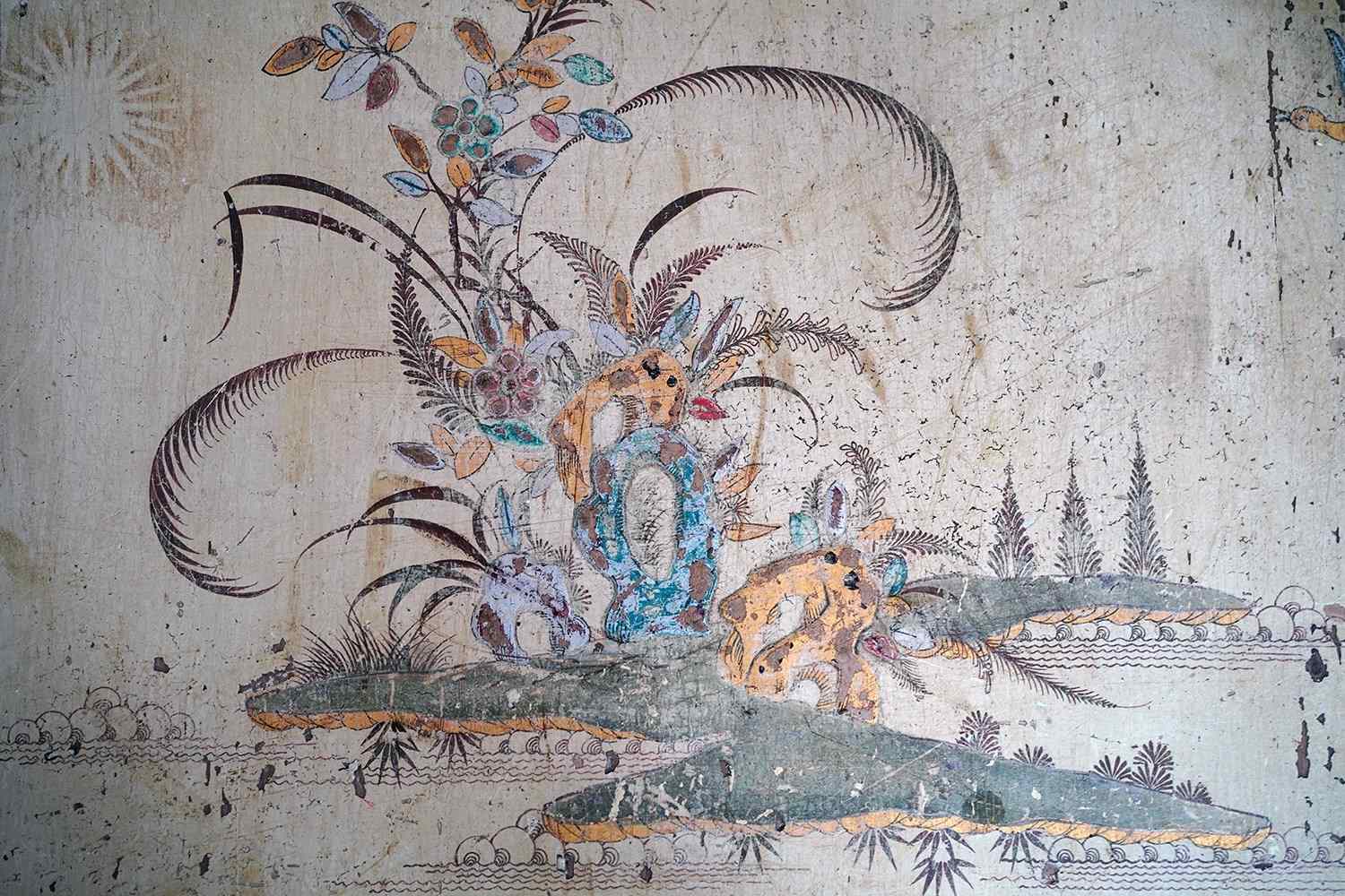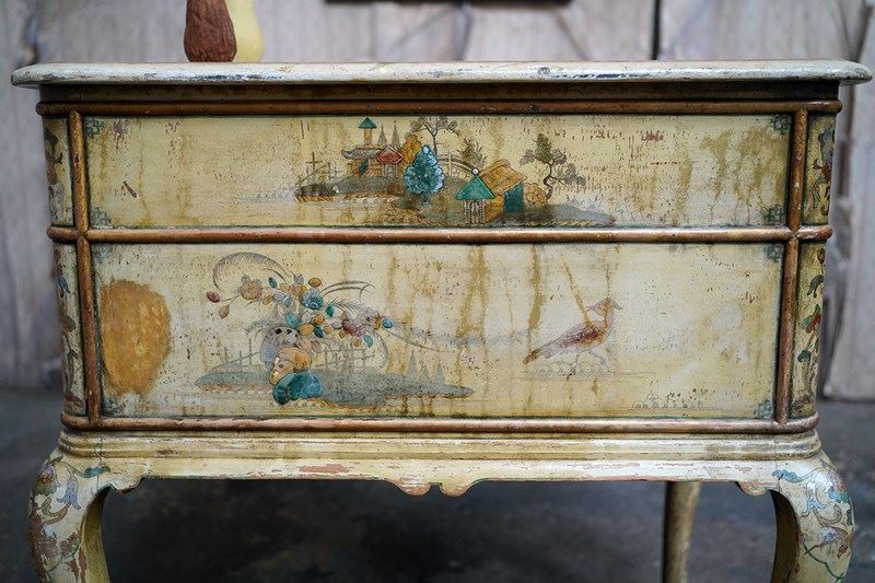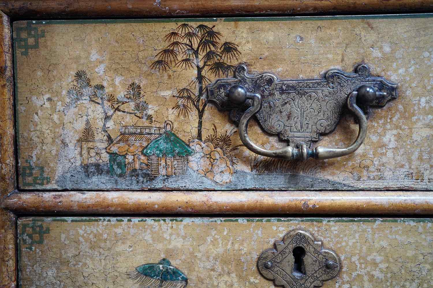 Overall, this is a highly characterful and visually arresting writing desk, rich in surface, texture, and narrative. Its timeworn chinoiserie decoration, elegant proportions, and honest wear make it an ideal piece for a country house interior or layered, collected setting, where patina and storytelling are prized above perfection.