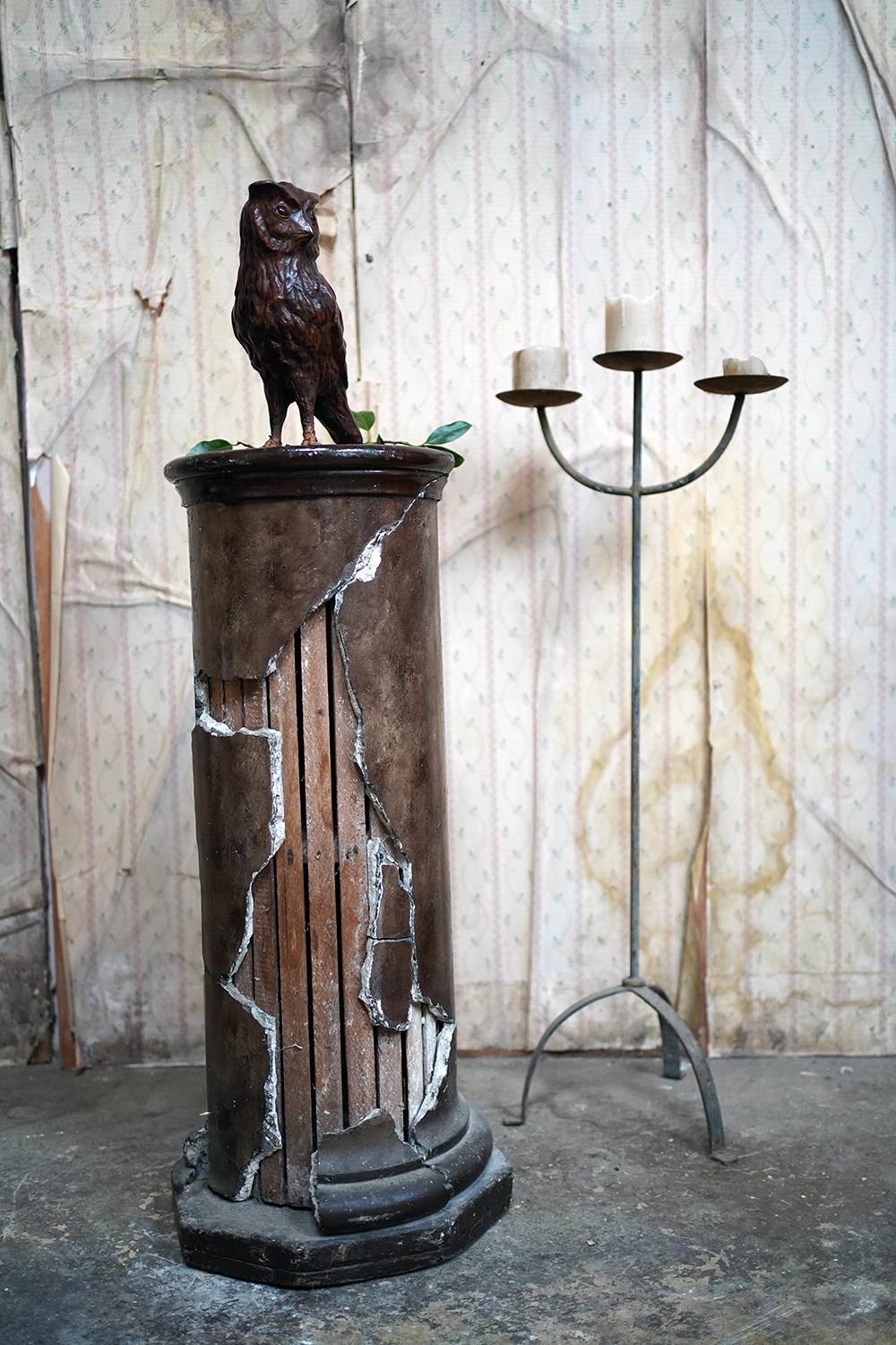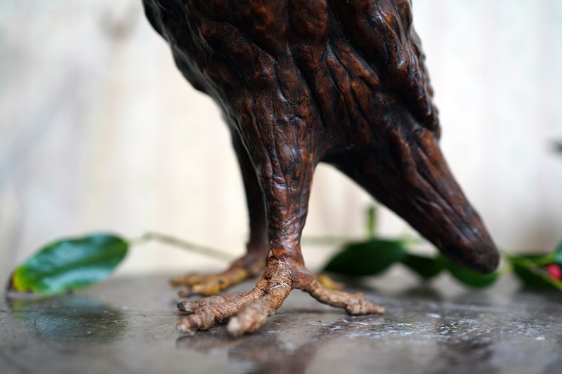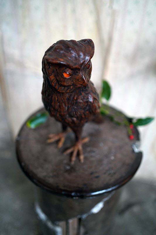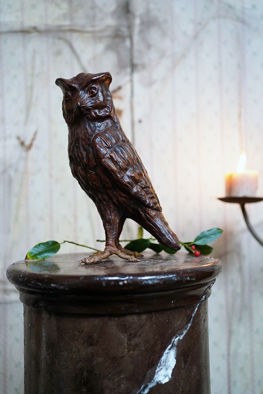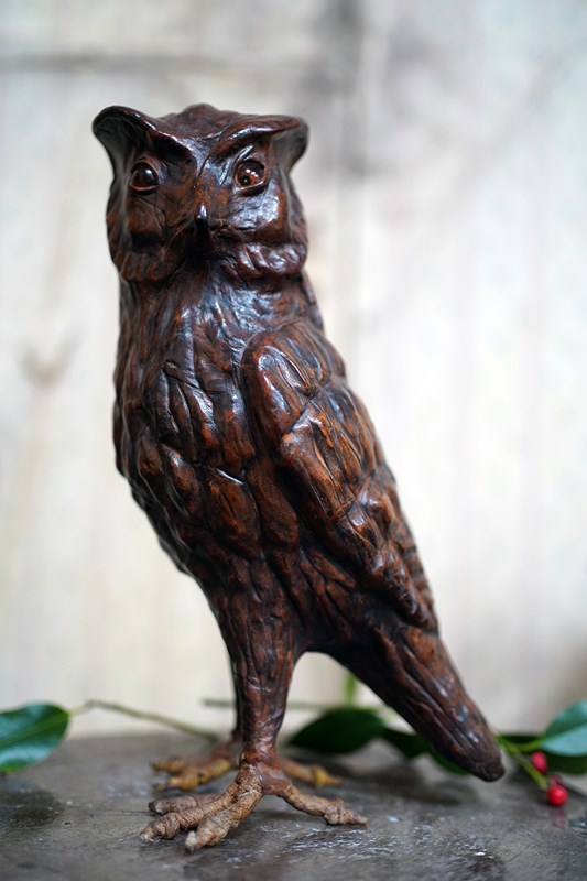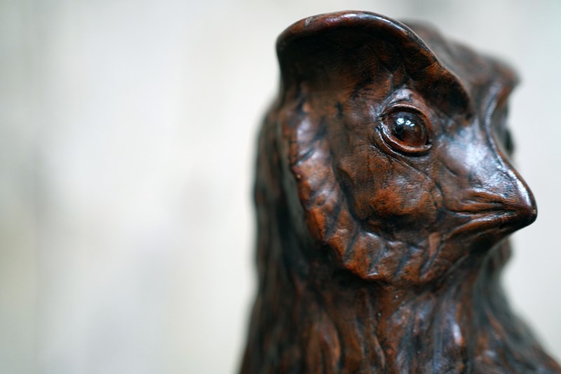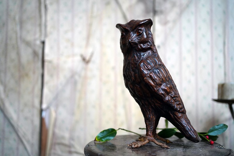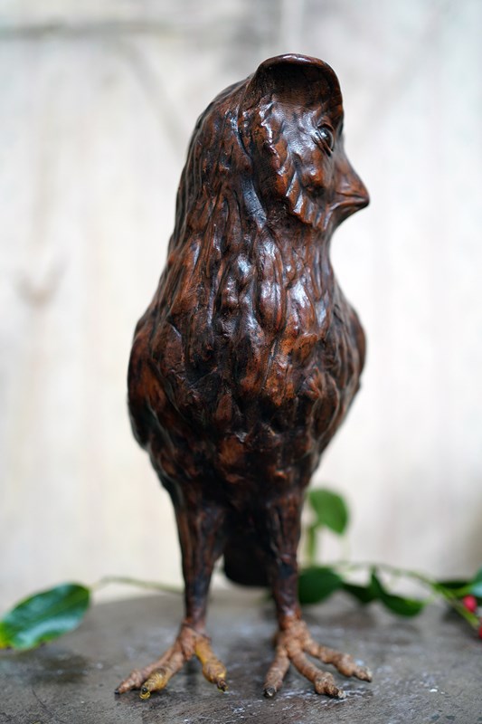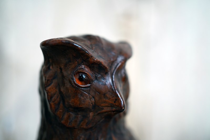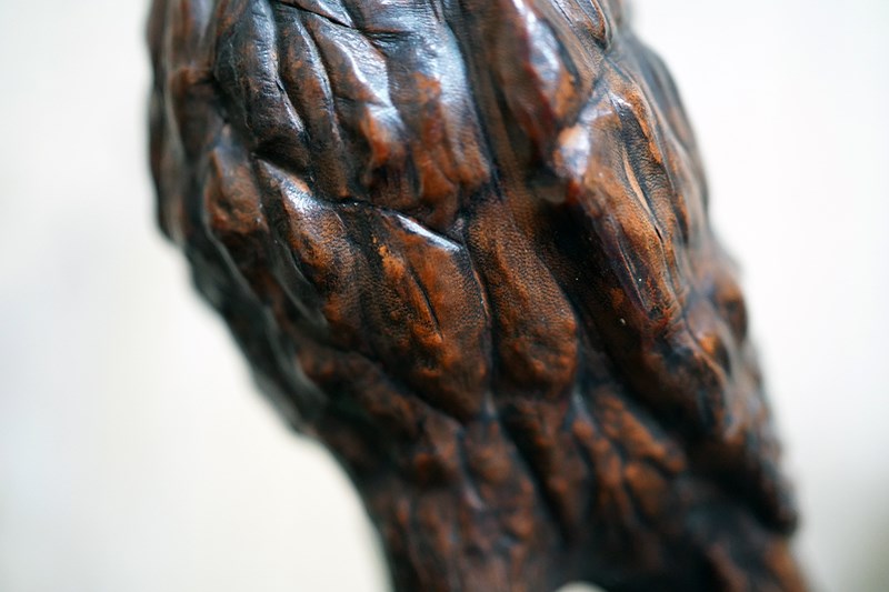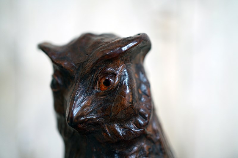 Leather animal figures of this type are most closely associated with the Arts & Crafts and Art Nouveau periods and are often linked to the decorative output of Liberty & Co. of London in the late nineteenth and early twentieth centuries. Liberty retailed a range of exotic and whimsical objects made from unconventional materials, including repoussé metal, carved wood, and leather, with Omersa creating their first leather pig in 1927, and frequently drew inspiration from nature and folklore. Owls, symbols of wisdom and nocturnal mystery, were particularly favoured motifs during this period with the likes of William Morris et al. Whilst appearing to be unsigned, the quality of modelling, choice of material, and sculptural confidence place this example firmly within that tradition.