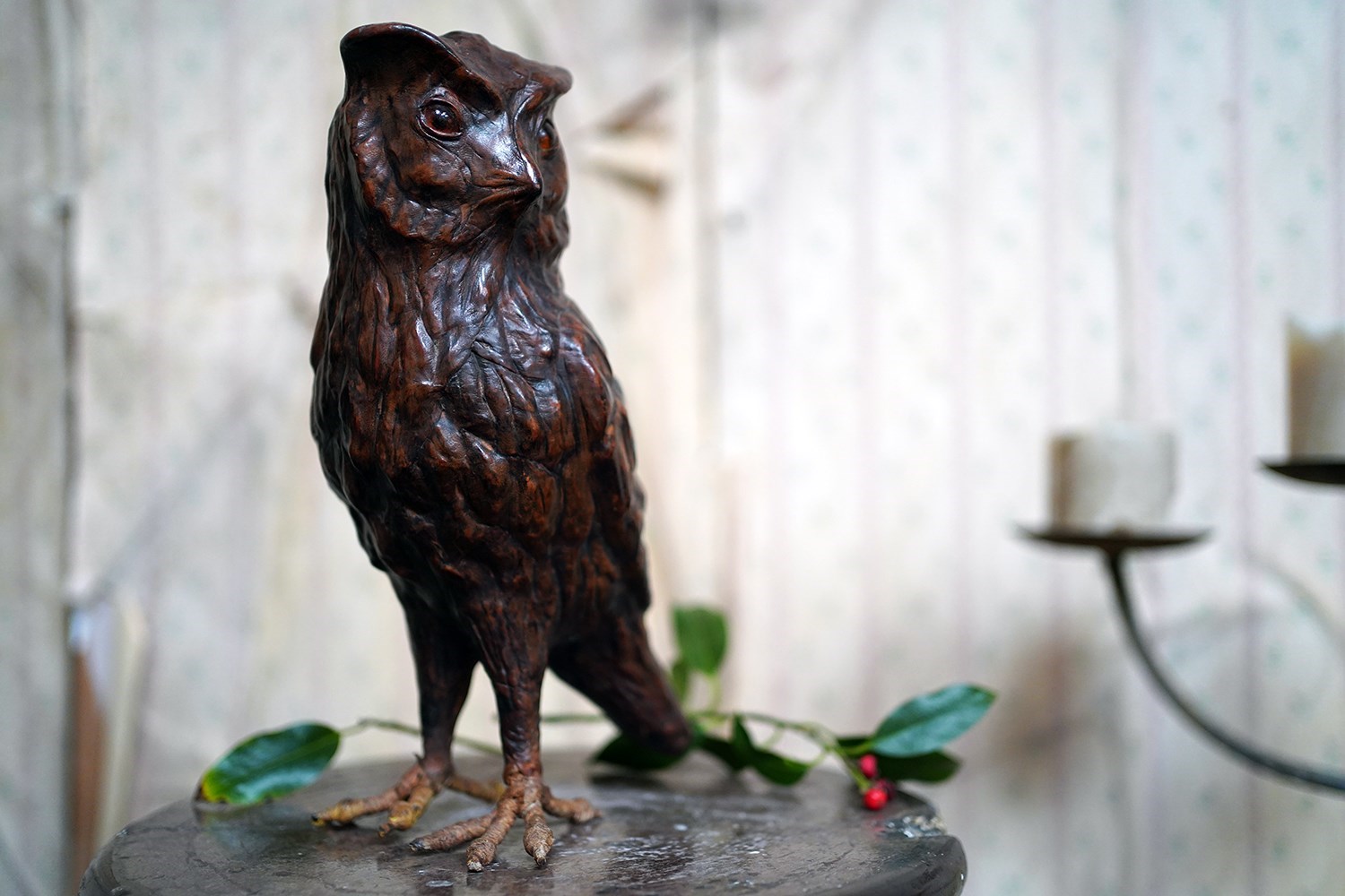 The striking and sculptural leather model of a horned owl, standing upright with head turned slightly to one side, the body worked entirely in richly patinated leather and carefully tooled to suggest layered plumage, the facial features strongly characterised, with a pronounced beak and inset amber-toned glass eyes lending a particularly arresting, almost sentient expression, the whole standing on finely modelled feet allowing the figure to stand freely and surviving from the second quarter of the twentieth century.