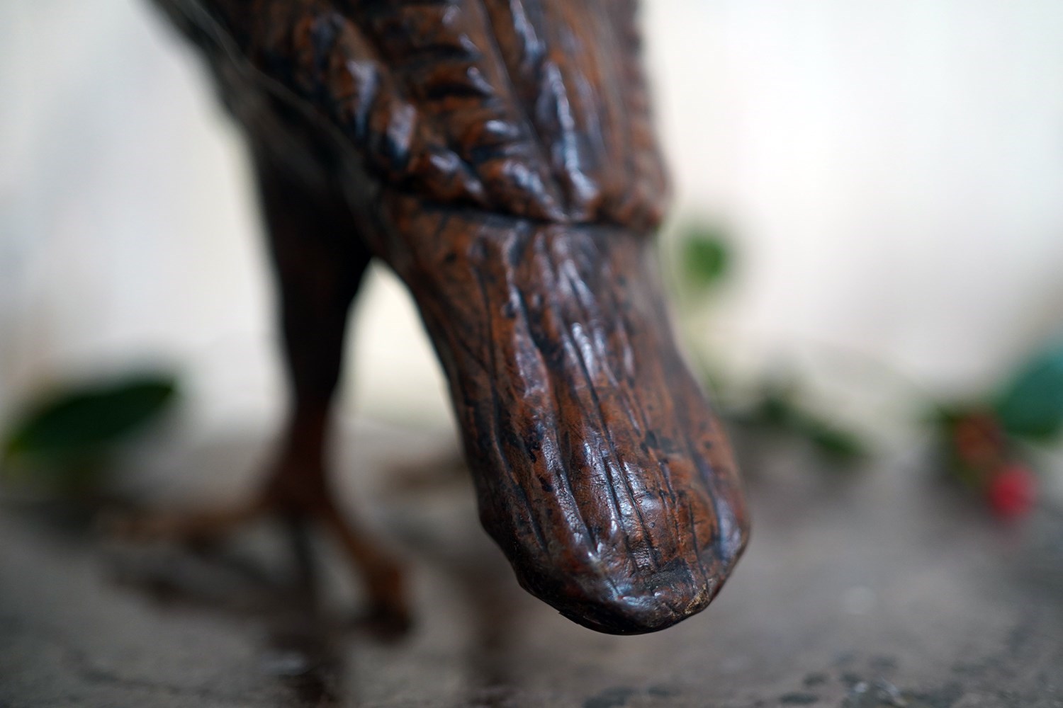 An unusual and characterful piece, combining folk-art charm with Arts & Crafts sensibility and rare in its survival, this piece would sit comfortably within a country-house interior, a curiosity cabinet, or alongside other Liberty-period decorative arts; a strong, sculptural object with undeniable presence.