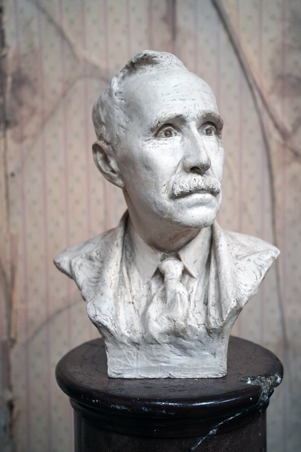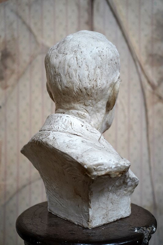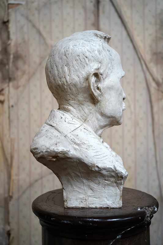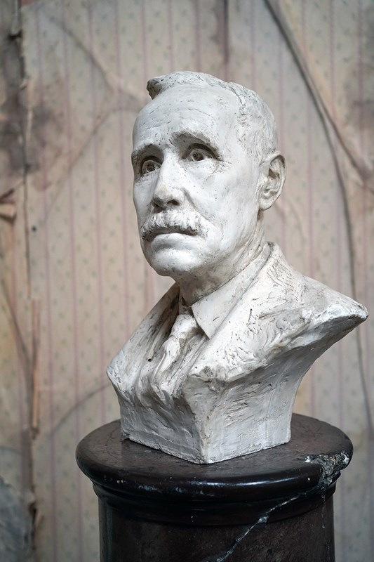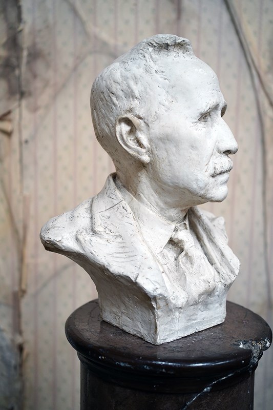 The finely modelled early 20th-century Scottish plaster portrait bust of the artist, designer and civic figure George Hope Tait (1865–1950), executed in 1929 by the noted Borders sculptor Thomas J. Clapperton (1879–1962) and cast with a quiet naturalism typical of Clapperton’s portrait work, the sitter shown turned slightly to his left with a sensitively observed expression, the surface retaining its original chalky studio finish and exhibiting the sculptor’s characteristic hand-worked texture across the coat and collar, stamped as such to the base and of museum quality.