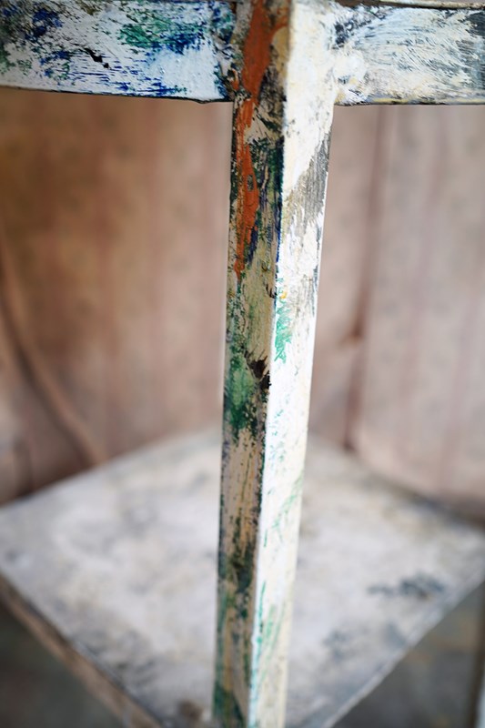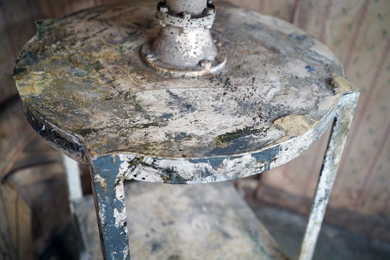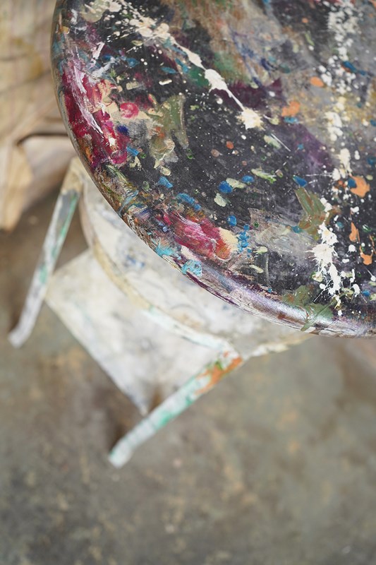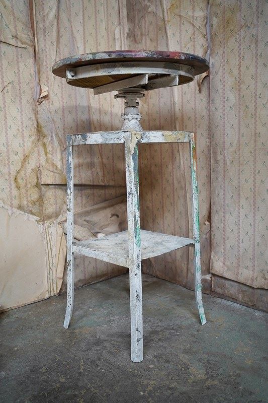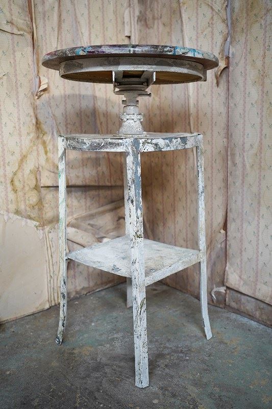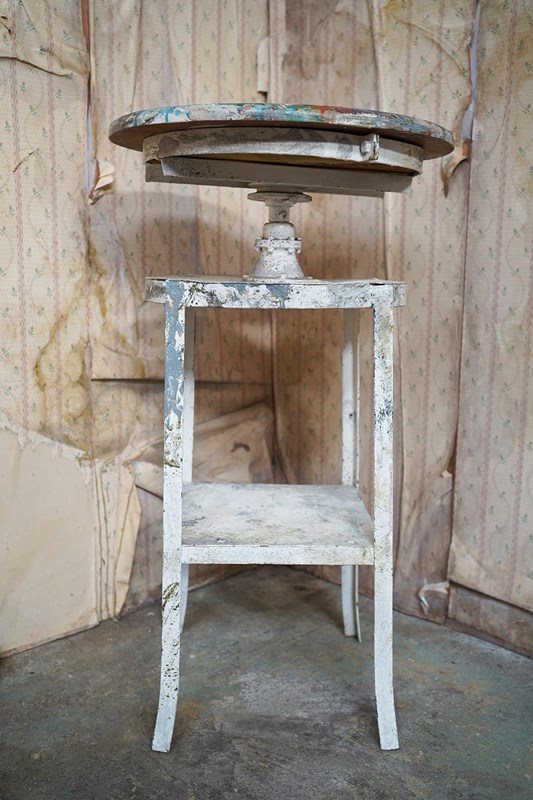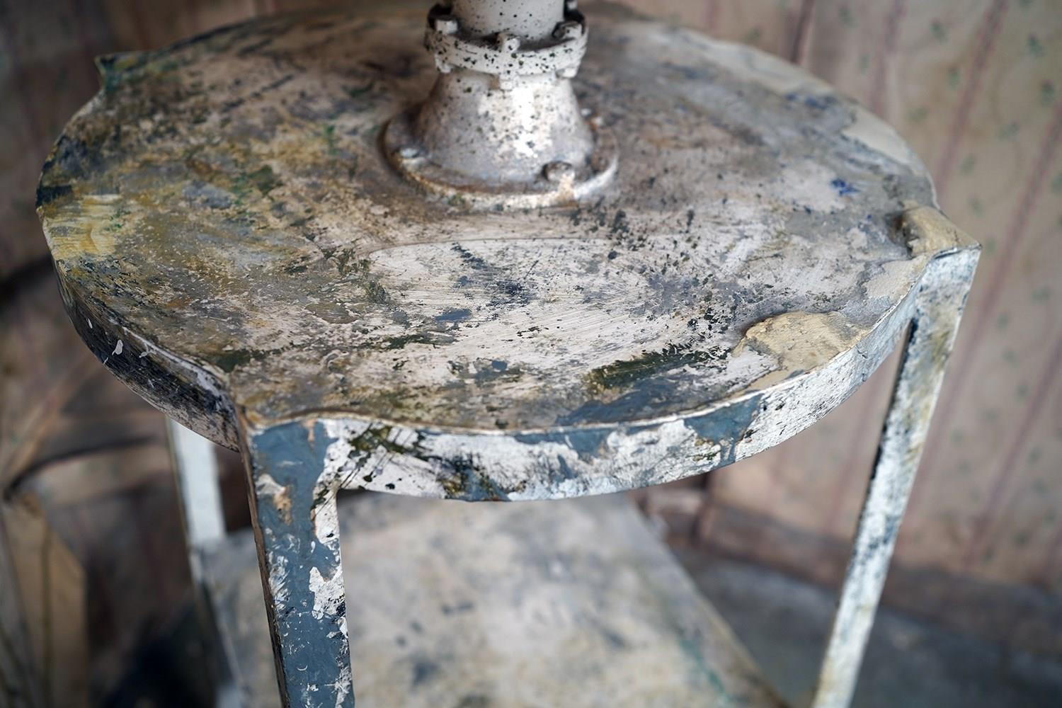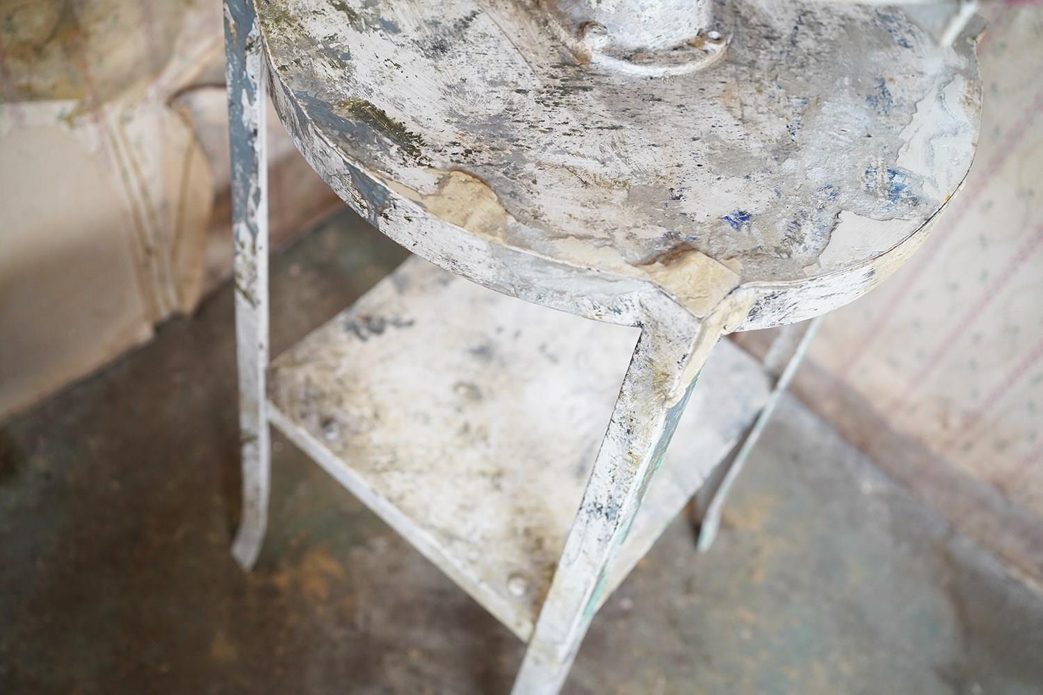 The wondrous art studio sculptors modelling easel or stand, constructed in steel with a white painted ground and having a tripod base to splayed legs and a lower shelf for storage, to a revolving pine top, showing an abundance of colour and character as a myriad of paint flecks, being untouched from its heavy use by an artist throughout the early to middle section of the twentieth century.
