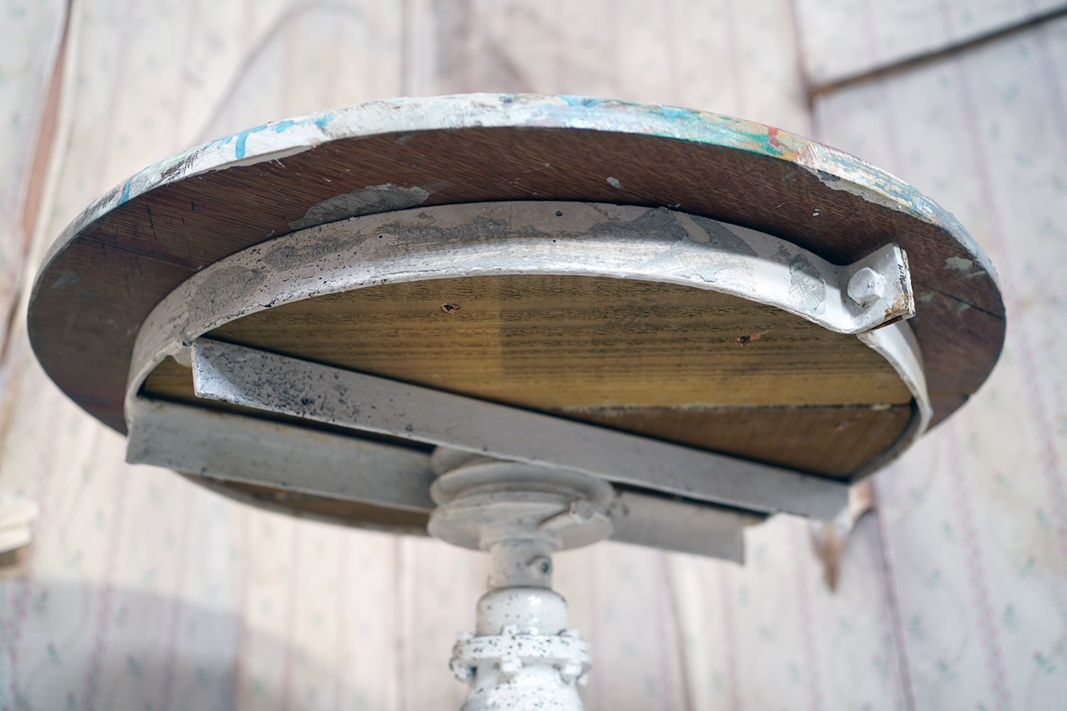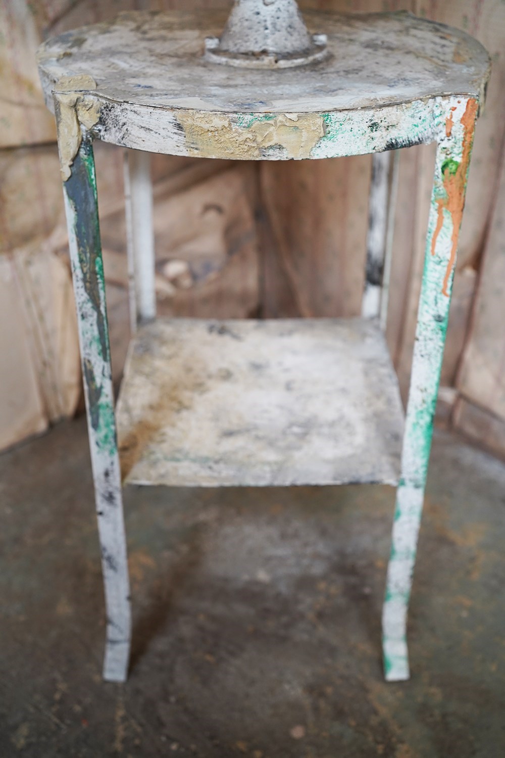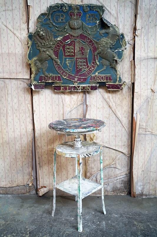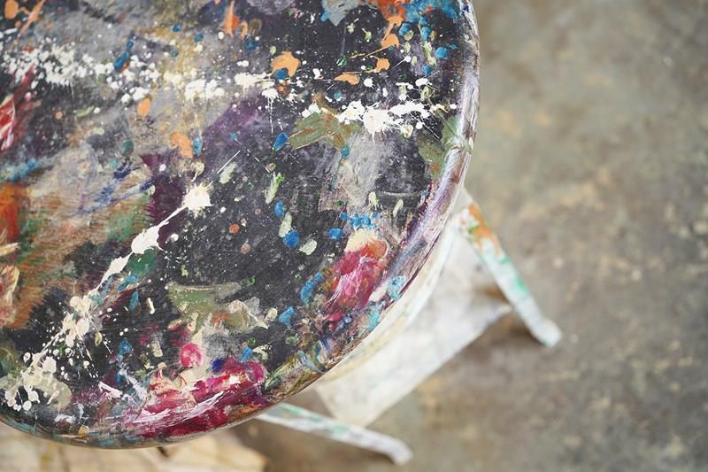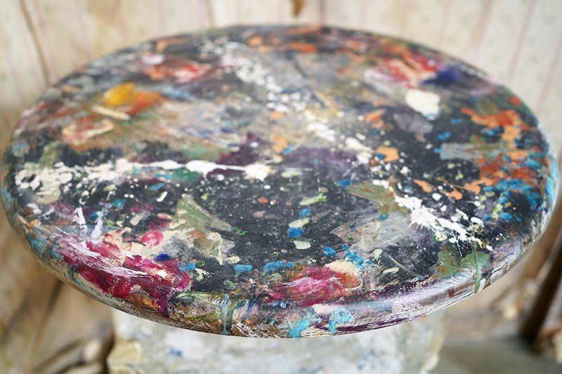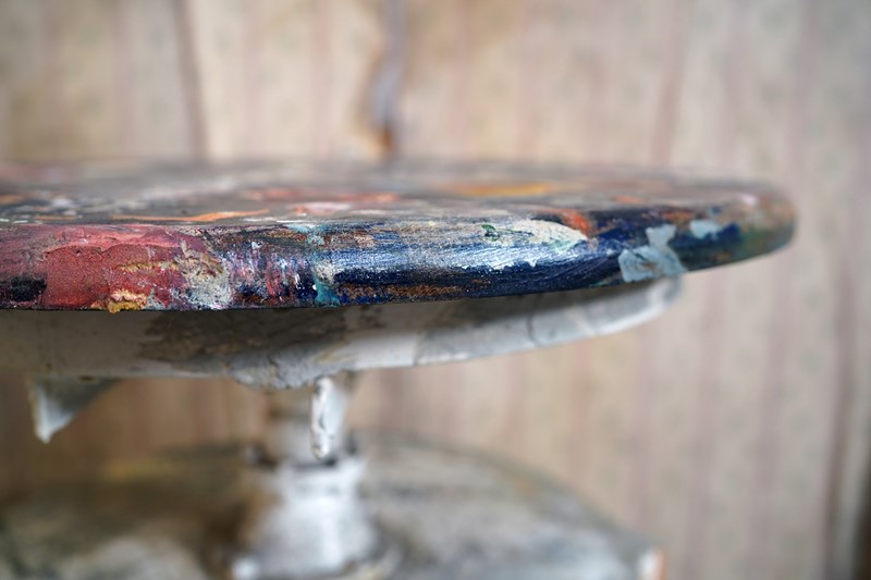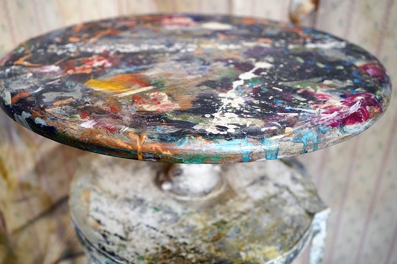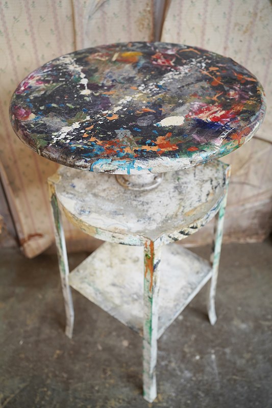 The wondrous art studio sculptors modelling easel or stand, constructed in steel with a white painted ground and having a tripod base to splayed legs and a lower shelf for storage, to a revolving pine top, showing an abundance of colour and character as a myriad of paint flecks, being untouched from its heavy use by an artist throughout the early to middle section of the twentieth century.