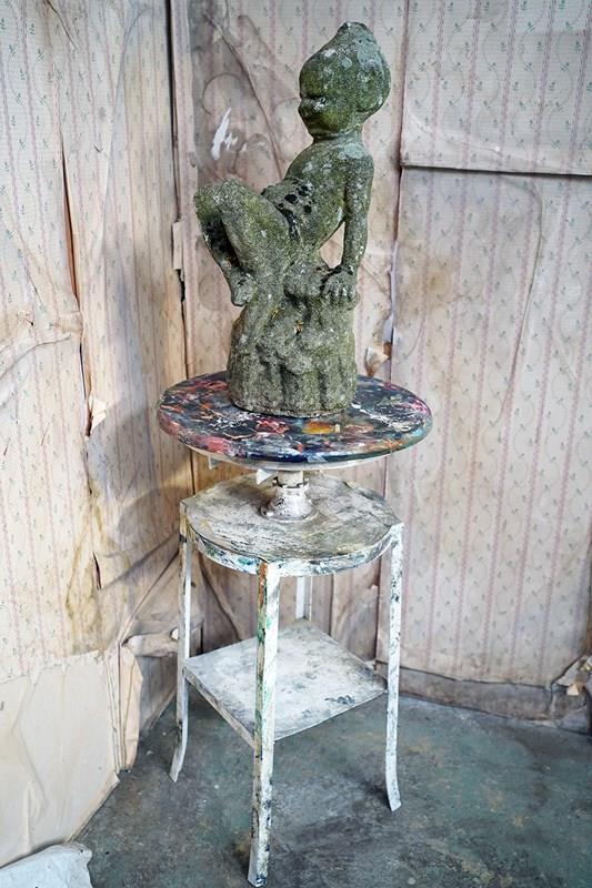 She remains in a good untouched and original state and has been simply waxed to protect her idiosyncrasies and fabulous patina. The stand is adjustable, allowing the artist to raise or lower the working surface to a comfortable height whilst the top of the stand is designed to rotate, which enables the sculptor to easily access all sides of their piece without having to move around it. It could now be used for displaying sculpture of which could be heavy in weight.