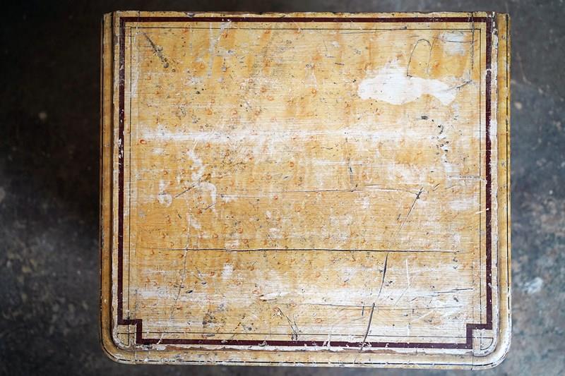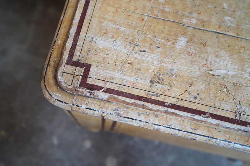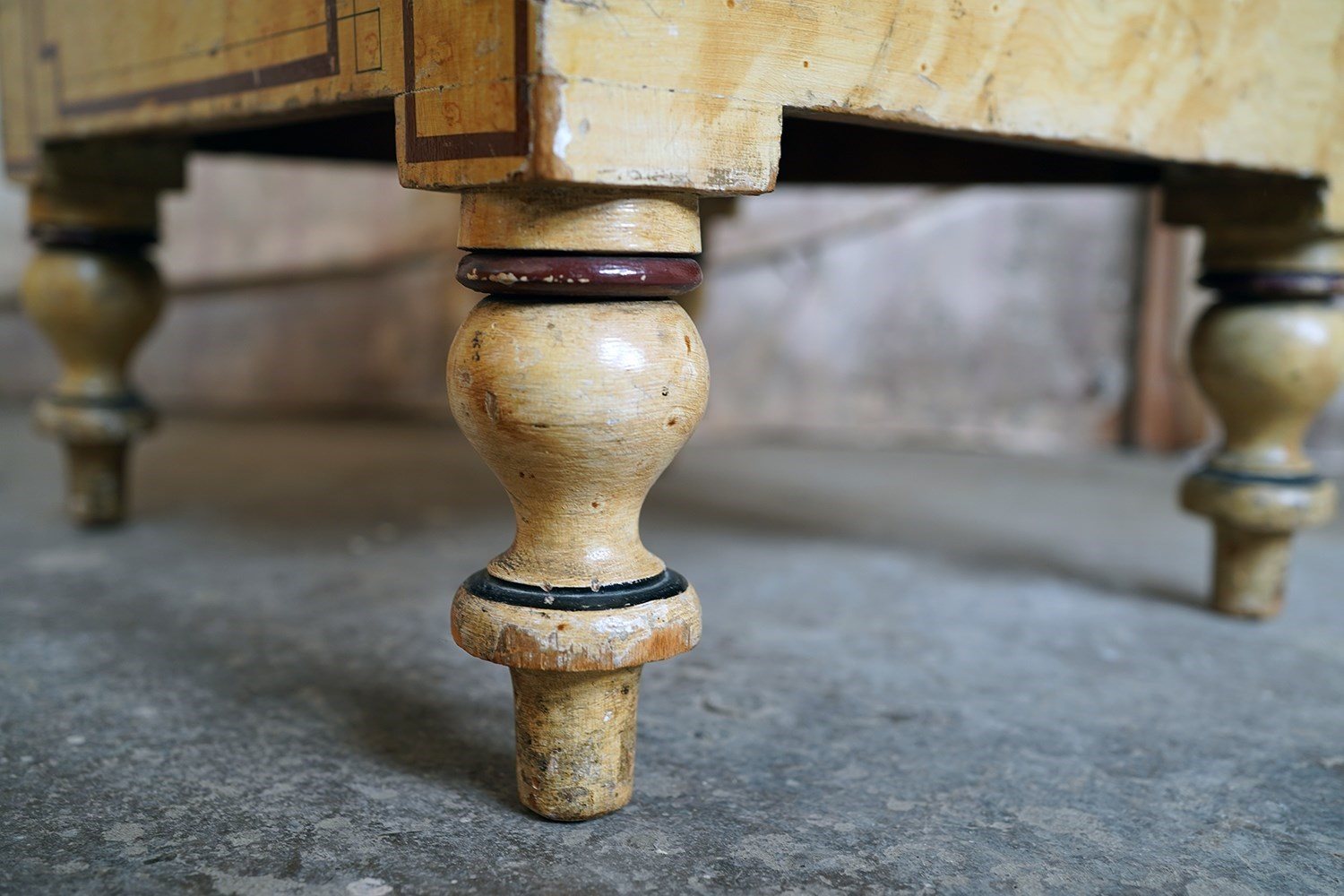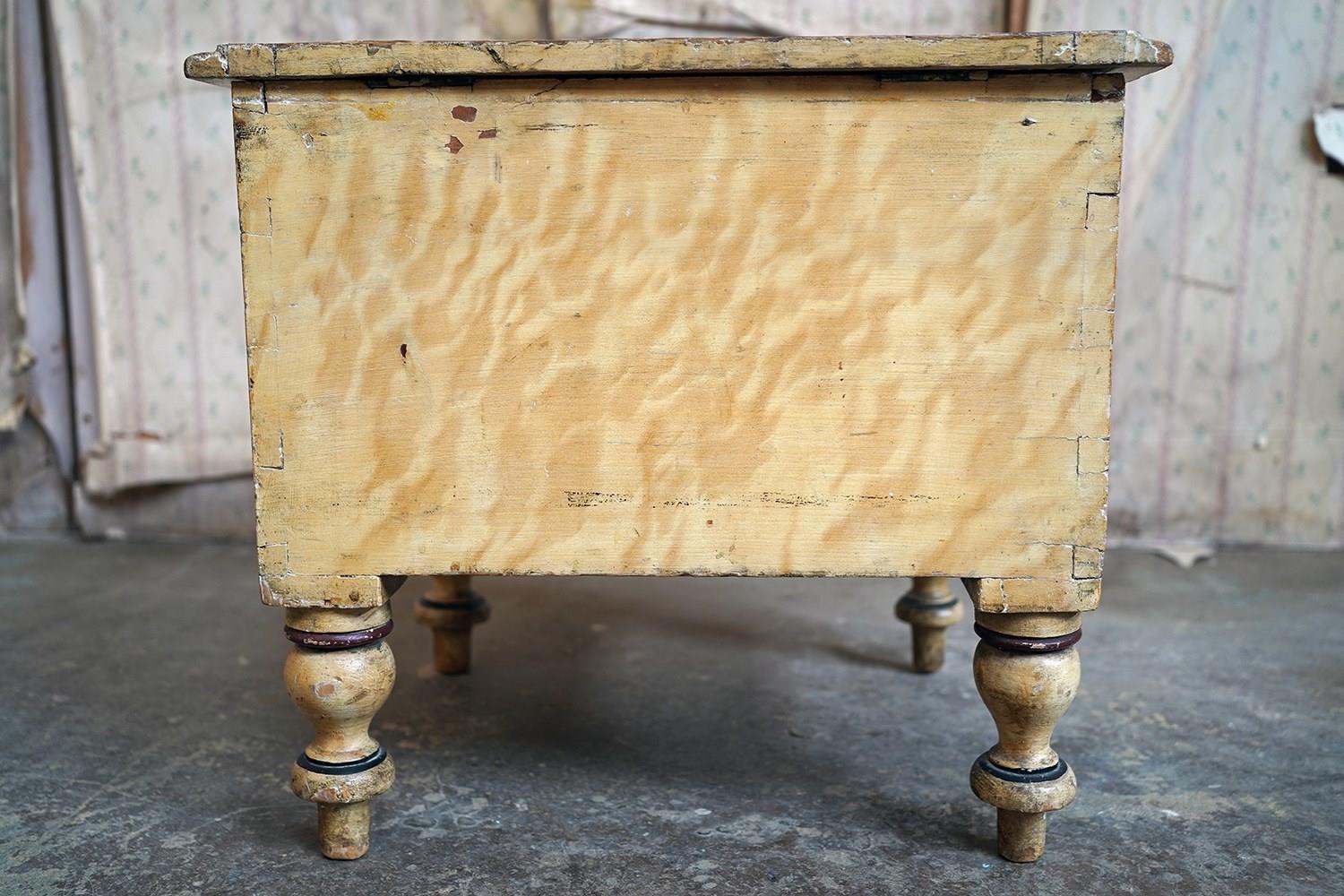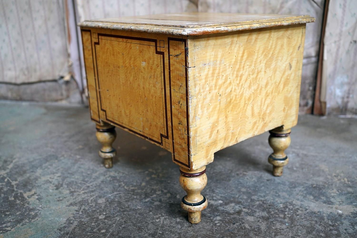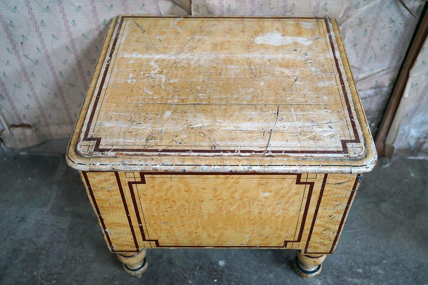 The very pretty early Victorian period sand yellow painted pine bedside commode or nightstand with line decoration in burgundy, the whole to simulate birds eye maple, the lidded top opening to reveal the vacant bowl space to well-turned and line decorated peg legs, the whole now for use as a bedside or lamp table, and surviving from the second quarter of nineteenth century England.