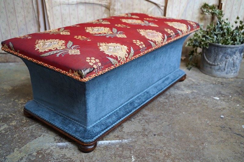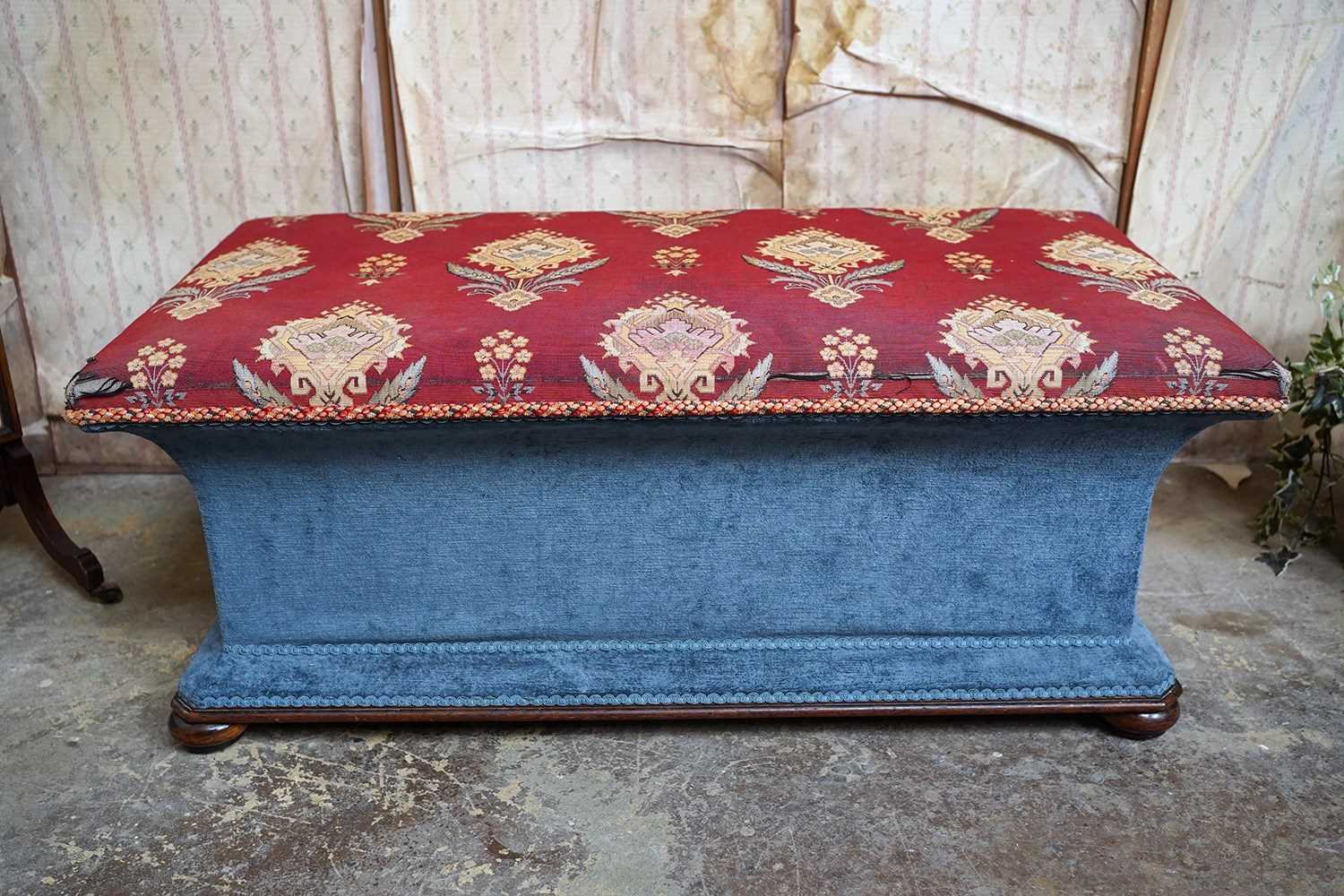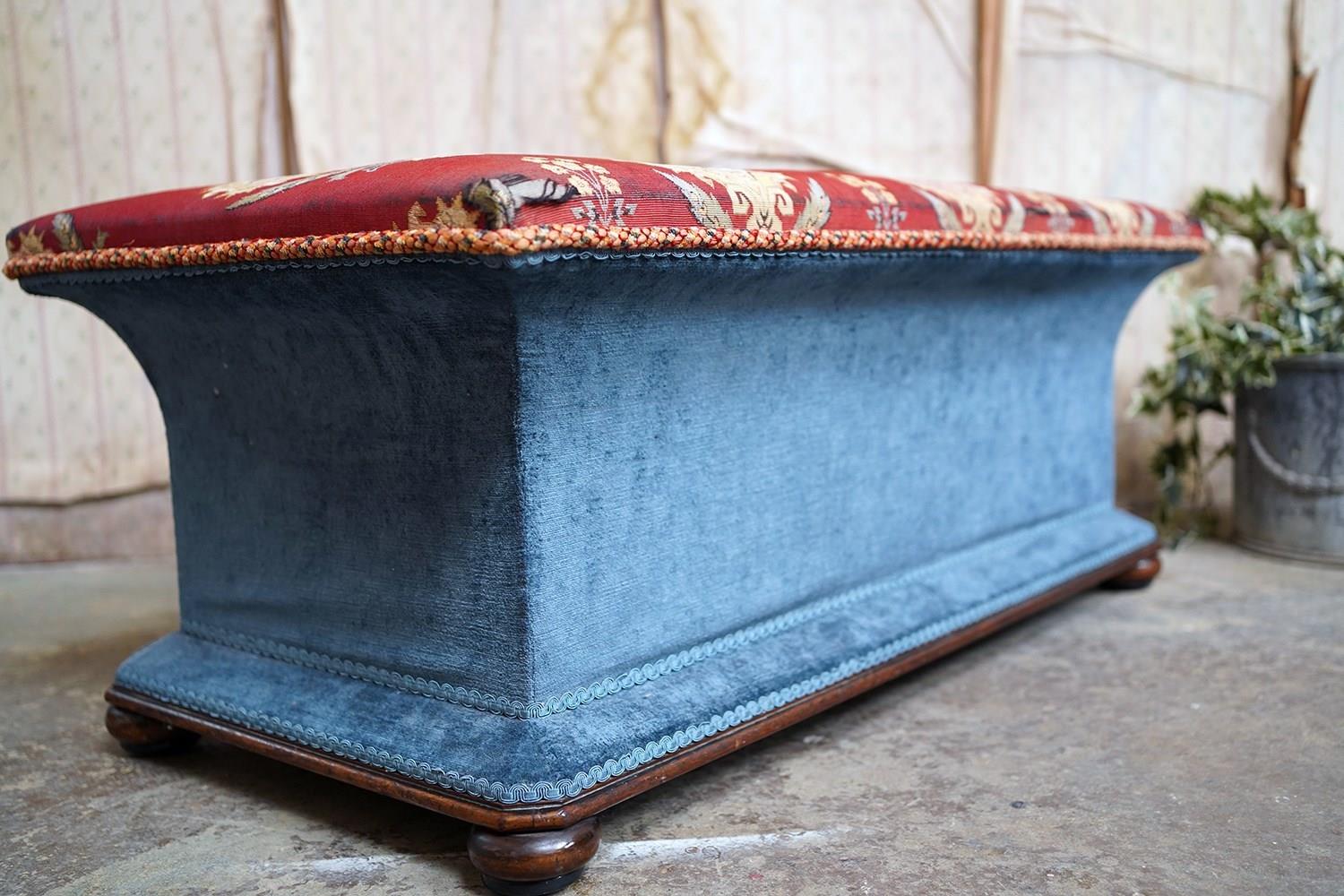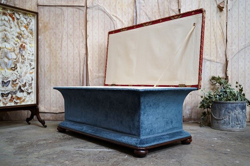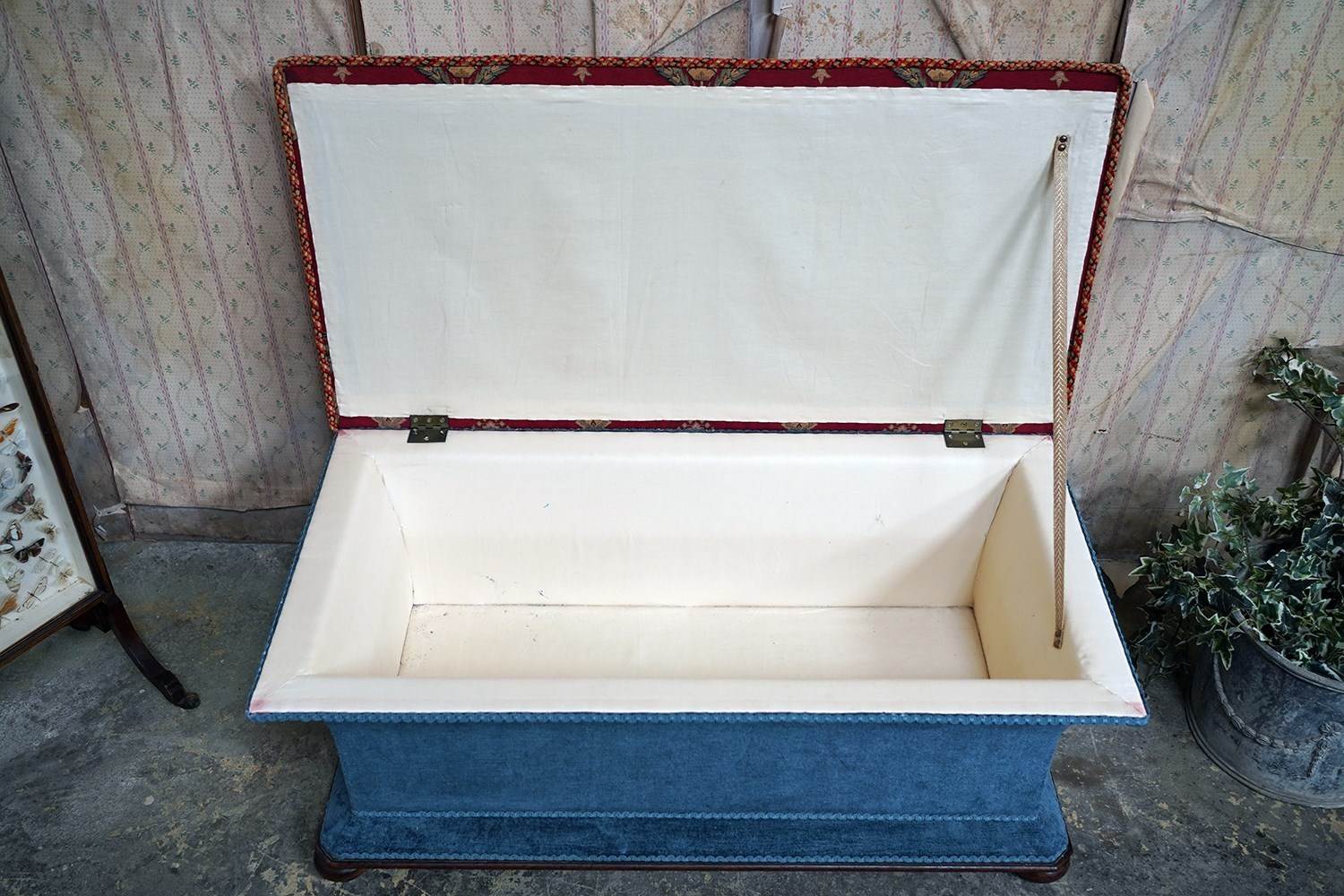 The large country house ottoman having a padded hinged lid covered with a fragment of Turkish ottoman brocade, the whole with concave sides in a plush teal blue to lower rail and flattened bun feet, the seat lid opening to reveal a vacant storage interior and a pale linen lined interior, and the whole surviving from early Victorian period England.
