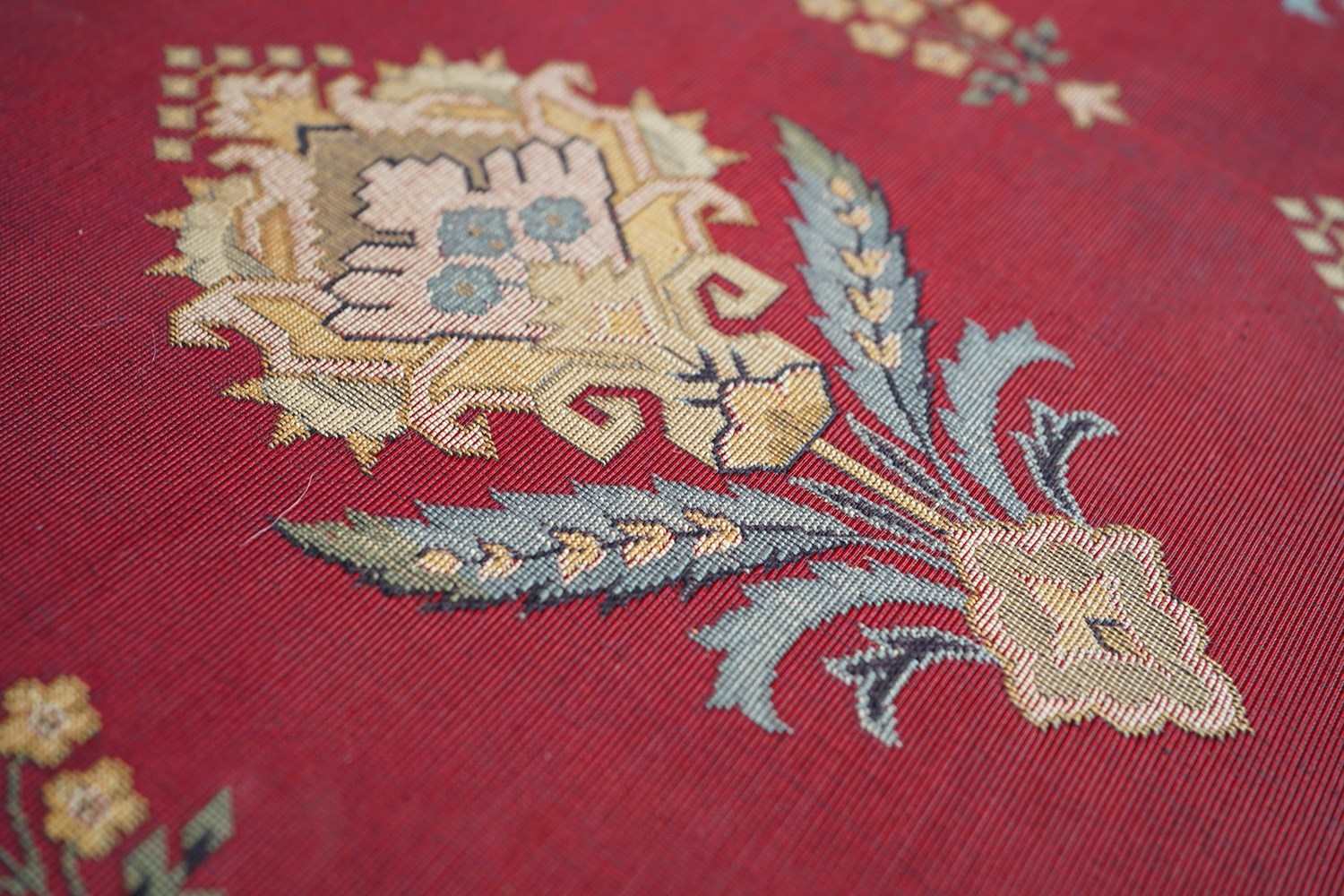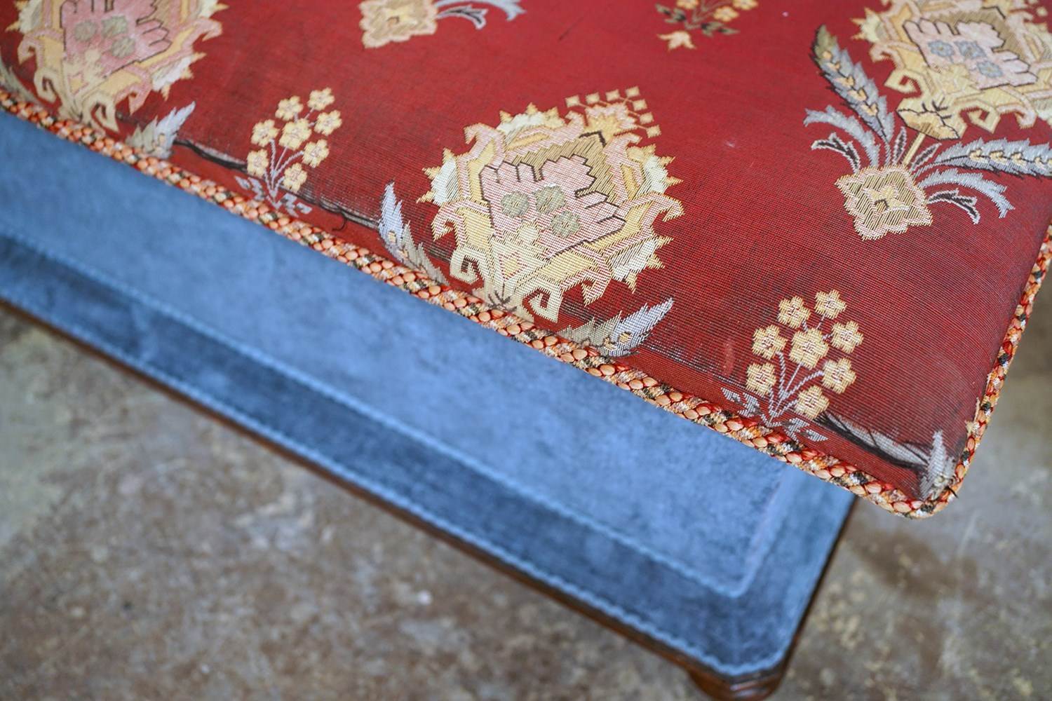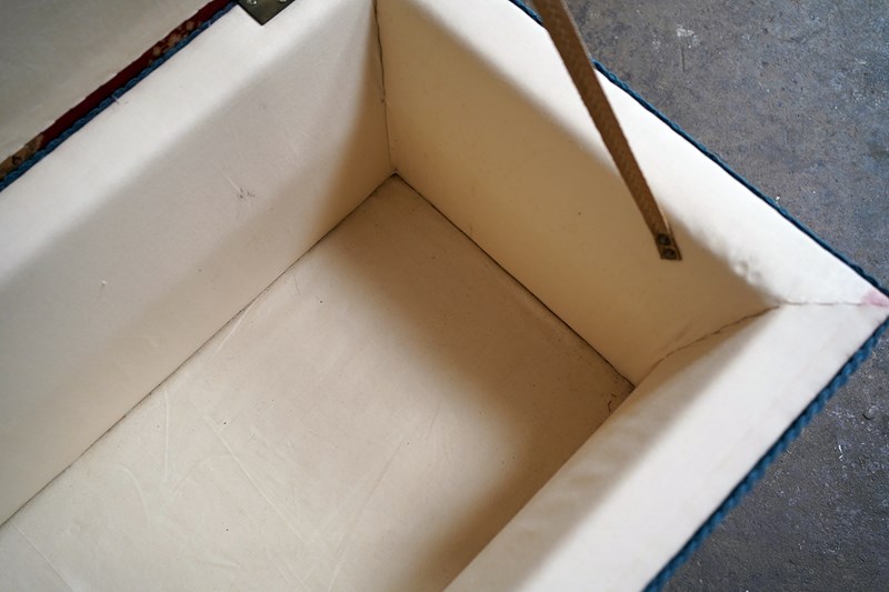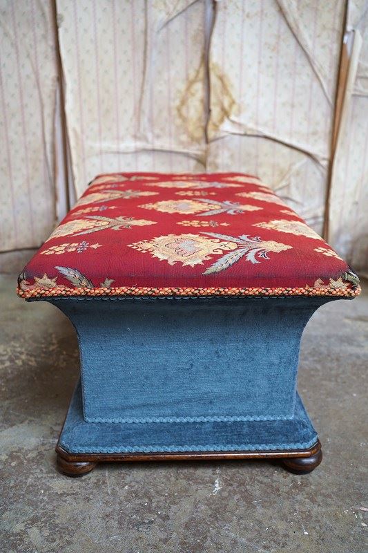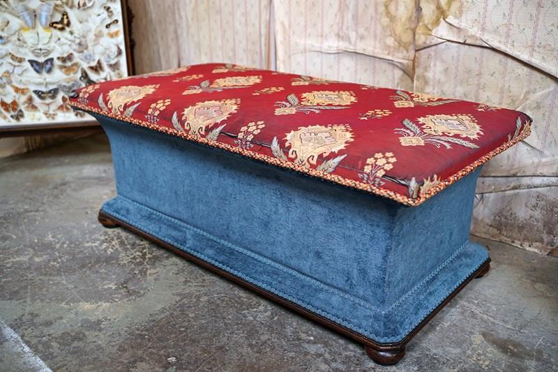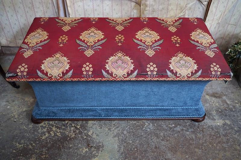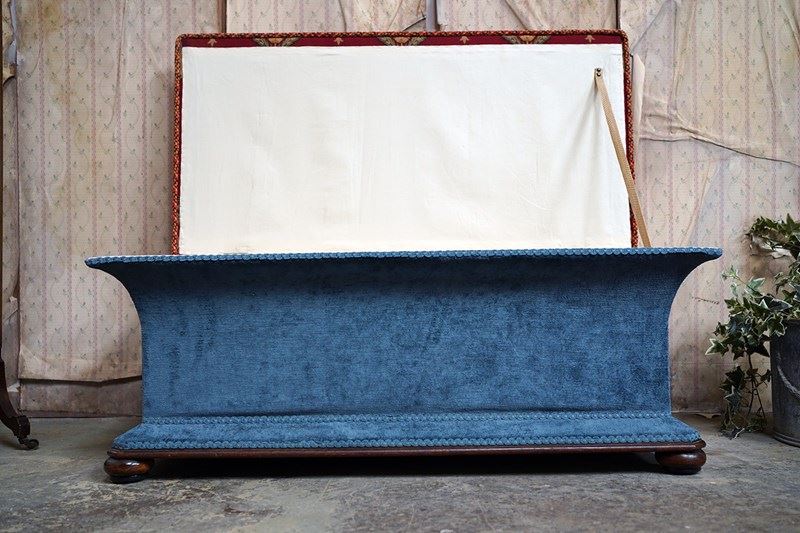 The large country house ottoman having a padded hinged lid covered with a fragment of Turkish ottoman brocade, the whole with concave sides in a plush teal blue to lower rail and flattened bun feet, the seat lid opening to reveal a vacant storage interior and a pale linen lined interior, and the whole surviving from early Victorian period England.