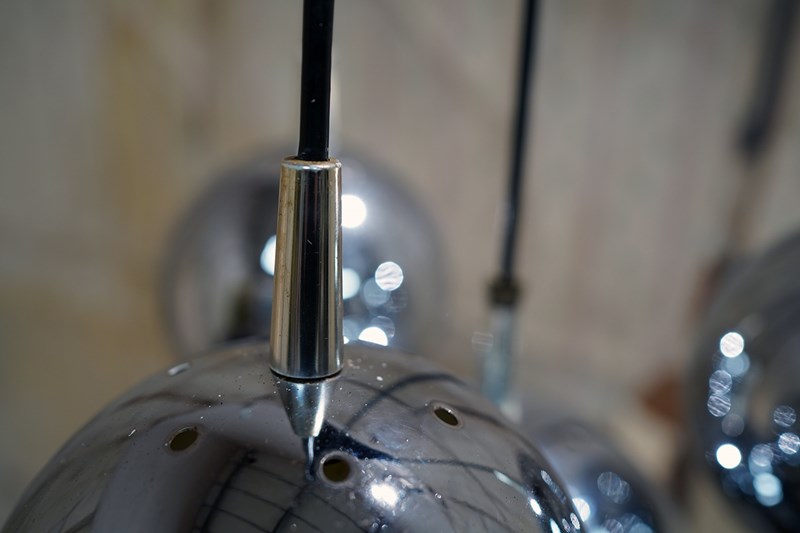 The steel eyeball hanging pendant, having the four original reflective spiral tiered steel globes with white matt painted interiors, the whole being wonderfully theatrical, each sphered suspended at graduated heights from a central canopy and pierced with discreet ventilation holes; the whole hanging from a gently arched black flex with chromed collars, very much in the style of Goffredo Reggiani, and surviving from the third quarter of twentieth century Italy.