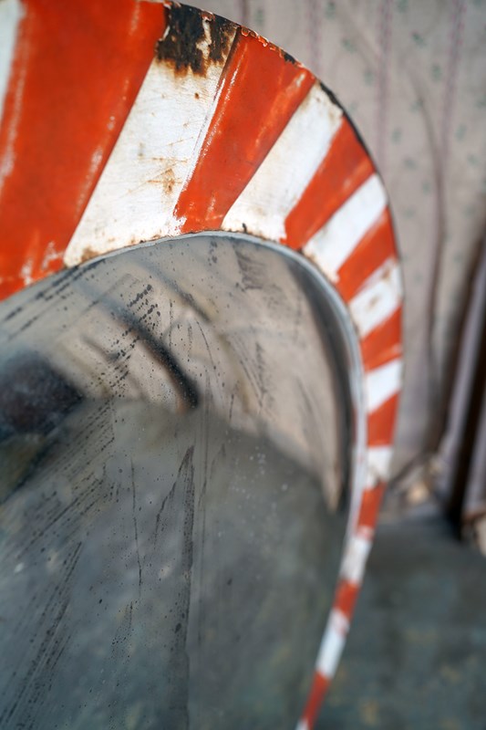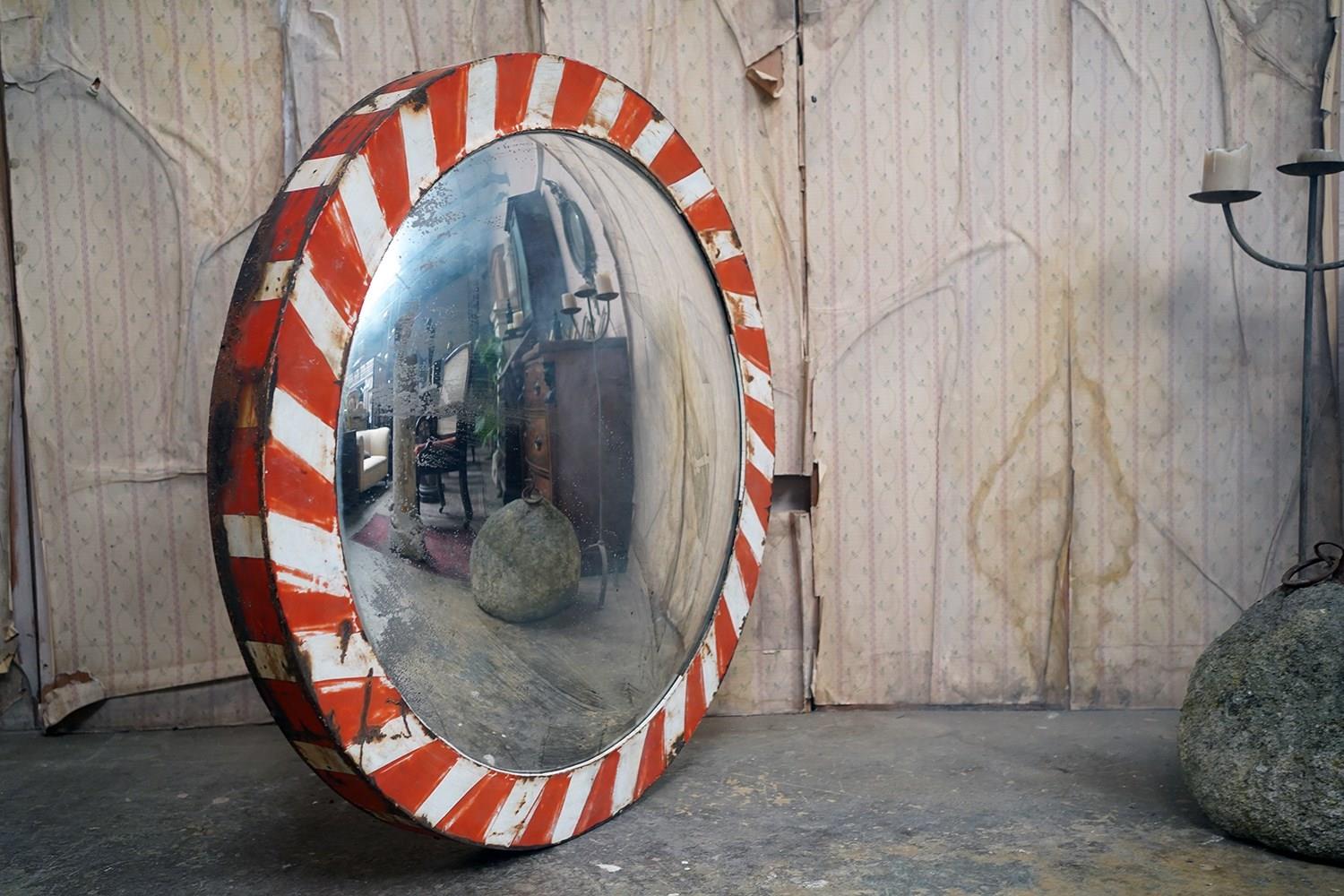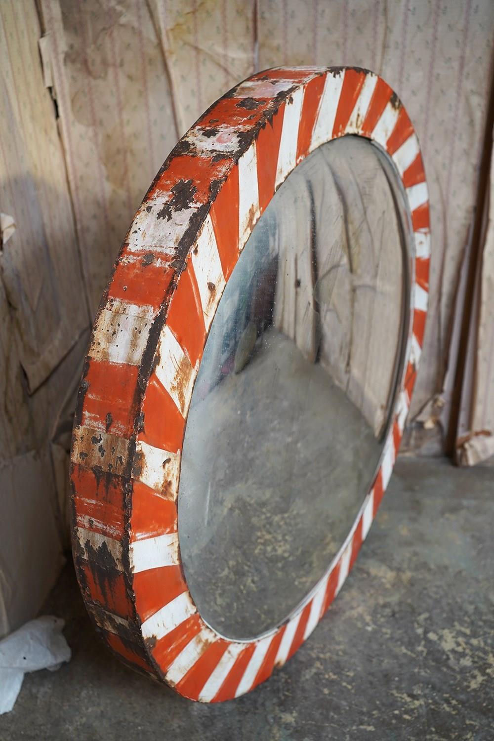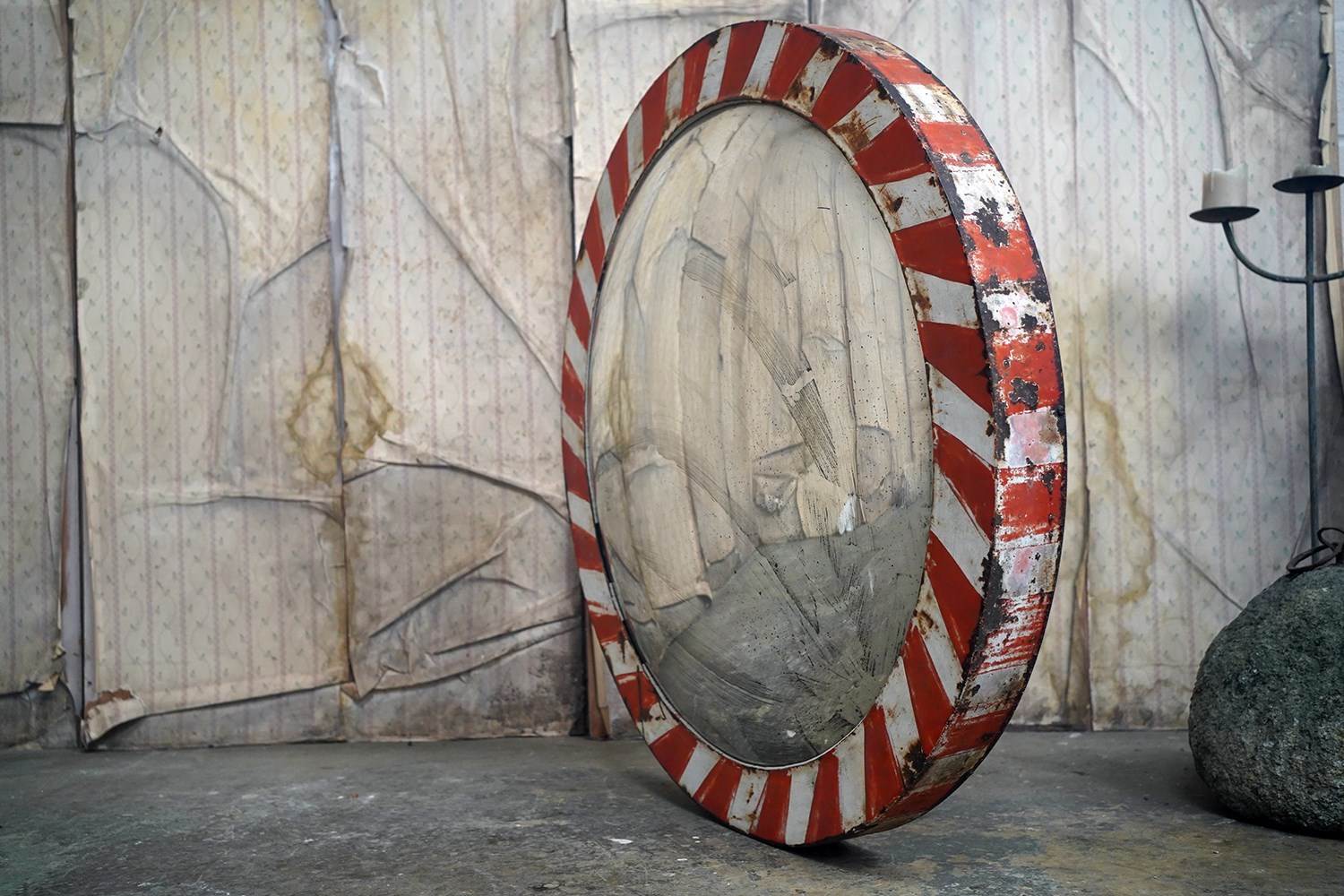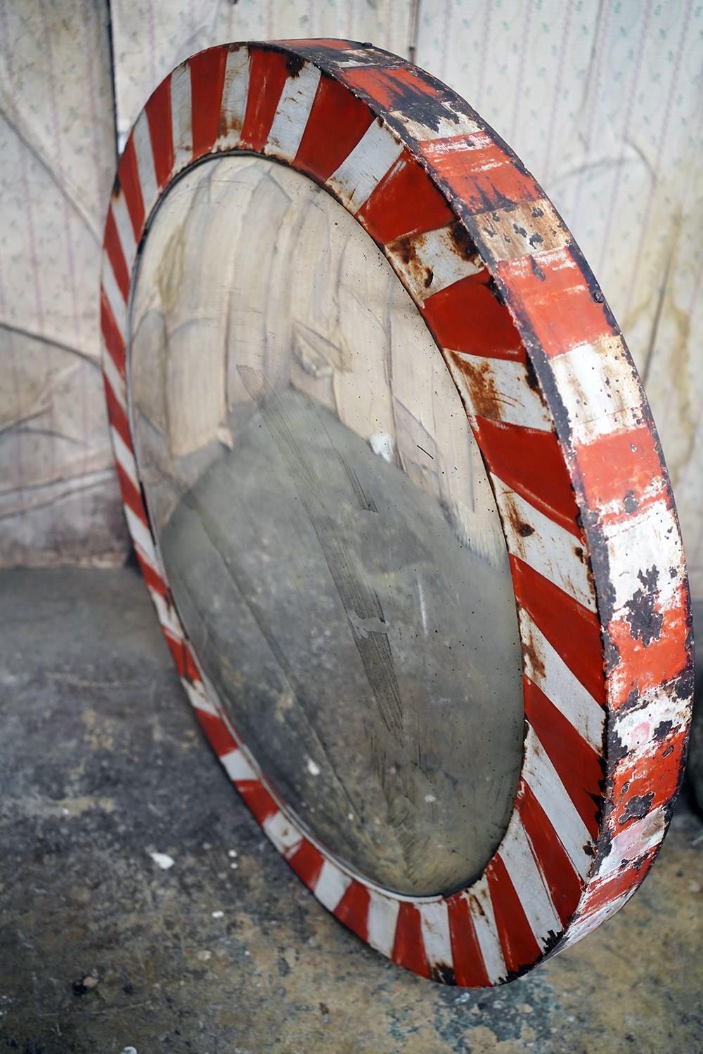 The large and very decorative circular railway or tram system mirror, nearing four feet in diameter, with wonderfully aged original glass, foxed and worn, to a red and white painted signalling frame and integral mount to the reverse, the whole surviving from the third quarter of twentieth century eastern Europe.