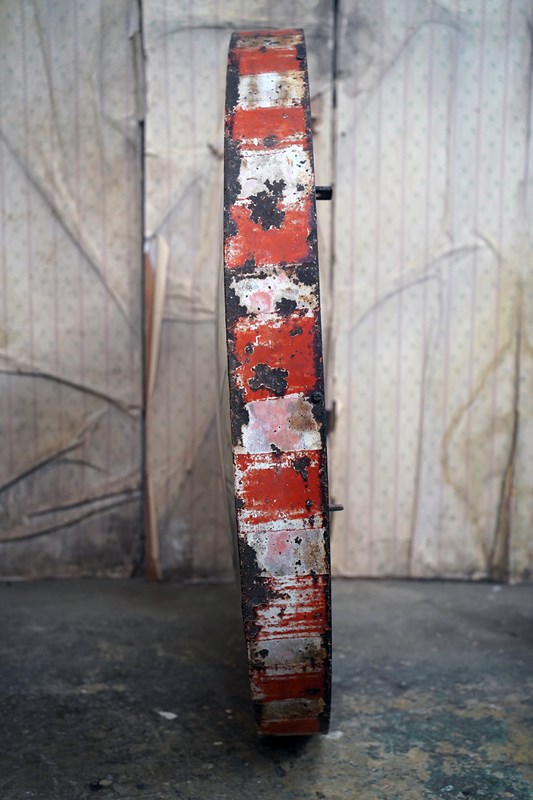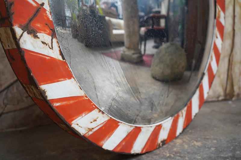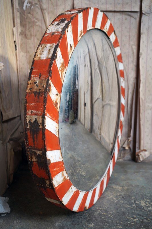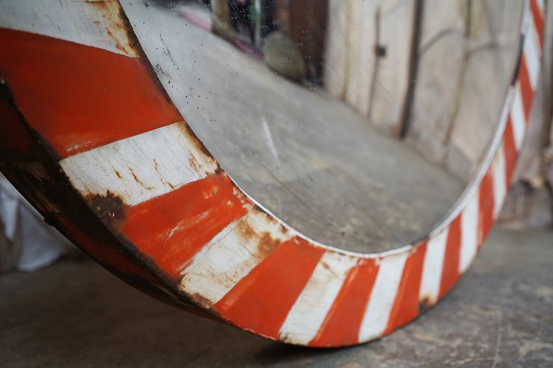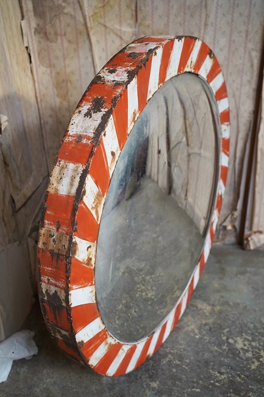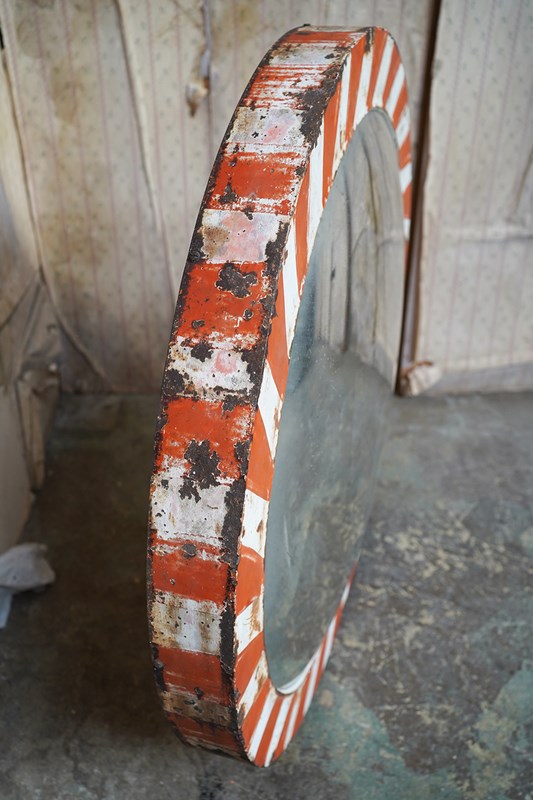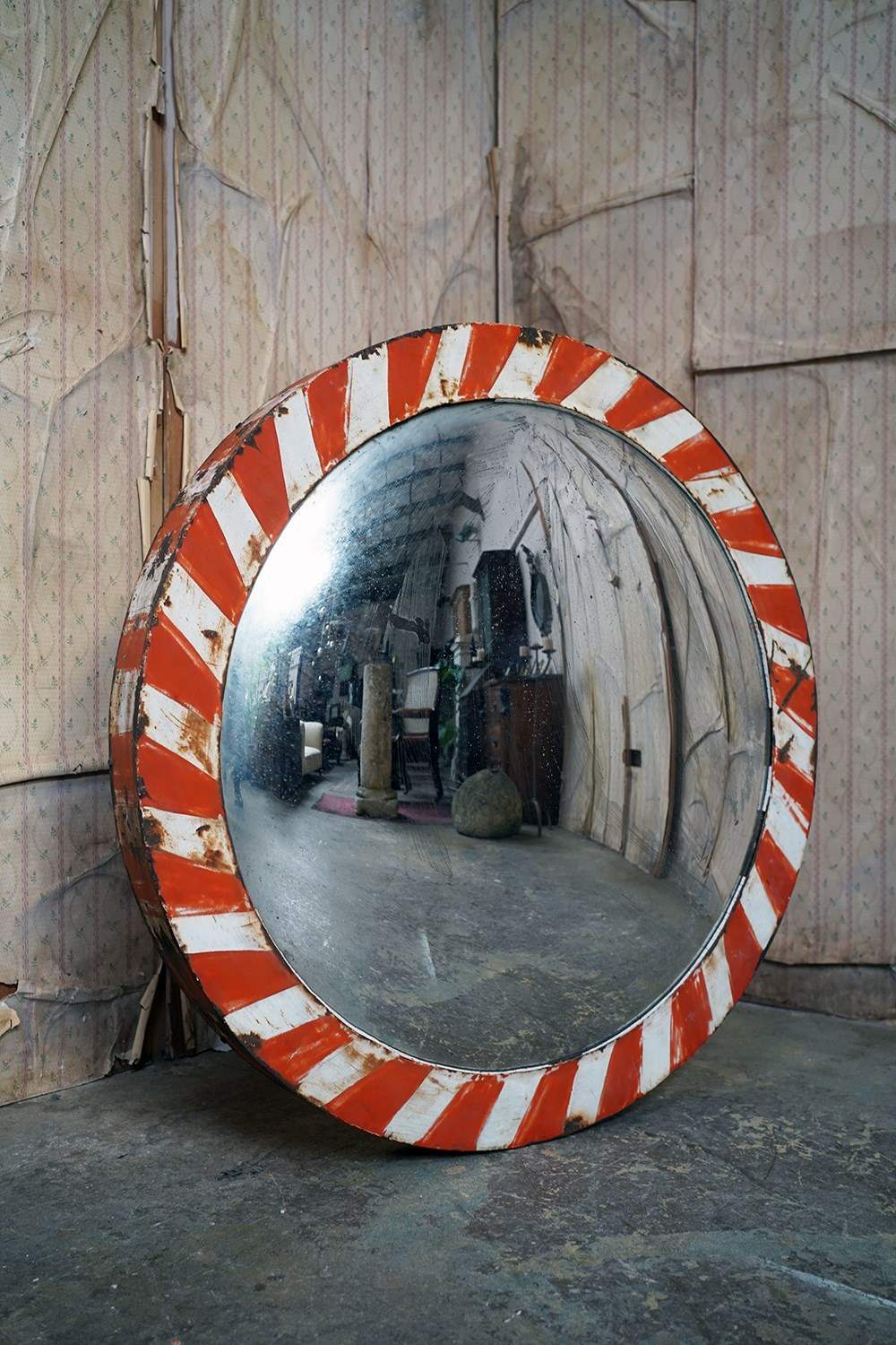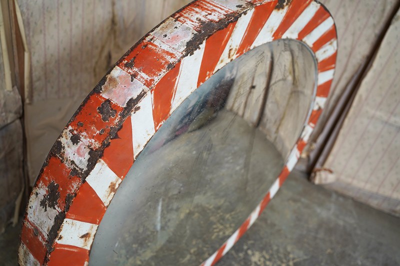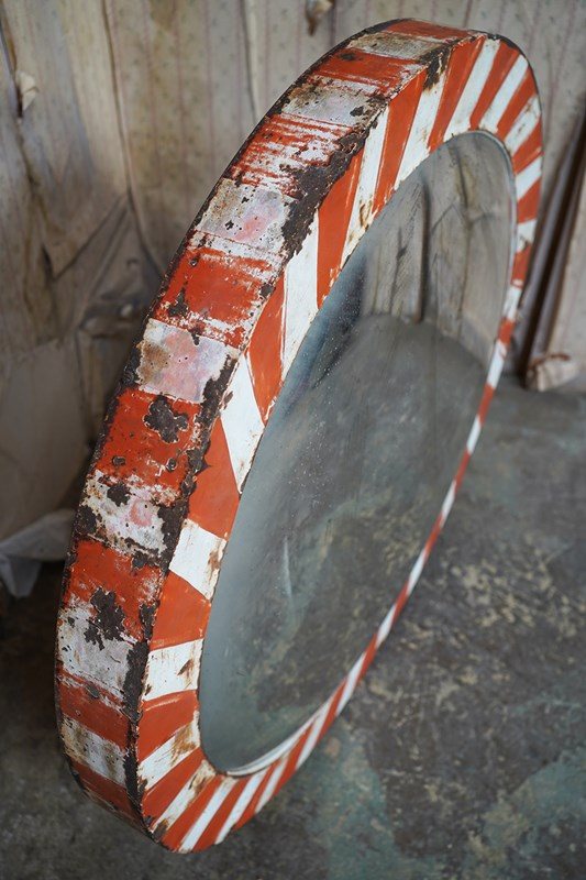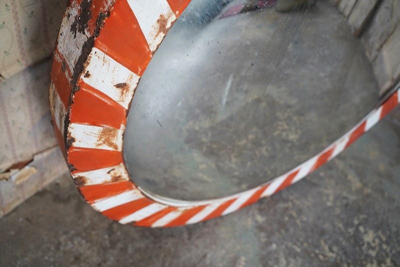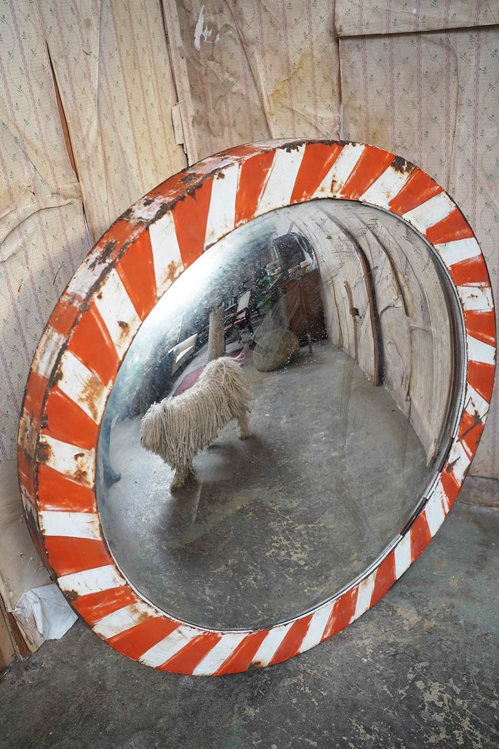 The large and very decorative circular railway or tram system mirror, nearing four feet in diameter, with wonderfully aged original glass, foxed and worn, to a red and white painted signalling frame and integral mount to the reverse, the whole surviving from the third quarter of twentieth century eastern Europe.