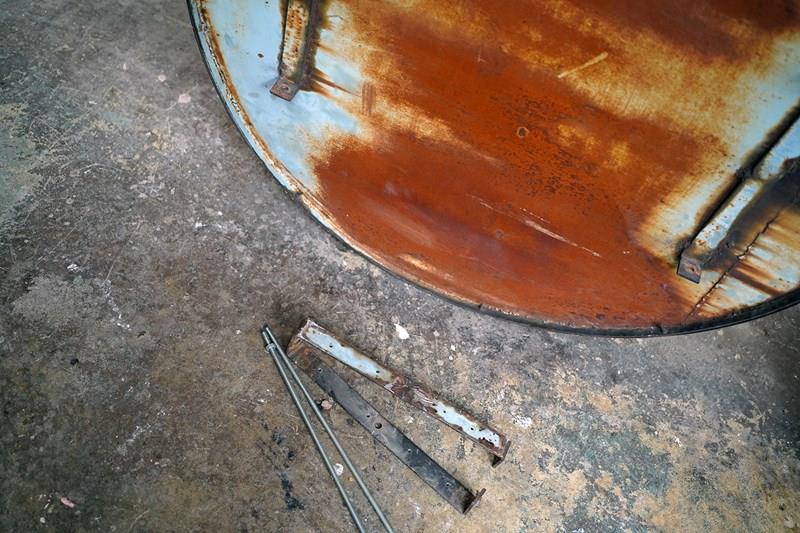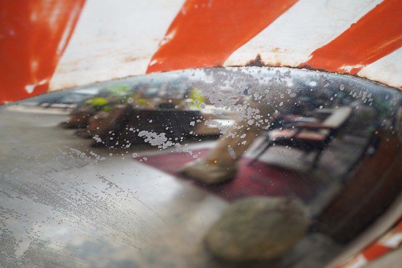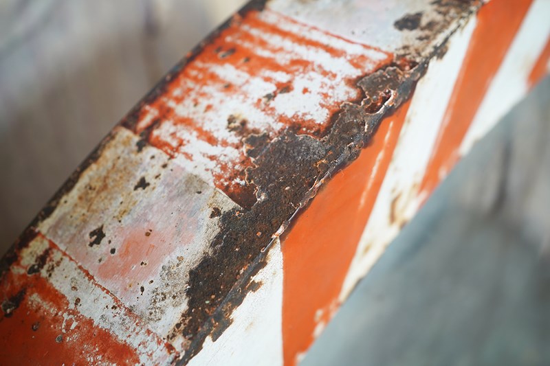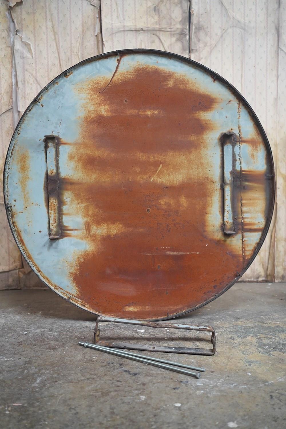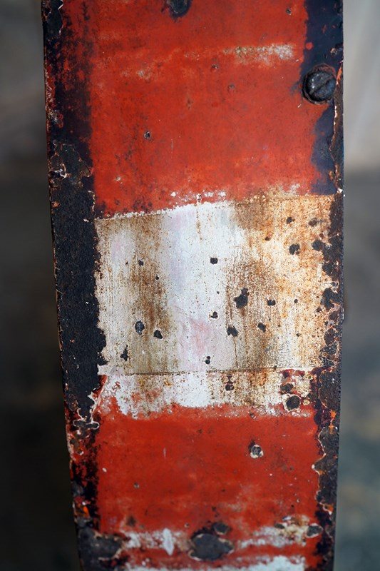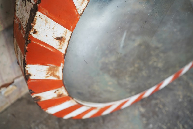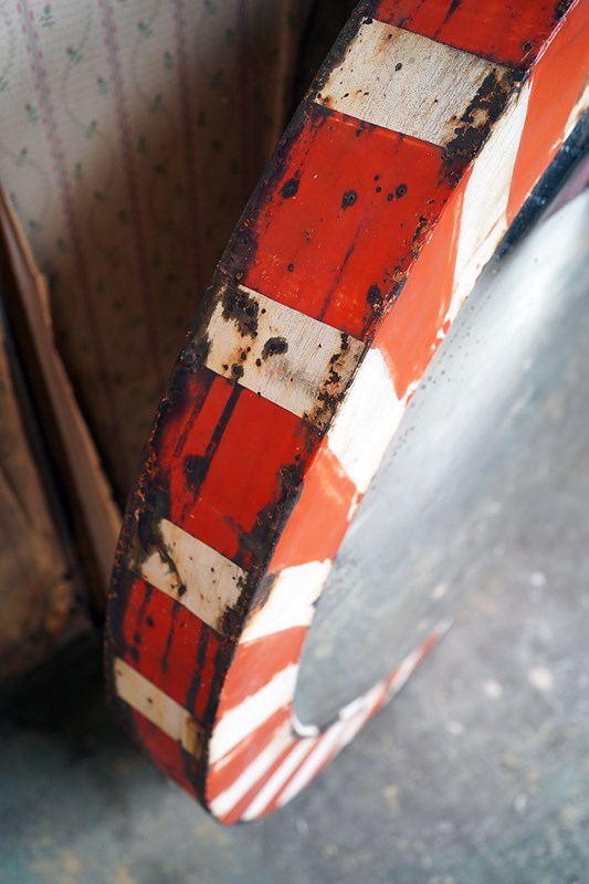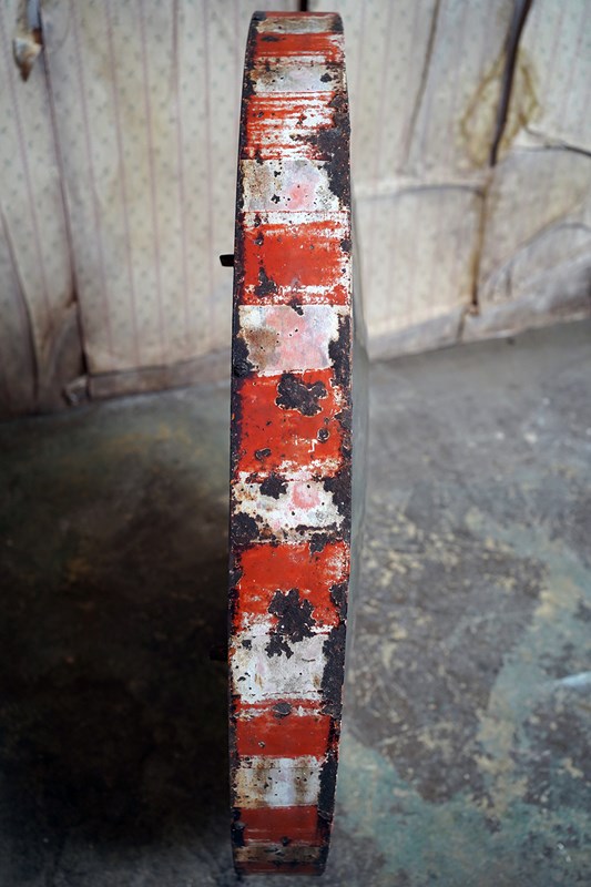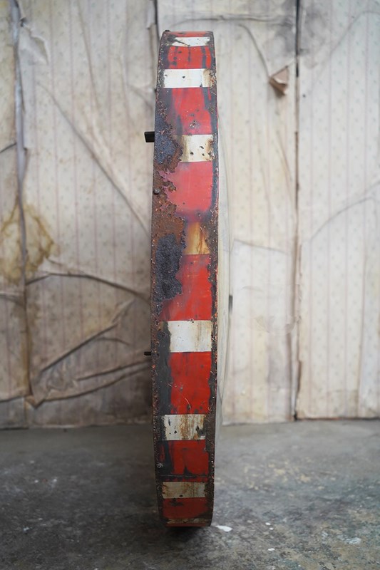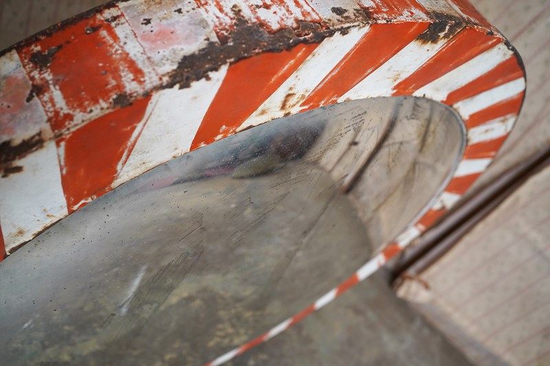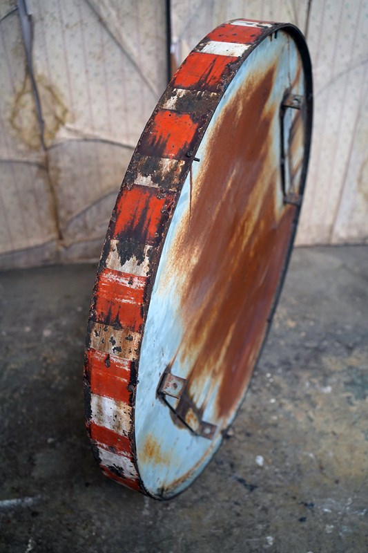 The large and very decorative circular railway or tram system mirror, nearing four feet in diameter, with wonderfully aged original glass, foxed and worn, to a red and white painted signalling frame and integral mount to the reverse, the whole surviving from the third quarter of twentieth century eastern Europe.
