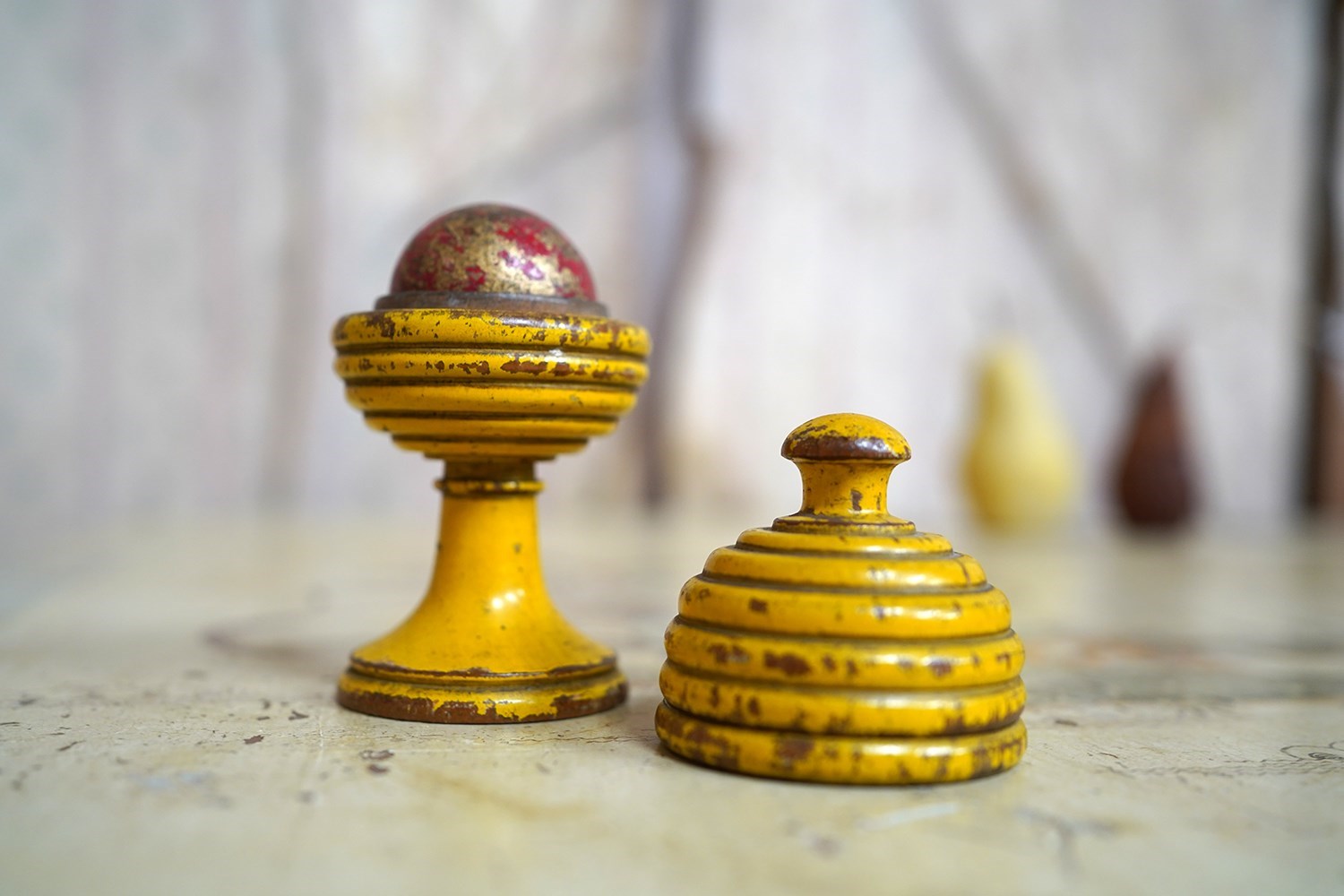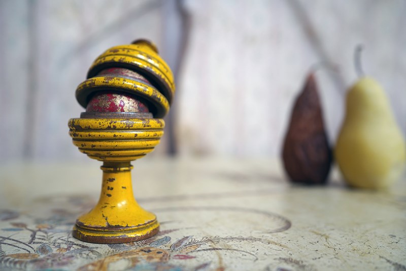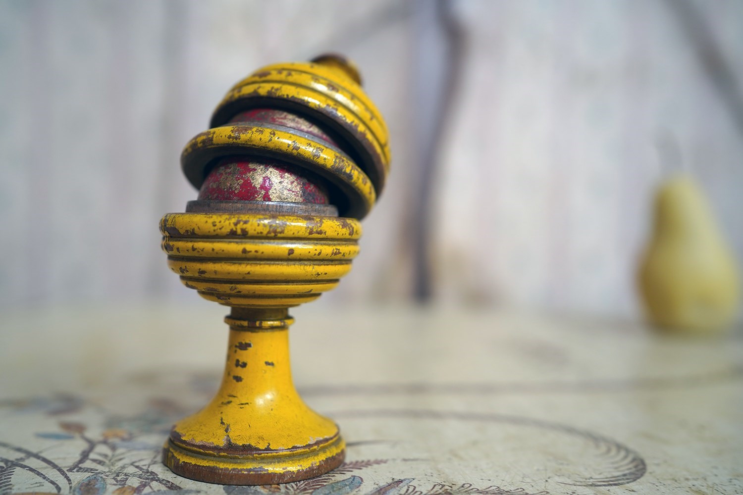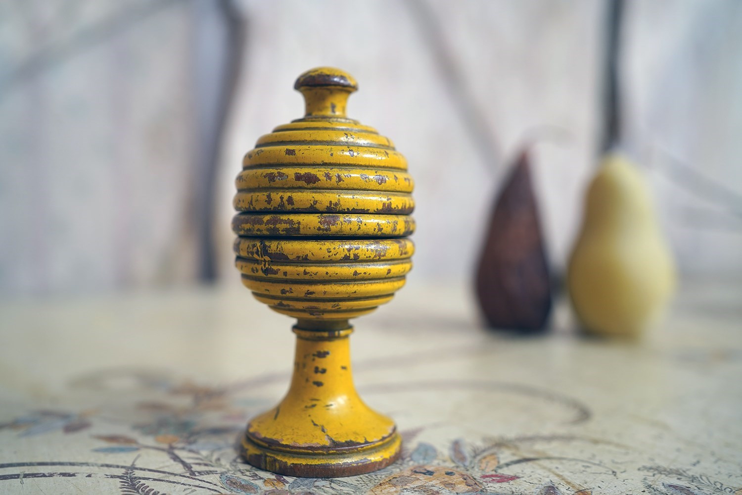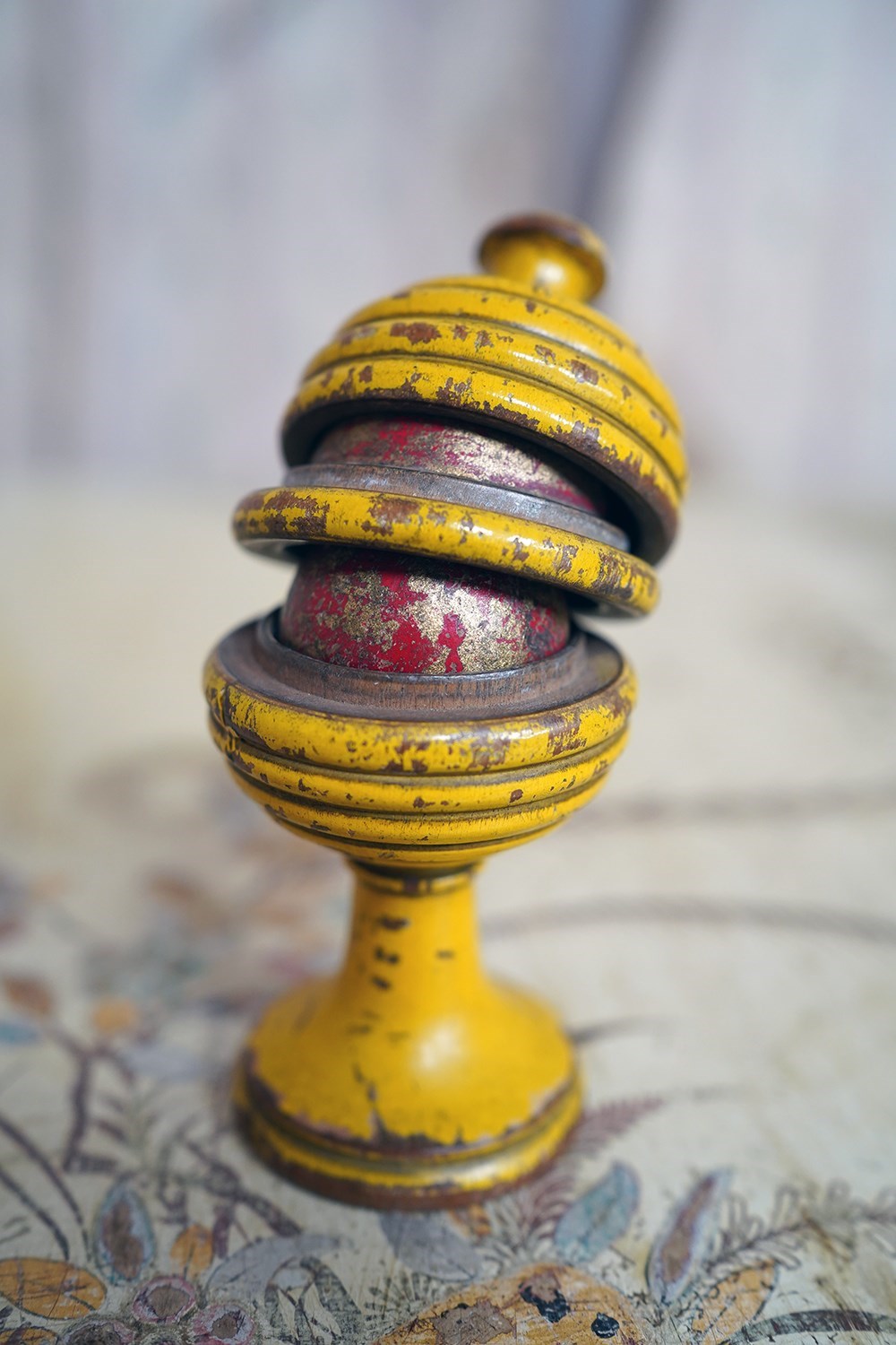 The delightful antique treen conjuring trick, formed as a turned wooden pedestal cup being bee-hive turned to a knop finial, painted in vibrant yellow, to a pressed metal interior concealing a red internal ball which appears and disappears through sleight-of-hand mechanics, whilst the second interior houses the half red painted ball; the whole with a wonderful sculptural and decorative quality and surviving from the zeniths of the nineteenth century.