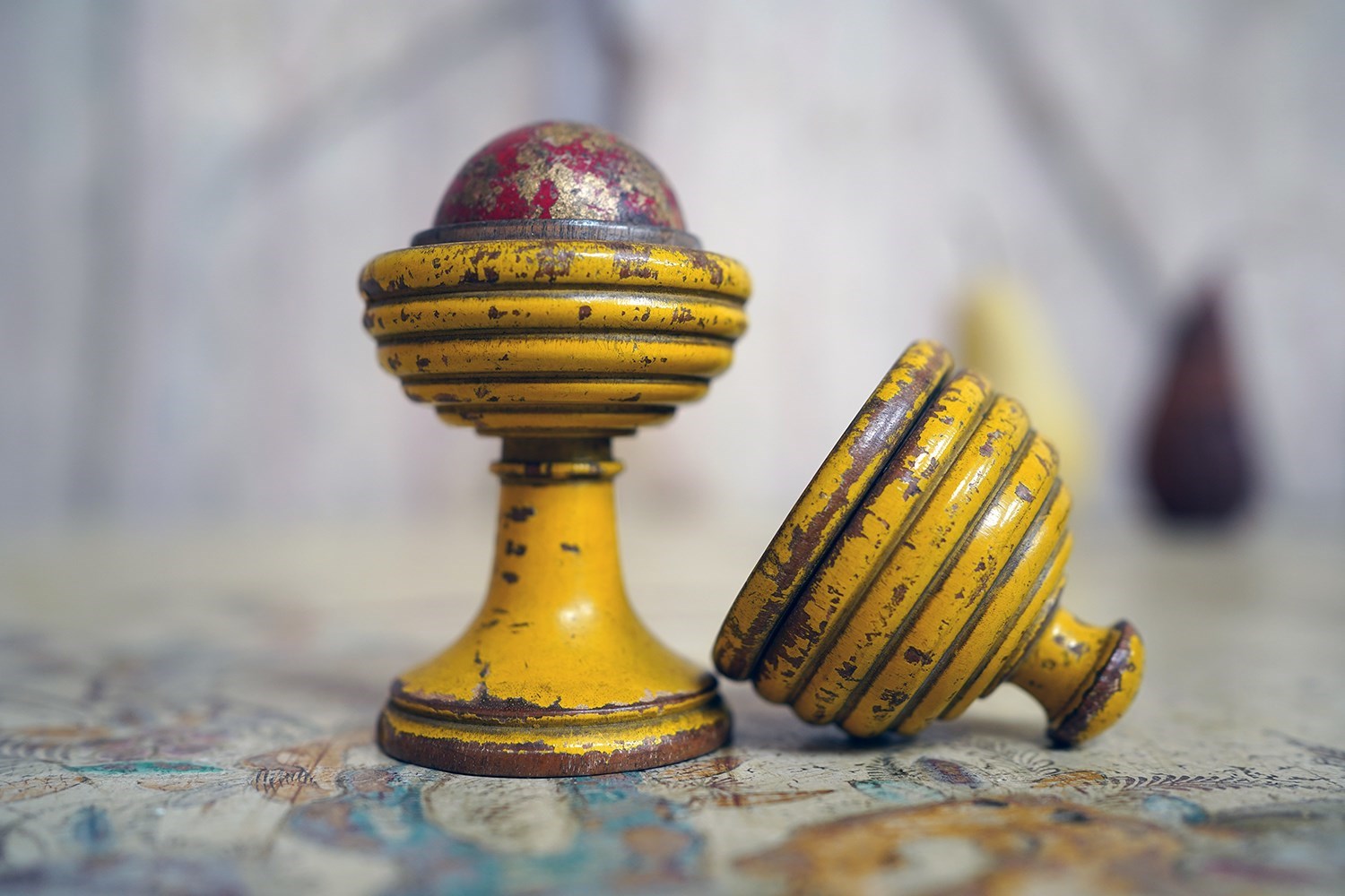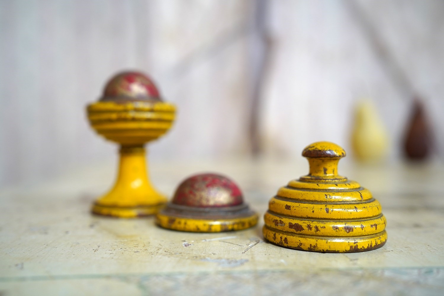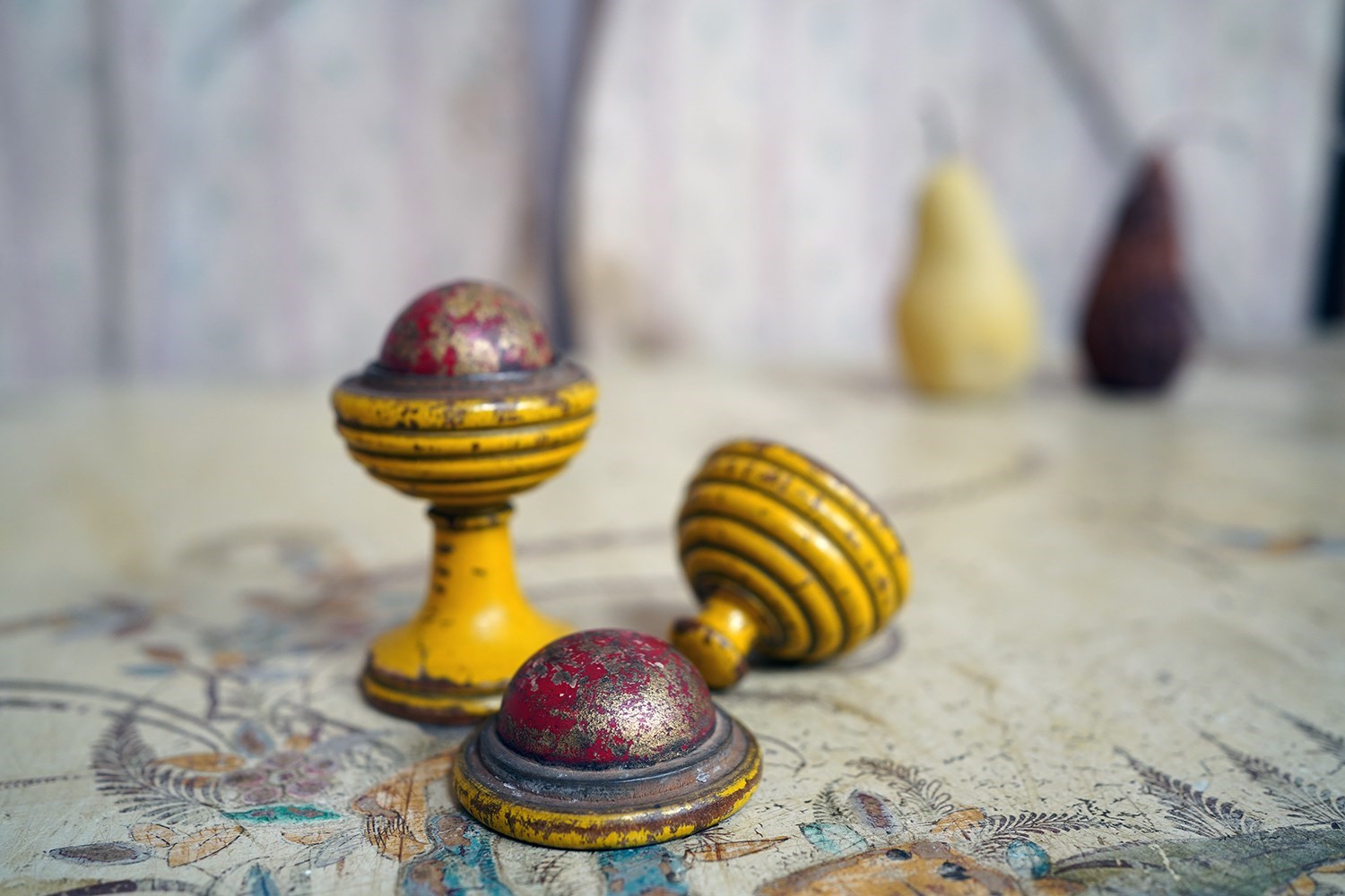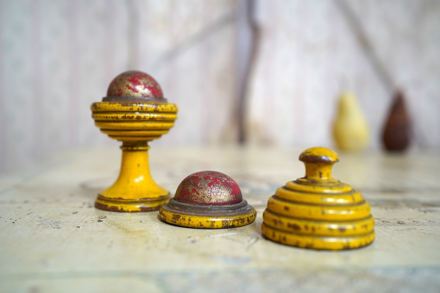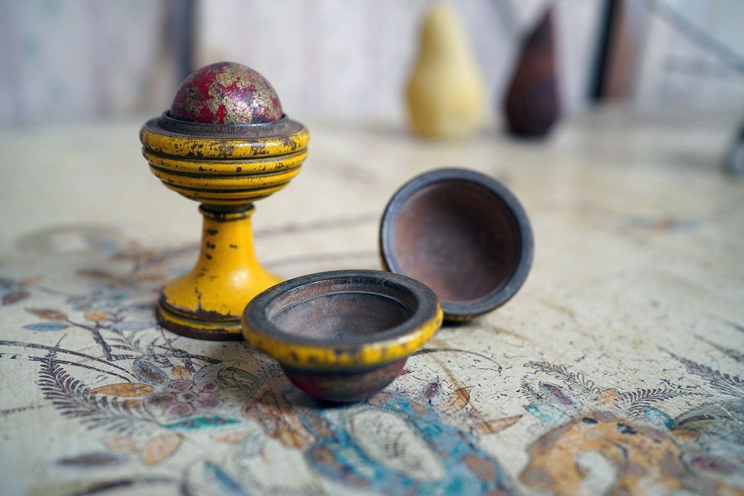 The delightful antique treen conjuring trick, formed as a turned wooden pedestal cup being bee-hive turned to a knop finial, painted in vibrant yellow, to a pressed metal interior concealing a red internal ball which appears and disappears through sleight-of-hand mechanics, whilst the second interior houses the half red painted ball; the whole with a wonderful sculptural and decorative quality and surviving from the zeniths of the nineteenth century.