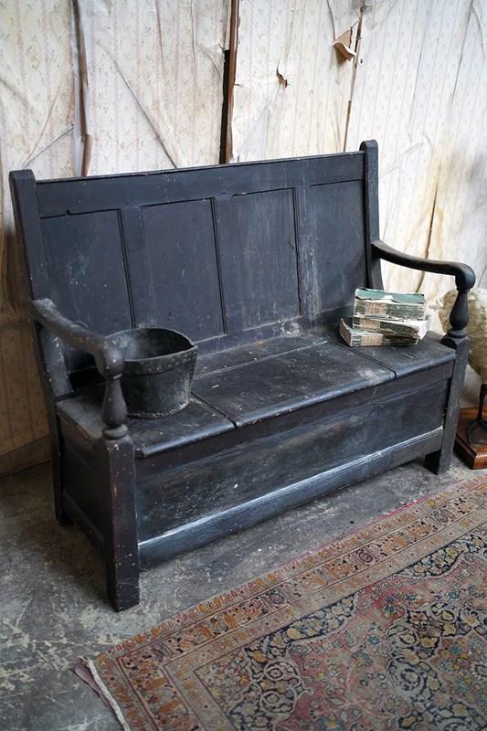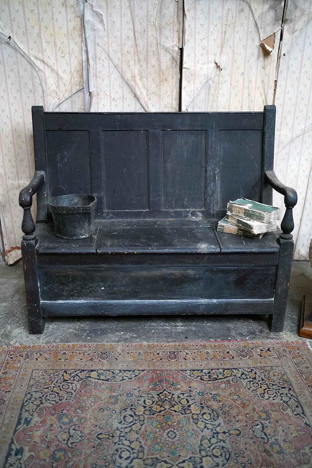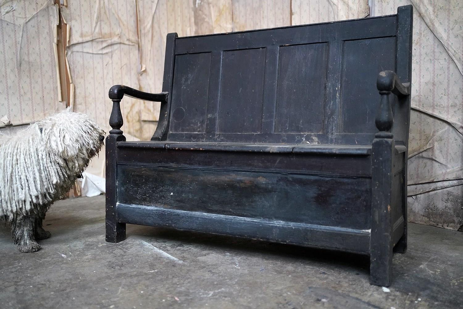 The box hall settle showing a textured black painted pine carcass in the wonderful original paint worn thoroughly and consistently with age, having open scrolled arm rests and a low four panelled back, raised on rectangular supports, the middle seat opening to reveal a useful compartmentalised storage area and the whole surviving from the last quarter of nineteenth century Britain, and possibly Wales.