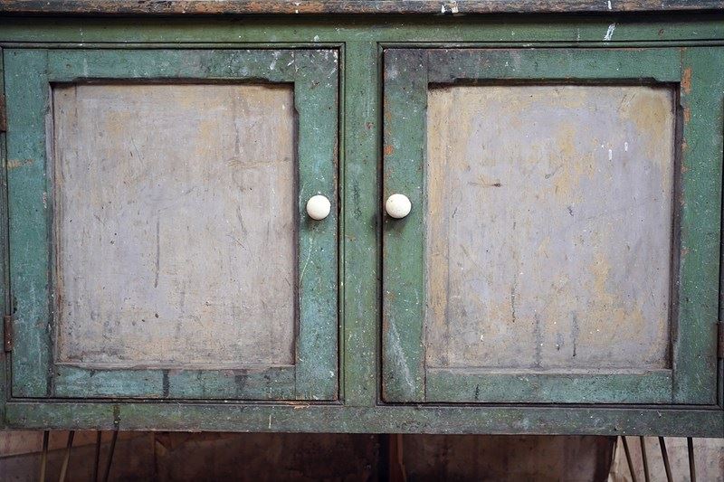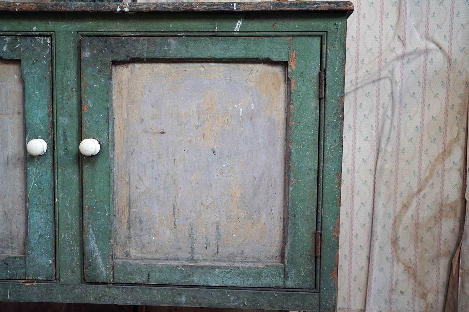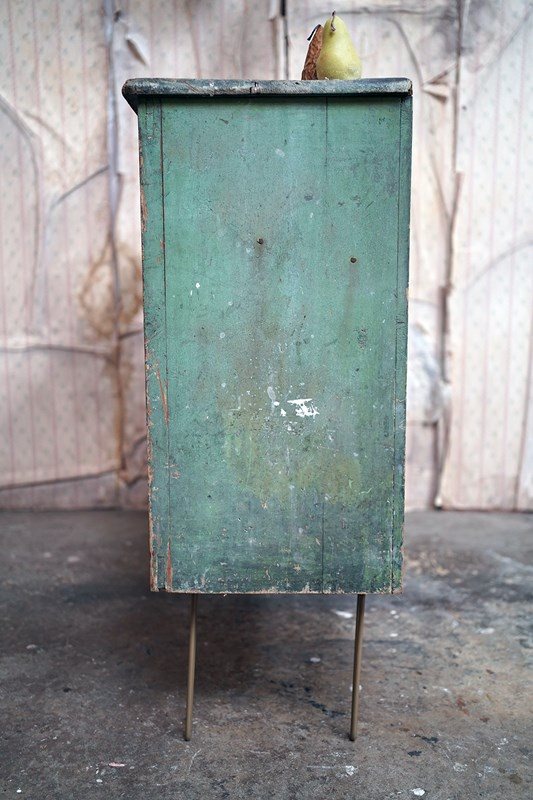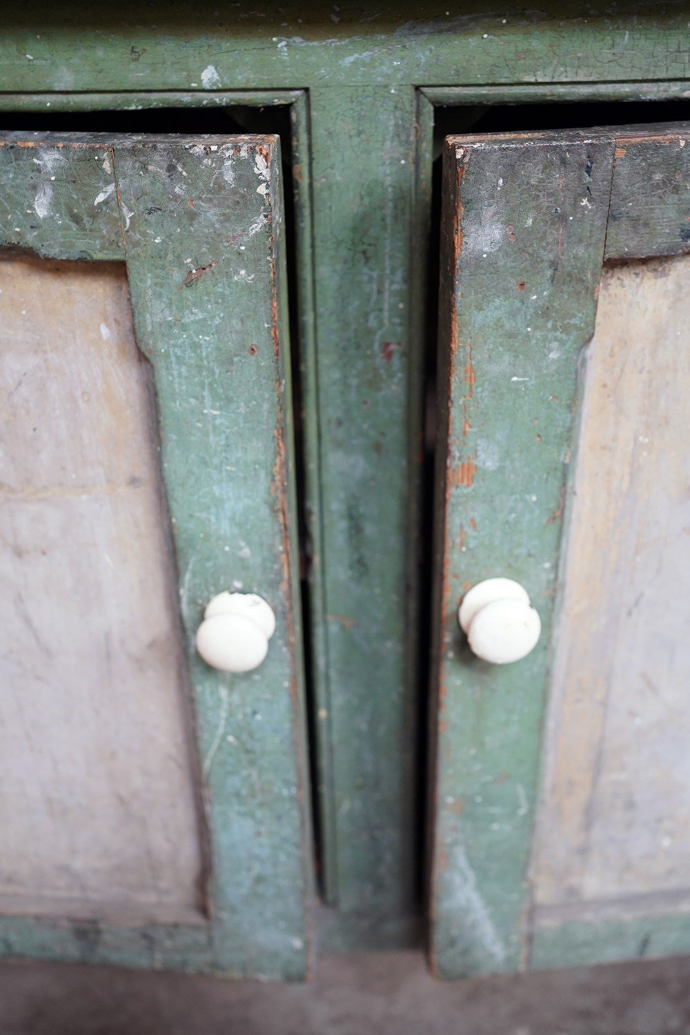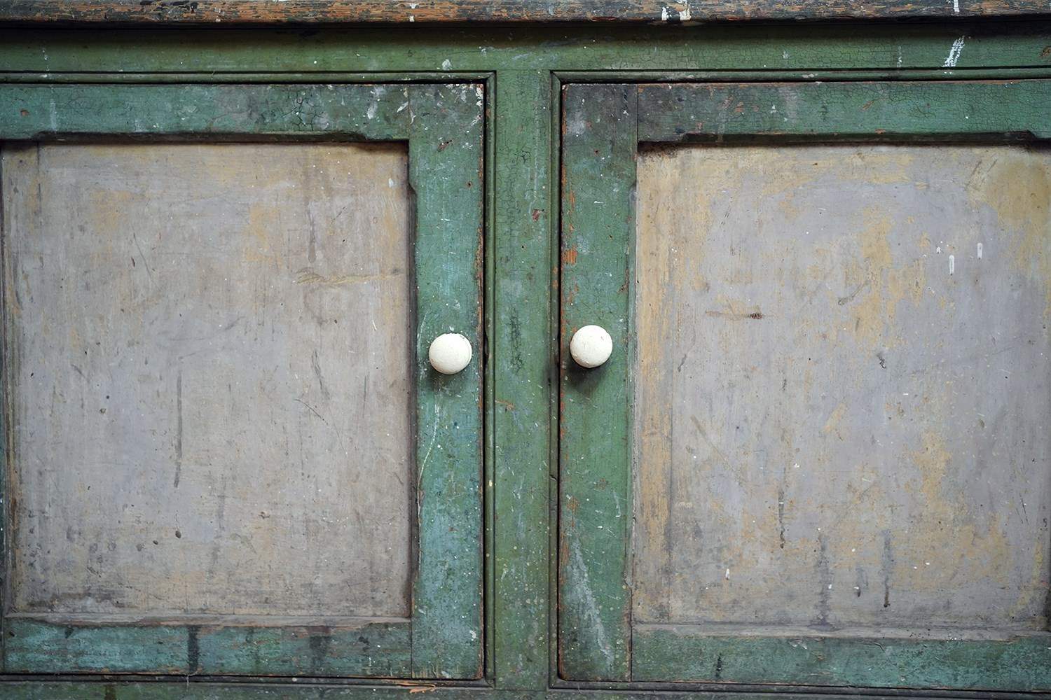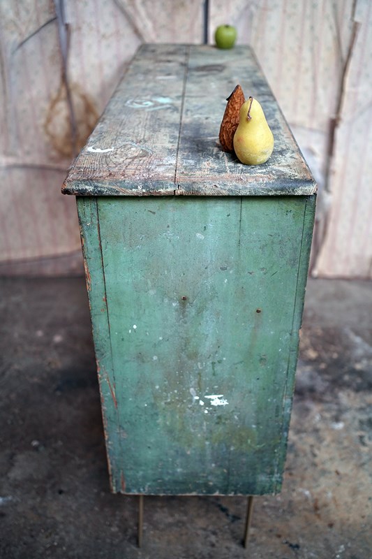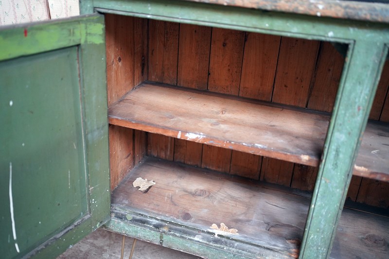The condition is appropriately rustic and entirely in keeping with its character. The painted surface shows age, abrasions and areas of wear throughout, all contributing to its appeal rather than detracting from it. The interior is plain and functional with fixed shelving. The white painted knob handles are later replacements, though remain in keeping, whilst the top bears the expected scuffs and marks of a working life; a surface that tells its story without apology.