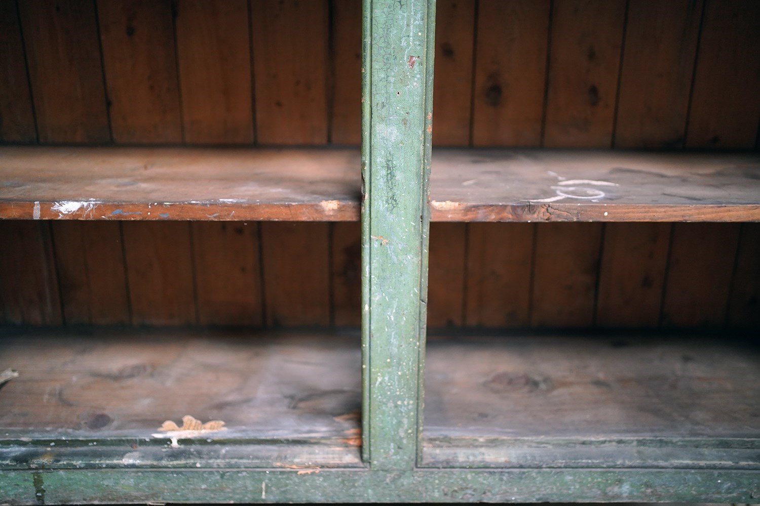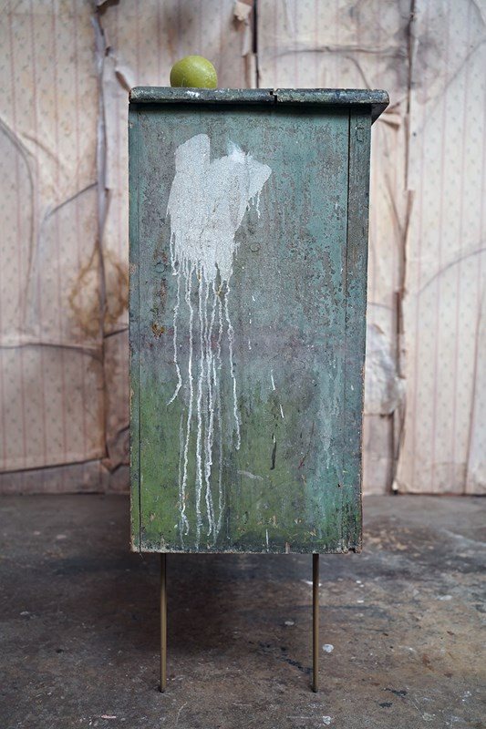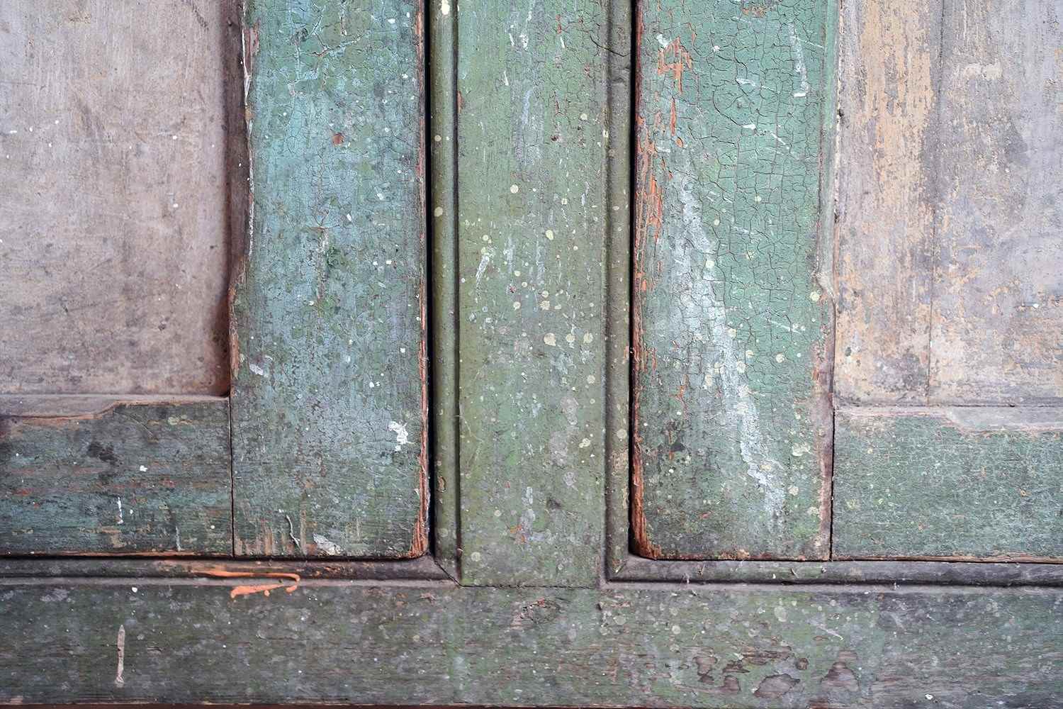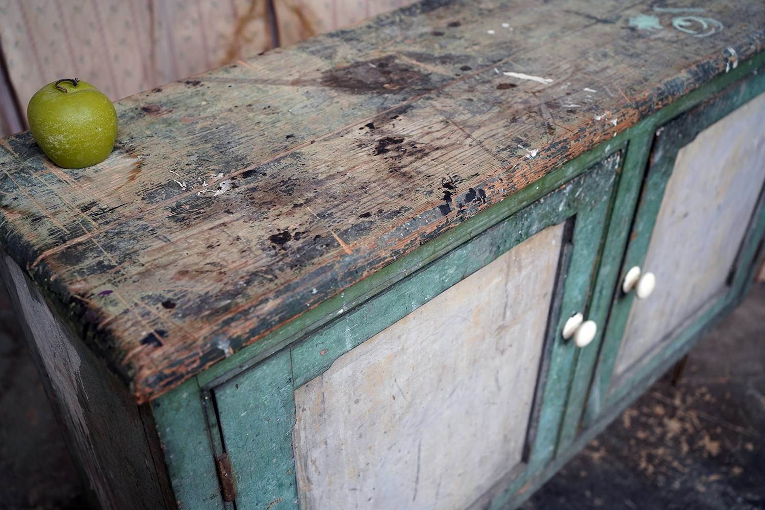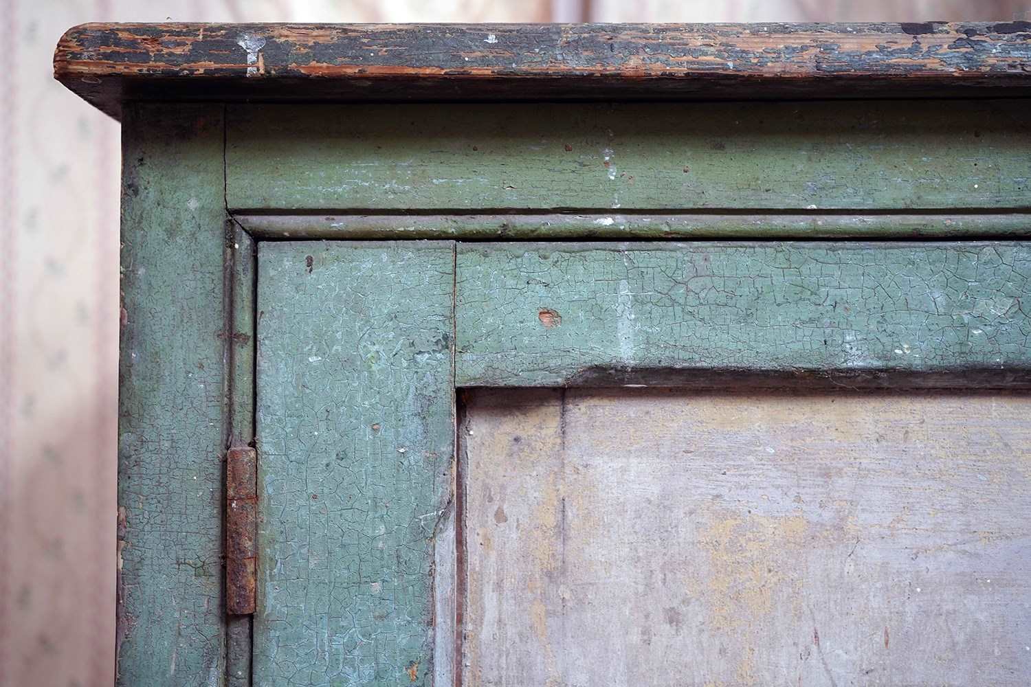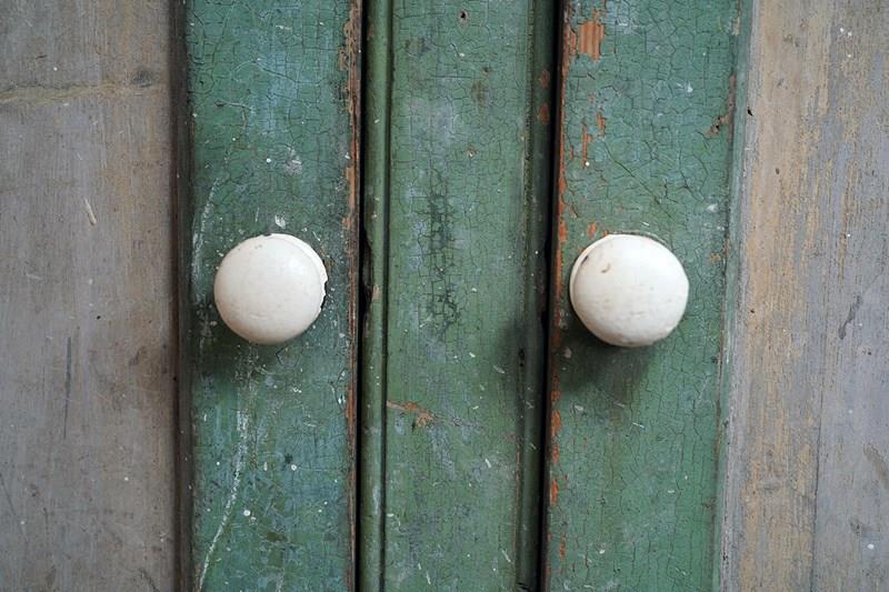 The condition is appropriately rustic and entirely in keeping with its character. The painted surface shows age, abrasions and areas of wear throughout, all contributing to its appeal rather than detracting from it. The interior is plain and functional with fixed shelving. The white painted knob handles are later replacements, though remain in keeping, whilst the top bears the expected scuffs and marks of a working life; a surface that tells its story without apology.